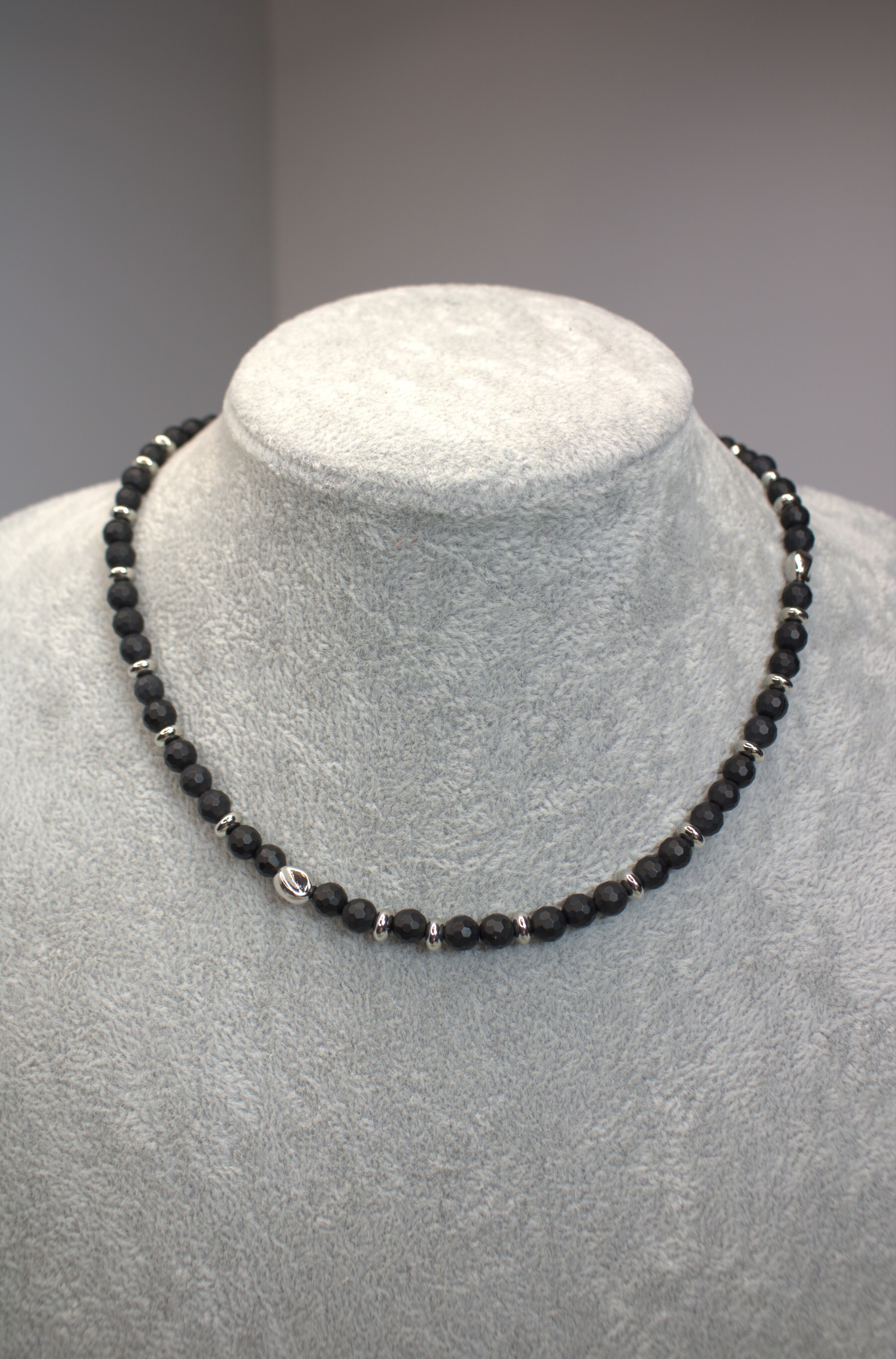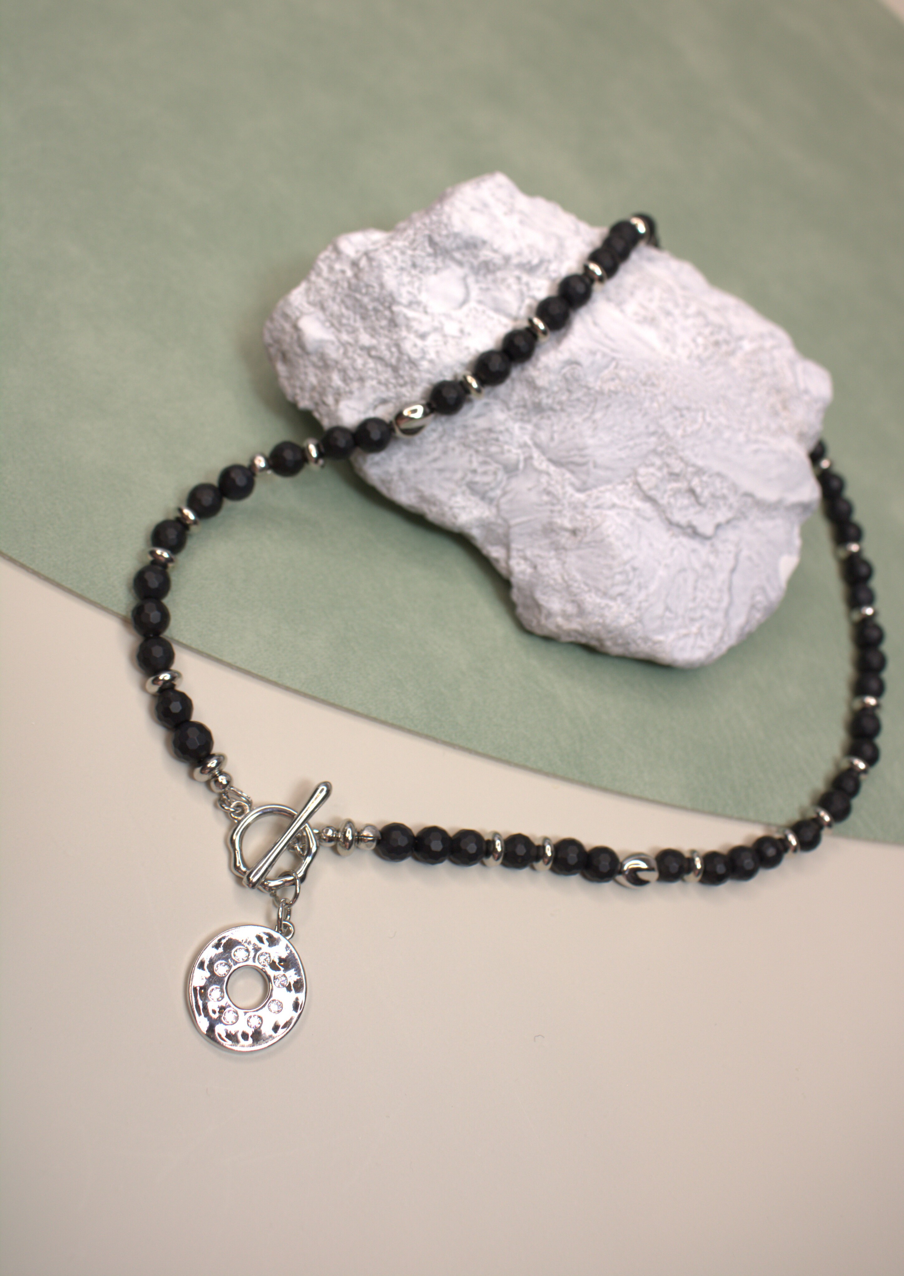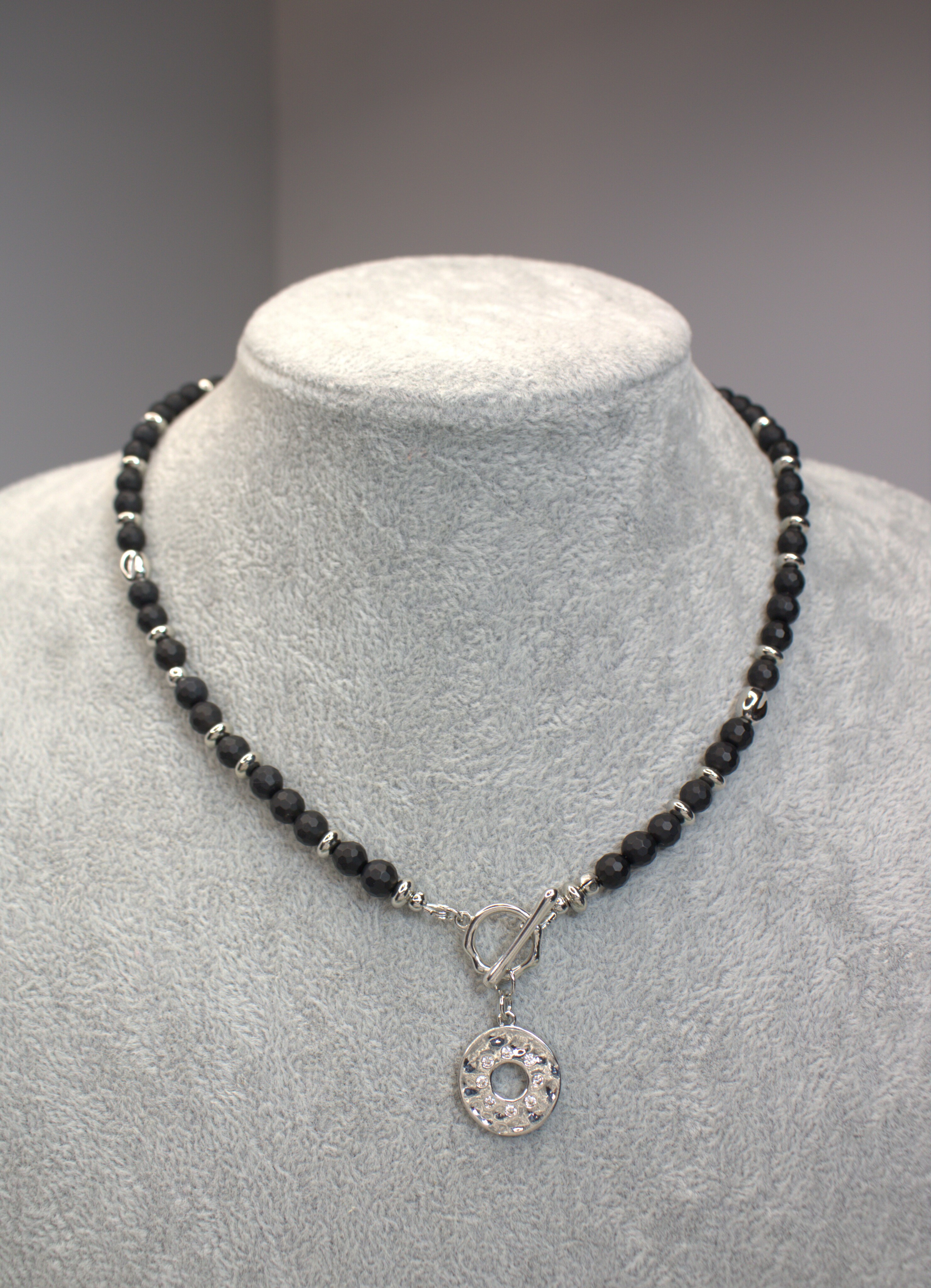 Строгое и тактильное колье из матового агата — украшение, которое работает и как стиль, и как символ. Мягко рассеянный свет внутри гранёных бусин создаёт эффект глубины, а монетка-талисман притягивает взгляд и собирает изделие в один характерный акцент.