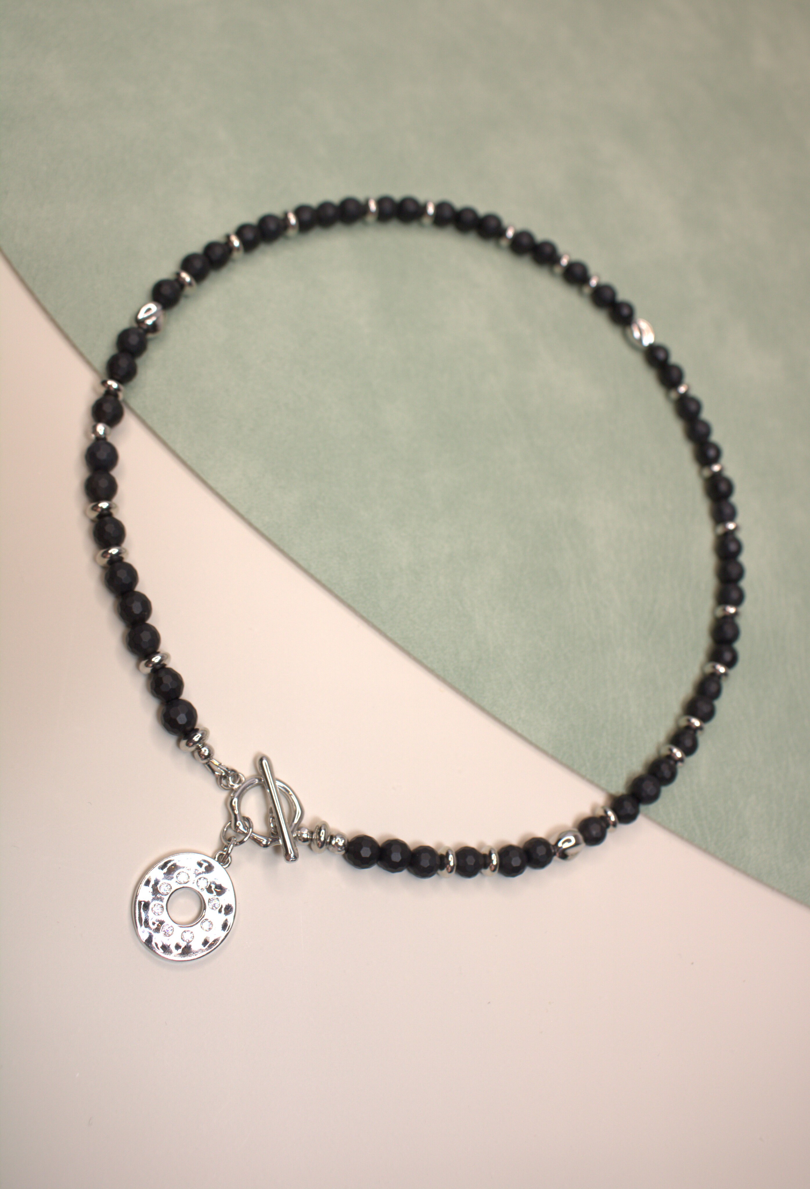 Матовый гранёный агат 6 мм, замок тоггл, центральный элемент — монетка с отверстием и инкрустацией фианитами.