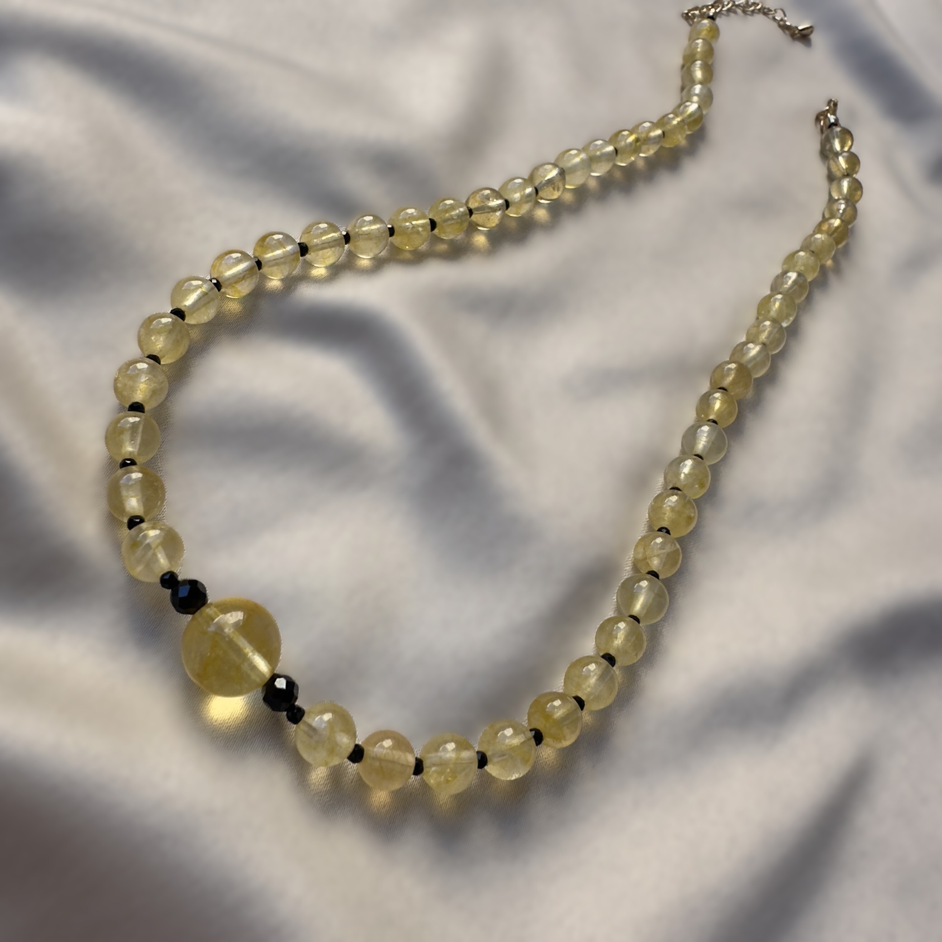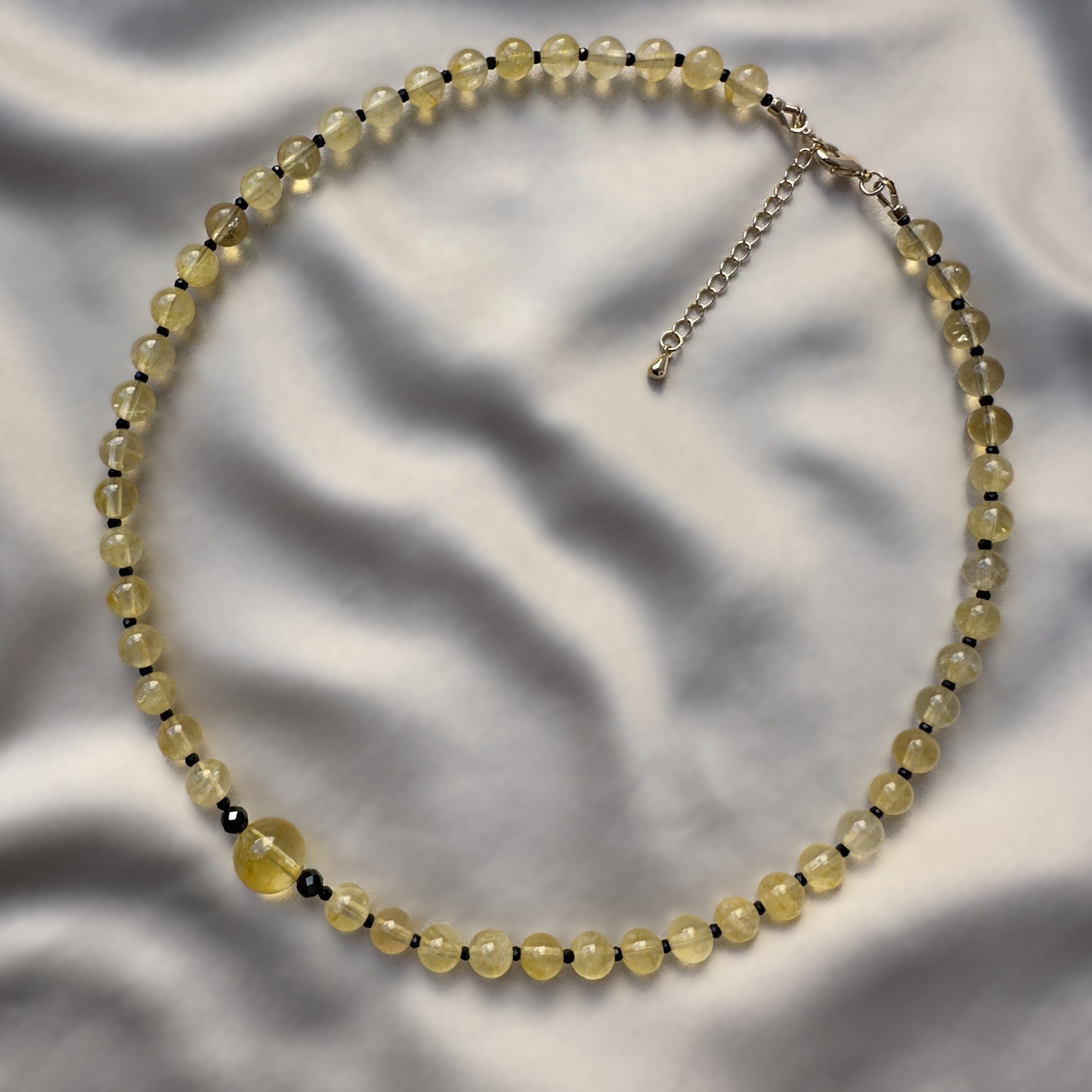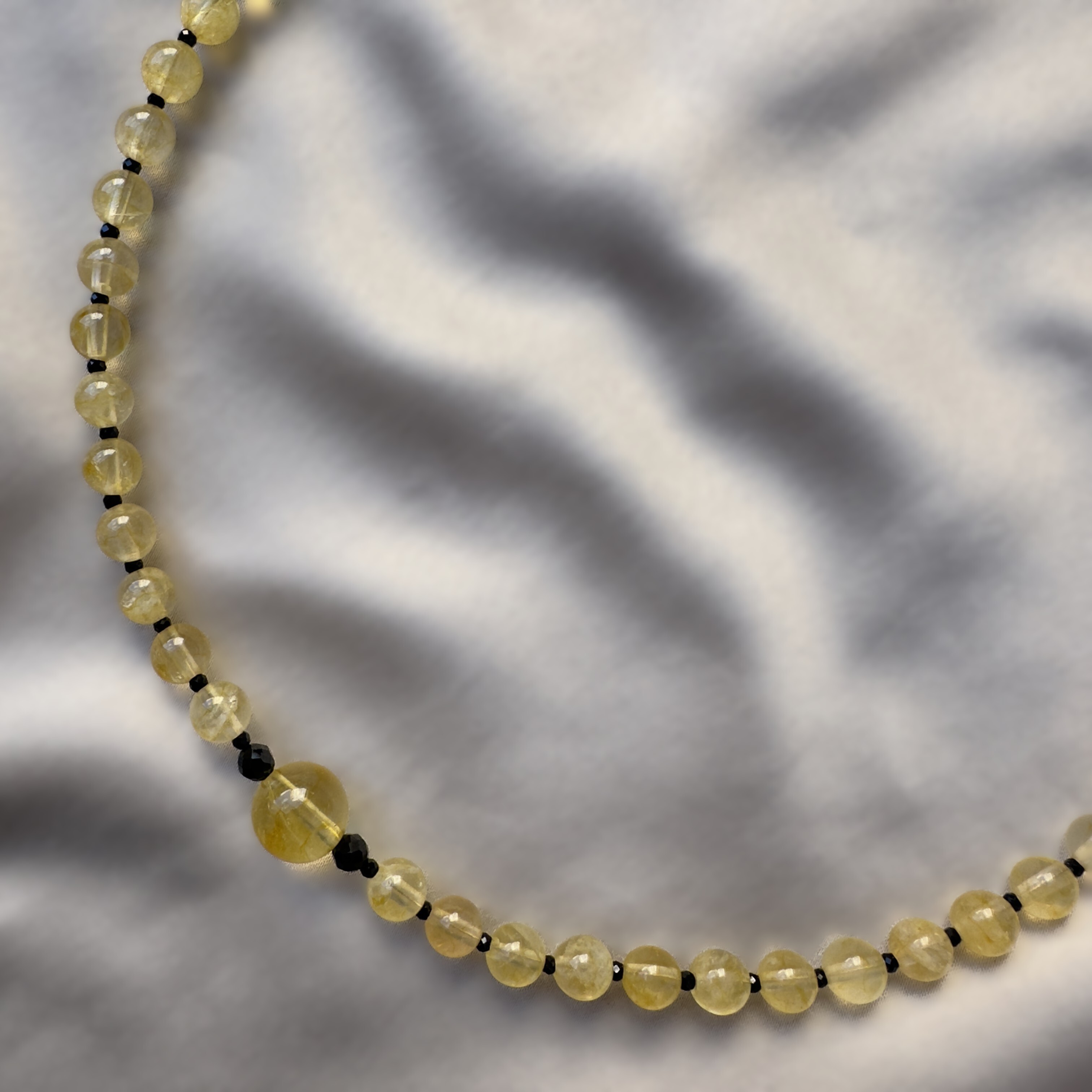 Состав и размеры: натуральный цитрин (шары 6–8 мм, центральная бусина 10 мм); огранённая чёрная шпинель-спейсеры 2 и 4 мм; фурнитура премиум (Корея), цвет золота; длина 40–45 см (удлинитель 5 см); замок-карабин; сборка на ювелирном тросике.
