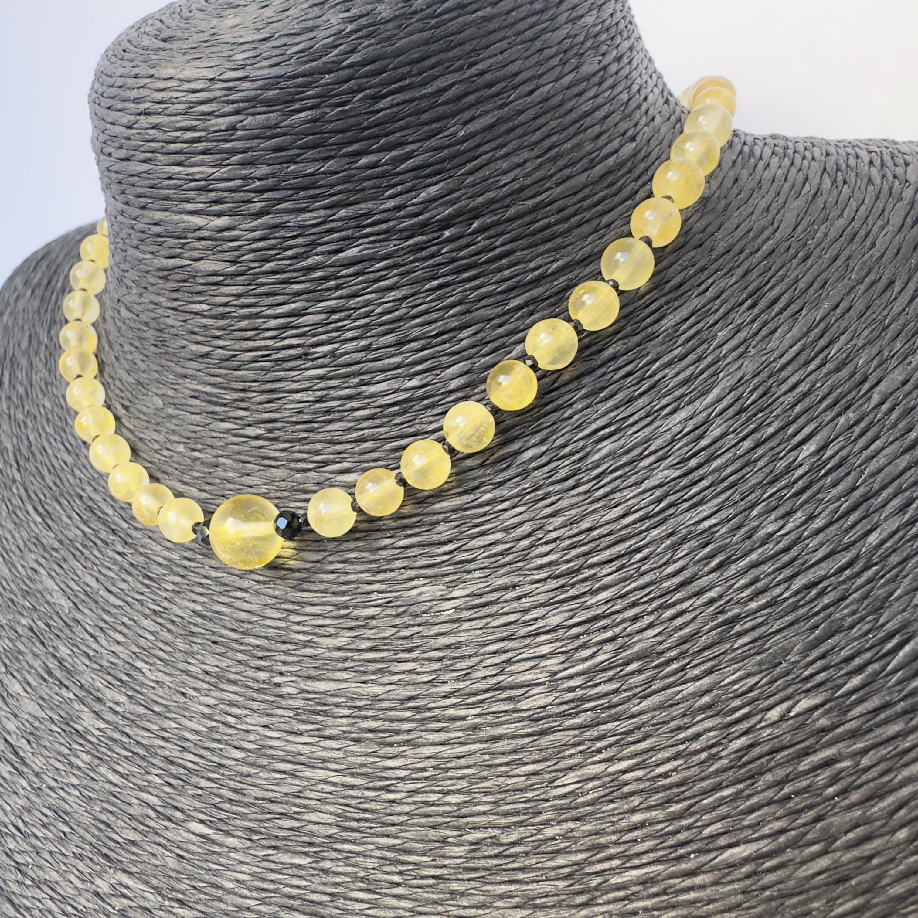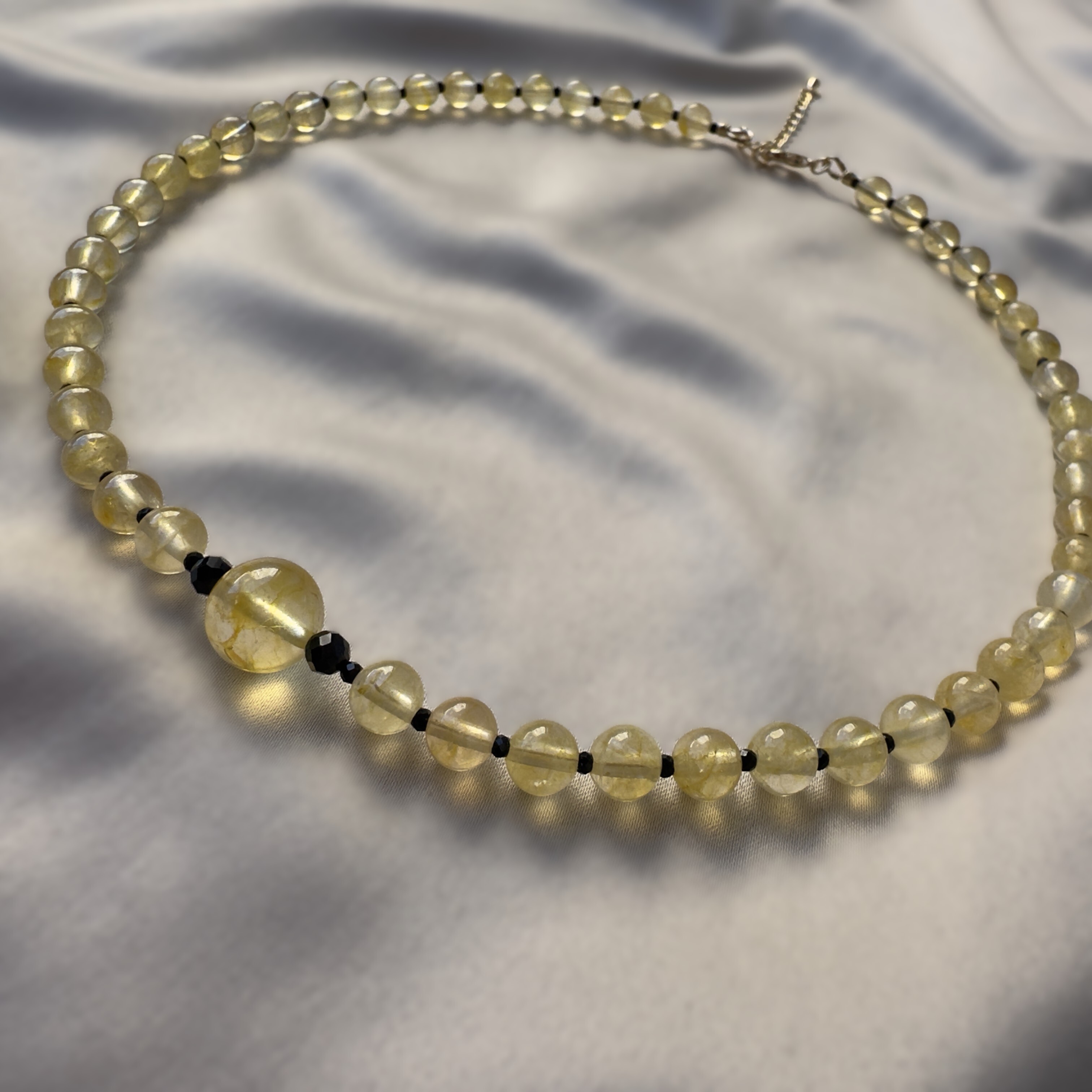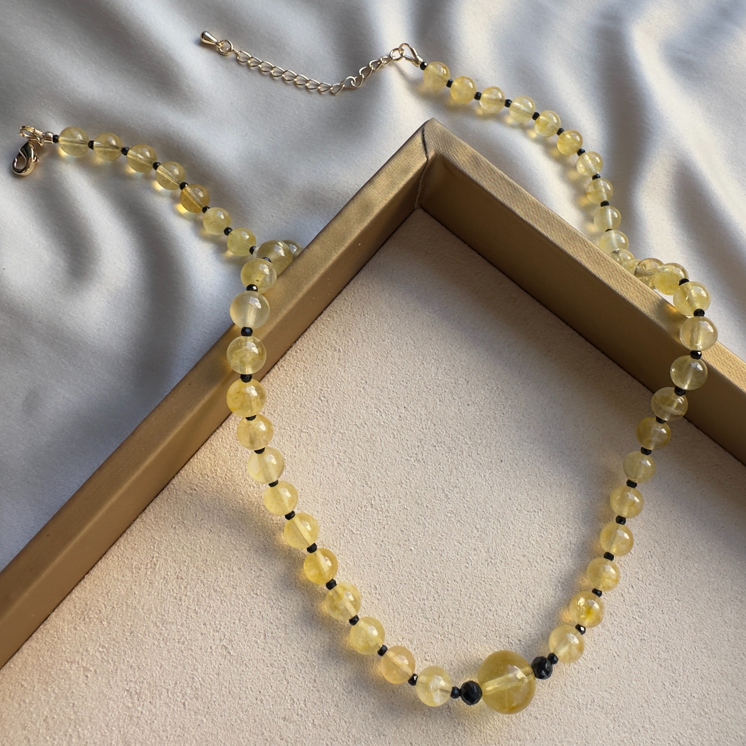 Состав и размеры: натуральный цитрин (шары 6–8 мм, центральная бусина 10 мм); огранённая чёрная шпинель-спейсеры 2 и 4 мм; фурнитура премиум (Корея), цвет золота; длина 40–45 см (удлинитель 5 см); замок-карабин; сборка на ювелирном тросике.