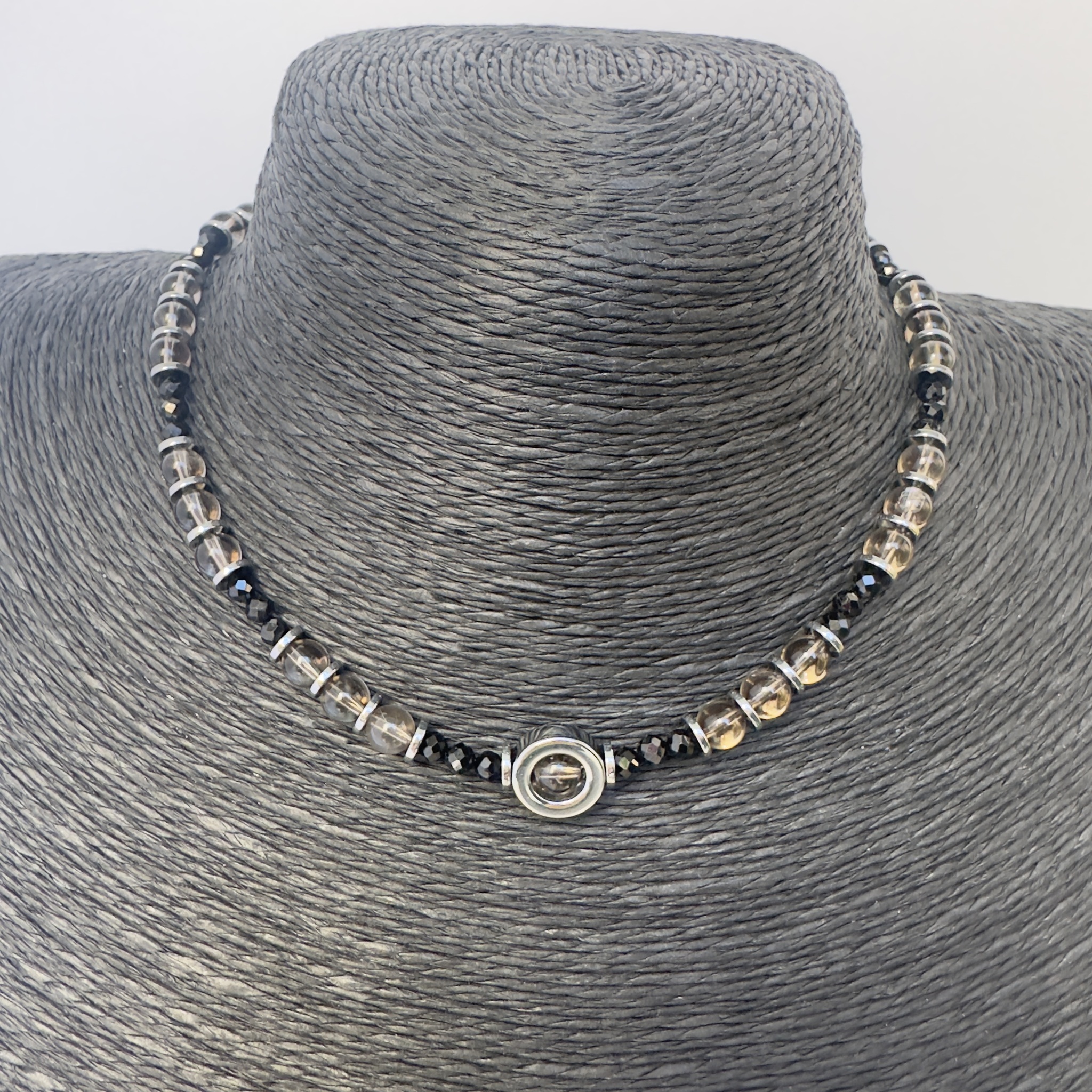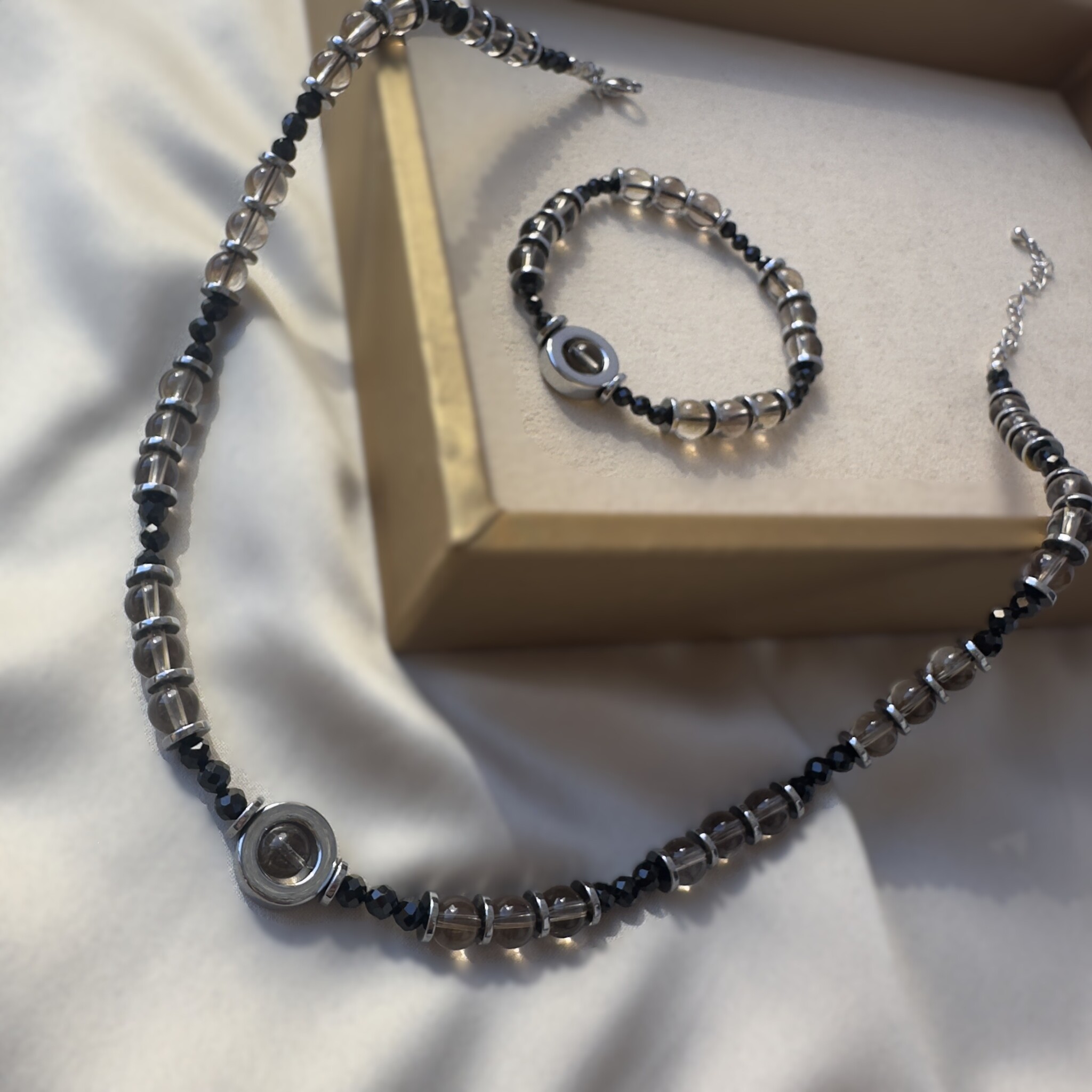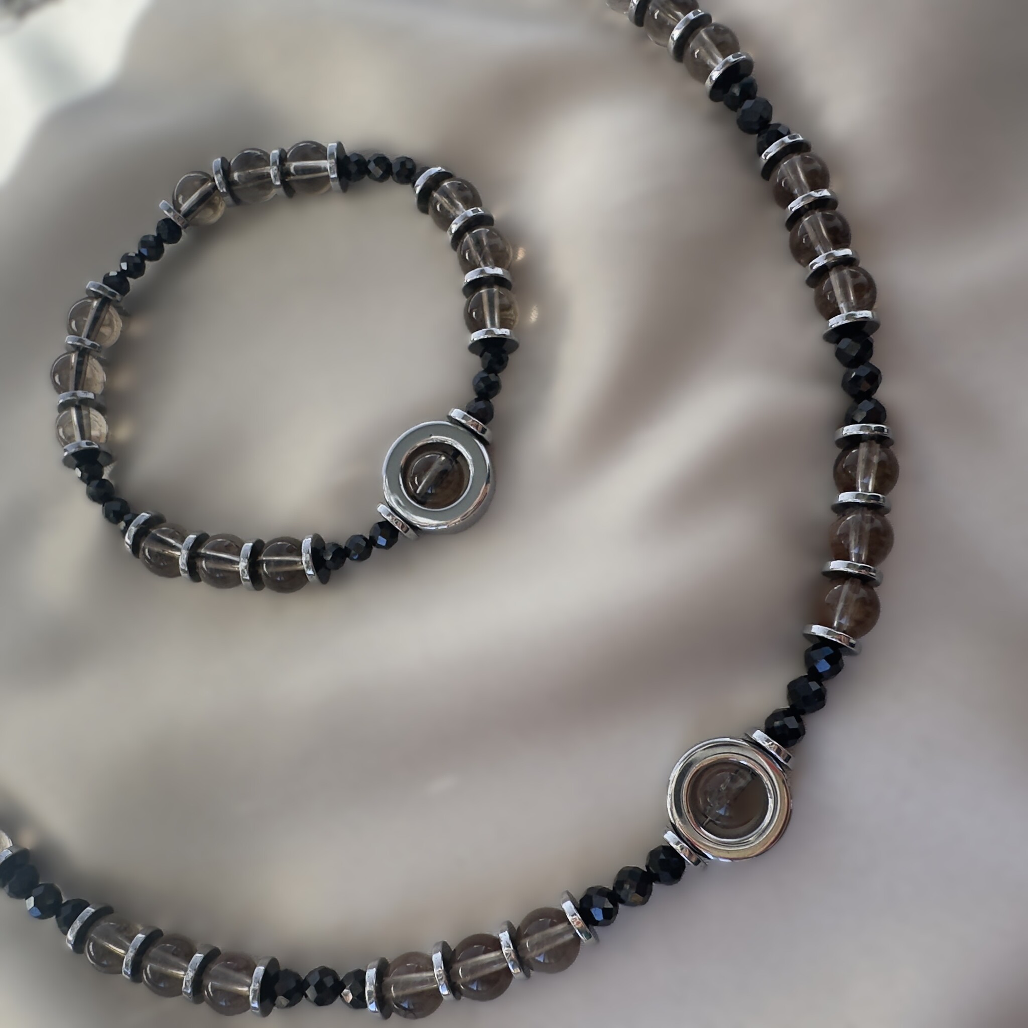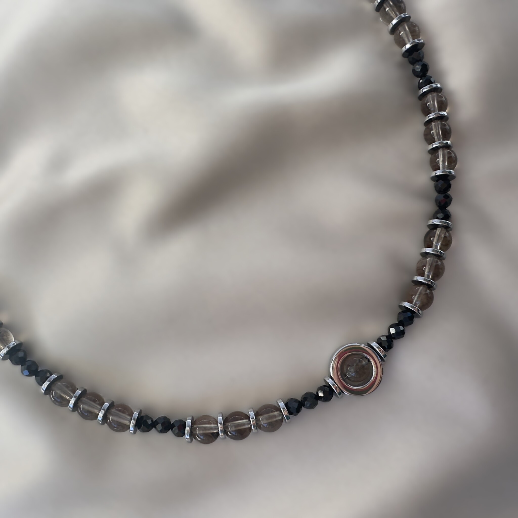 «Тайна ночи» создана для тех, кто несёт в себе силу, глубину и притягательную загадку. Раухтопаз окутывает спокойствием, шпинель подчеркивает внутреннюю магнетичность, а гематит наполняет энергией действия. Вместе они становятся мощным оберегом и стильным украшением.