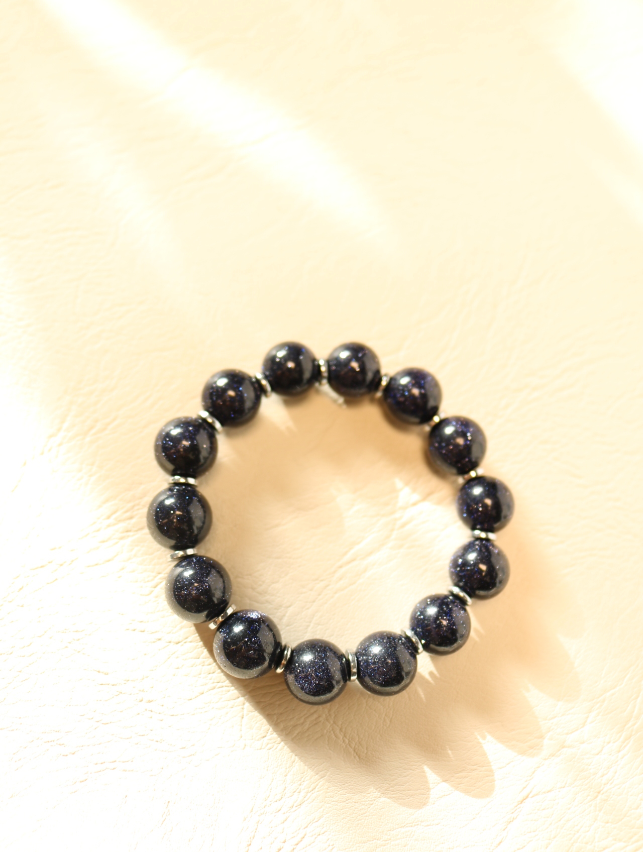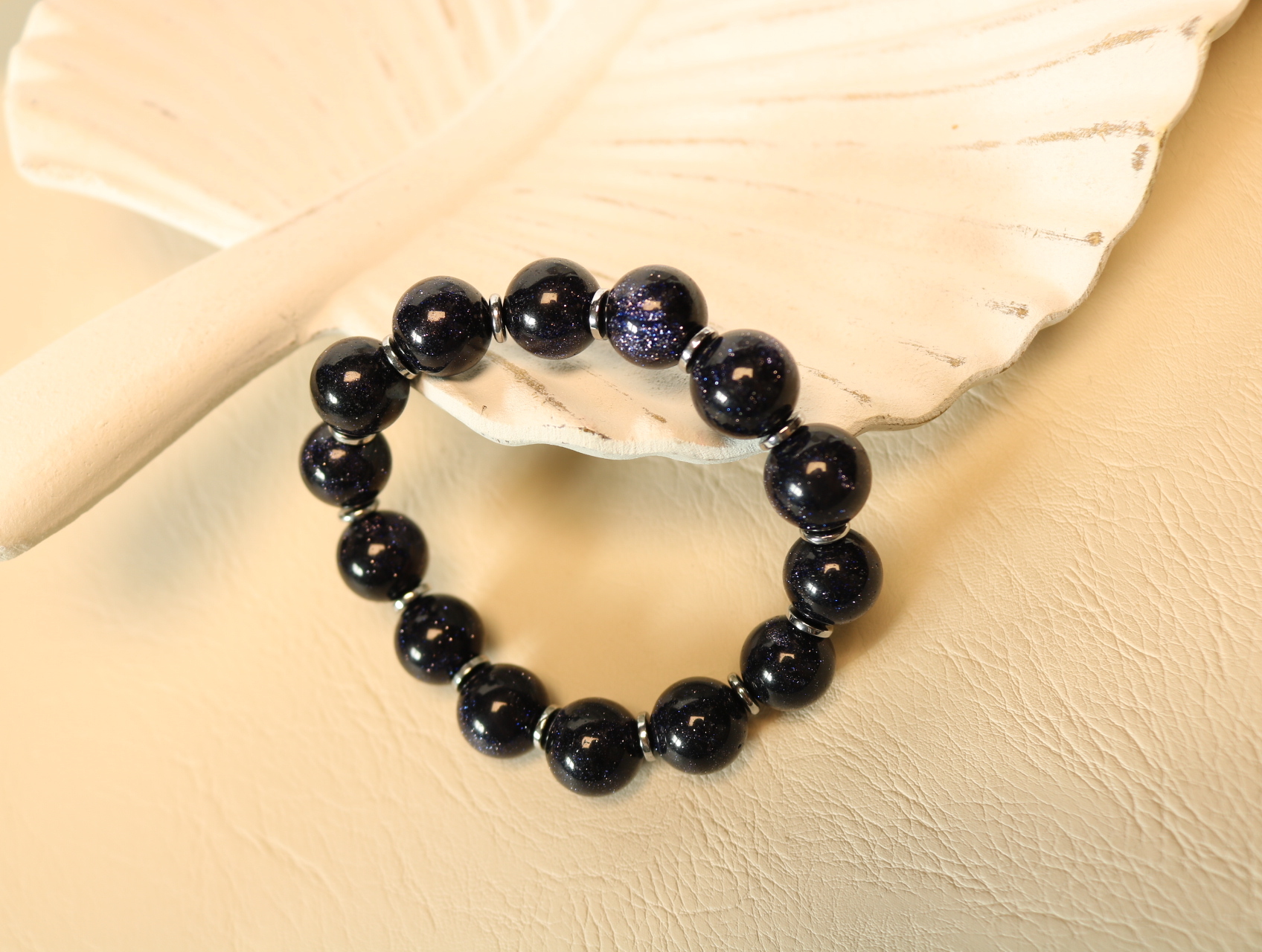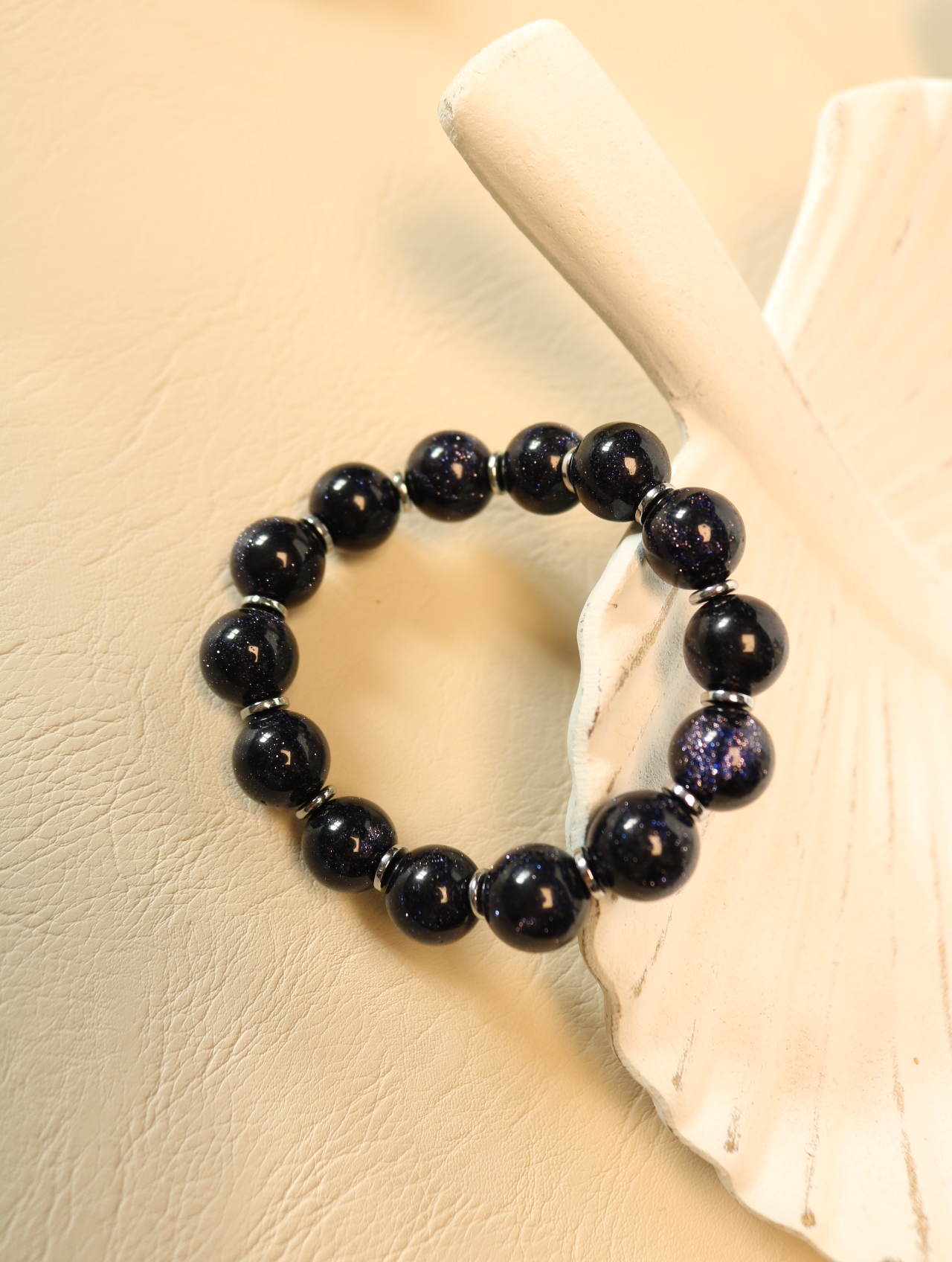 Объёмные шары тёмно-синего авантюрина 10 мм мерцают, как ночное небо с миллионом звёзд. Между ними — лаконичные вставки из гематита, которые подчёркивают глубину цвета и добавляют браслету графичности. Украшение собрано на прочной силиконовой резинке: браслет удобно надевать и носить в течение дня, он мягко подстраивается под запястье и не стягивает руку. Идеальный акцент для тех, кто любит тёмные, «космические» оттенки и уверенный минимализм.