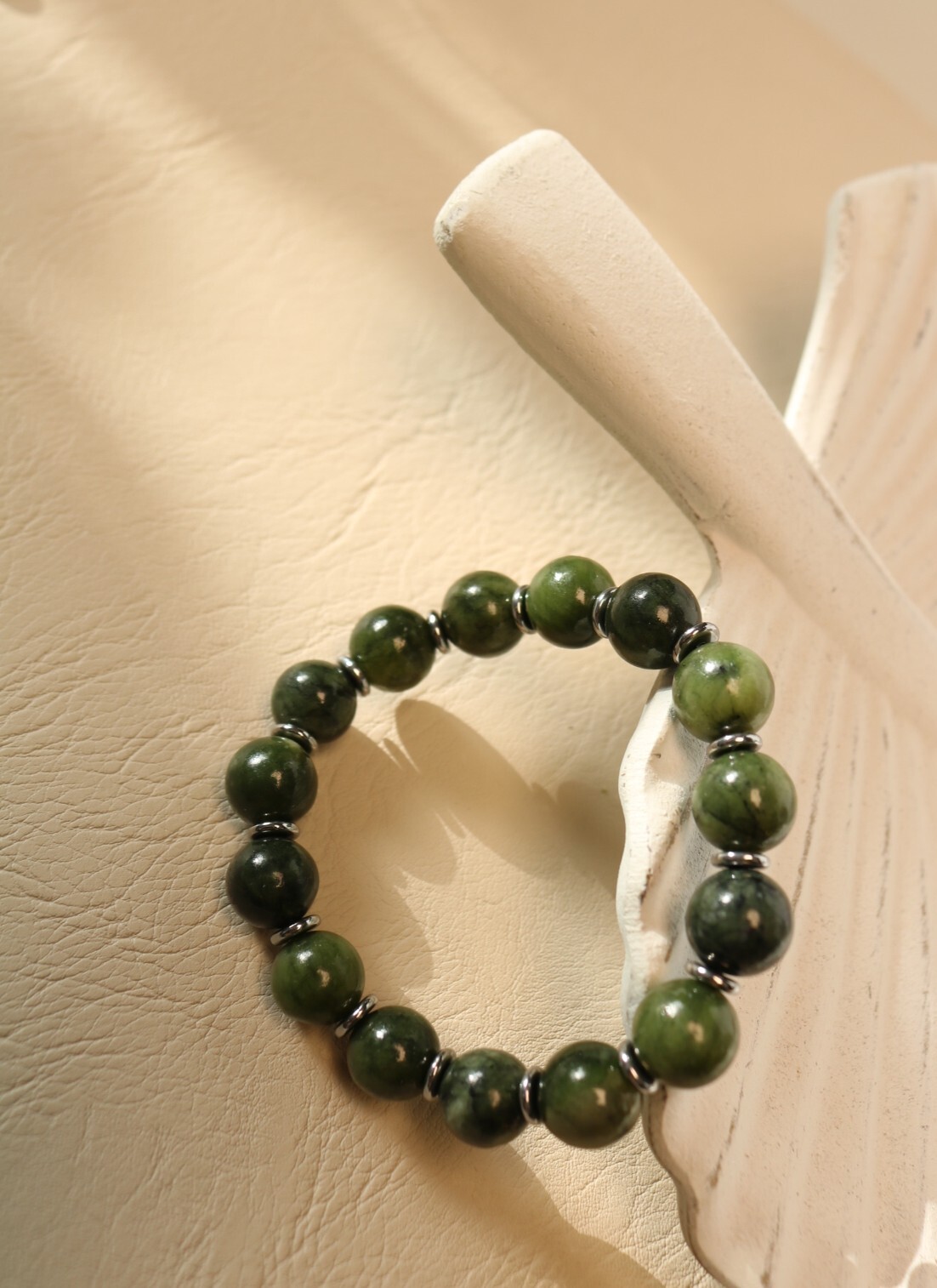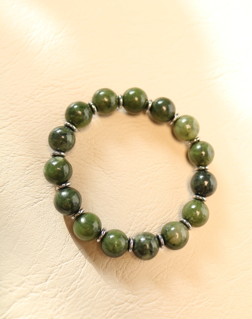 Браслет из натурального зелёного нефрита на прочной эластичной нити. Крупные гладкие шарики диаметром 10 мм чередуются с графичными дисками вставками из гематита, подчёркивая глубину камня и делая браслет визуально собранным. Адаптируется под запястье, удобно сидит, не перетягивая руку, Подойдет на руку размером XS, S, M. Лаконичный, но очень «живой» аксессуар-талисман от «Викторинэль» — Твой талисман в мире побед.