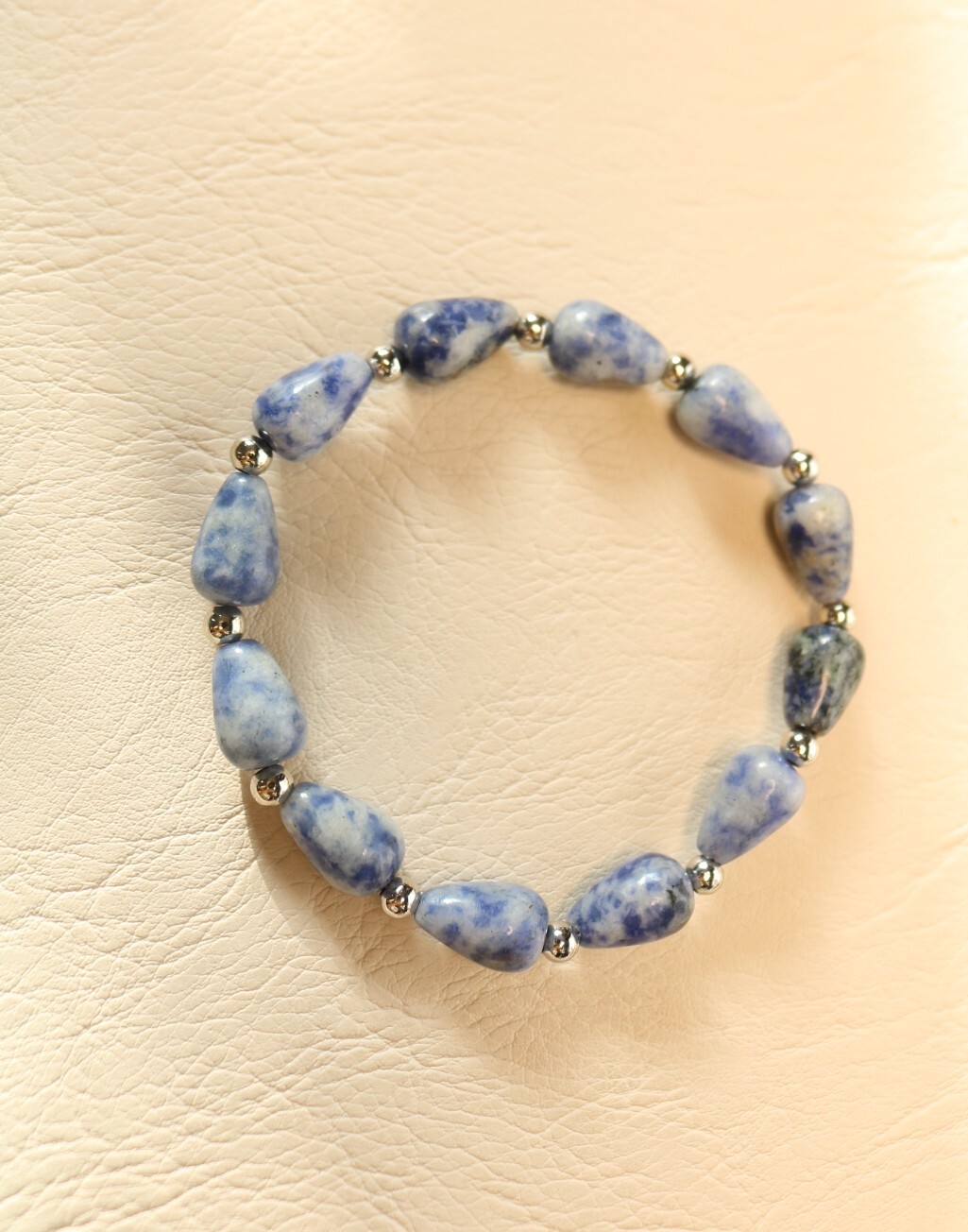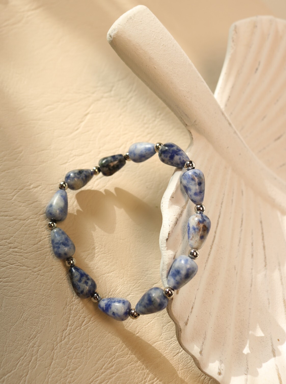 Браслет из натурального содалита на прочной силиконовой резинке. Голубые и серо-синие бусины в форме вытянутых капелек размером около 12×8 мм чередуются с гладкими металлическими вставками-шариками, создавая аккуратный ритм и лёгкий блеск. Форма капель визуально вытягивает кисть и делает её более изящной. Браслет комфортно садится на руку, не имеет застёжки и легко надевается одним движением.