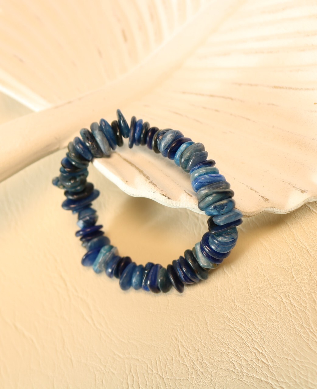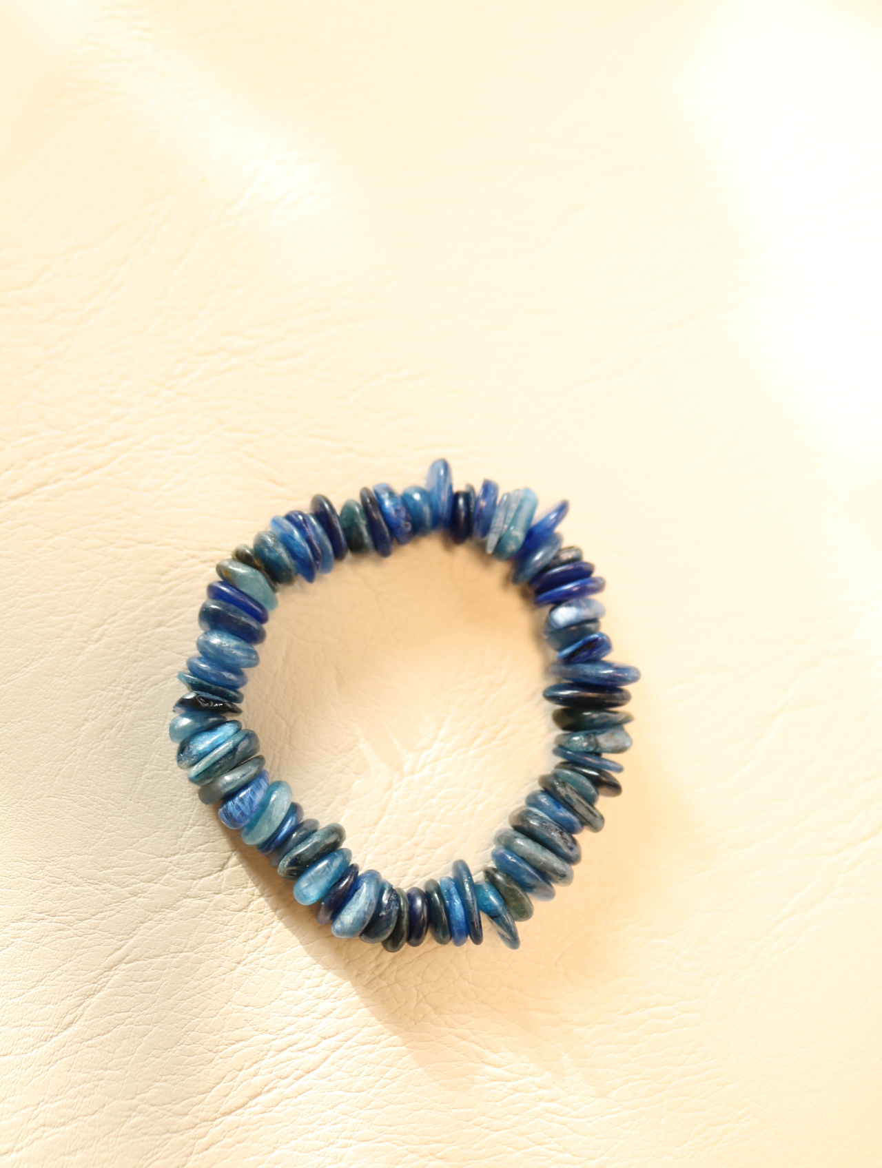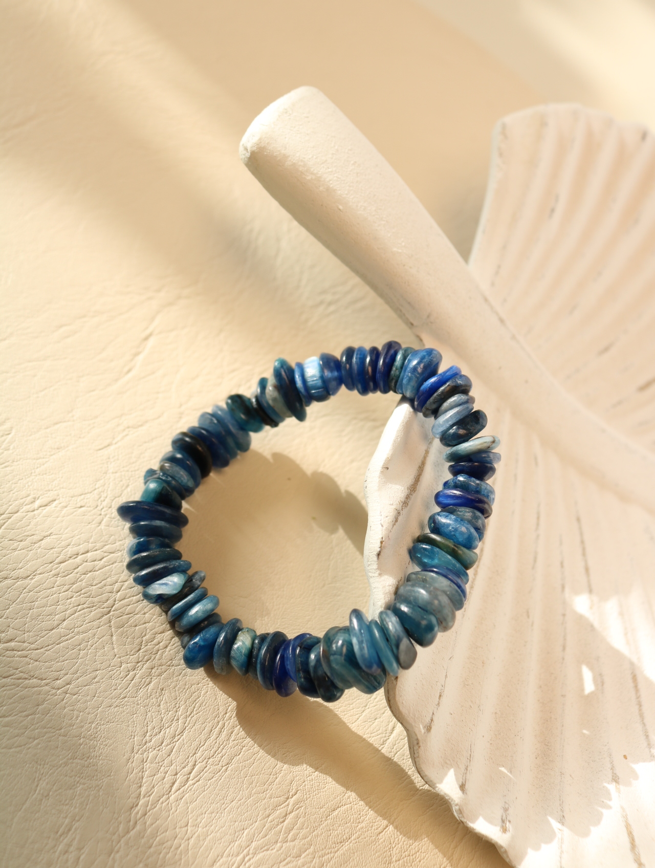 Браслет из натурального кианита на прочной эластичной нити. Плоские «лепестки» камня плотно собираются в фактурный ободок, создавая эффект живой, слегка «дикий» фактуры — как морская галька, шлифованная волнами.
