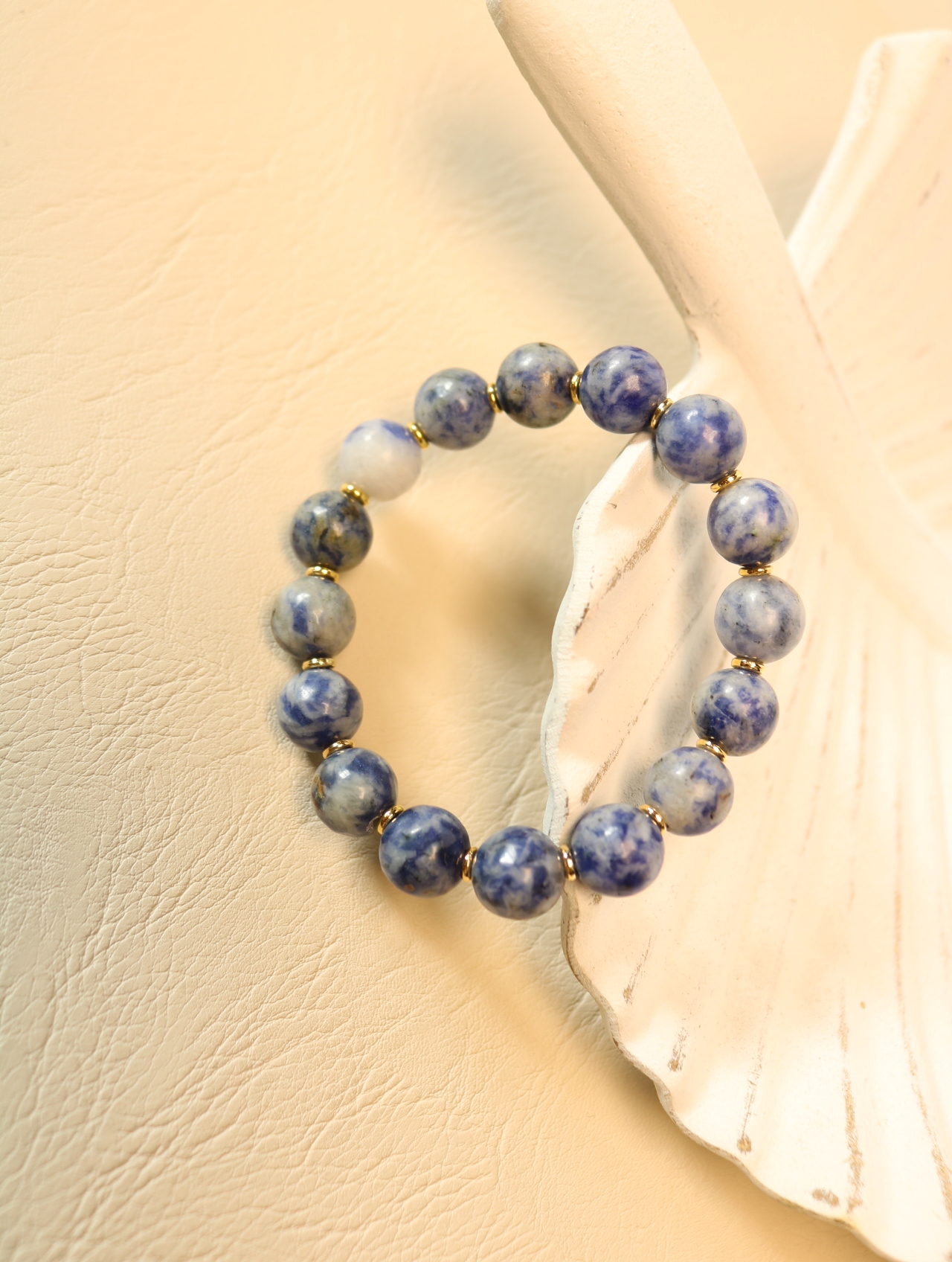 Диаметр шариков содалита — около 10 мм, между ними тонкие разделители из металлического гематита, которые добавляют браслету графичность и лёгкий блеск. Мягкая растяжка за счёт силиконовой резинки — удобно надевать и носить в течение дня, браслет аккуратно садится на запястье и не сдавливает руку.