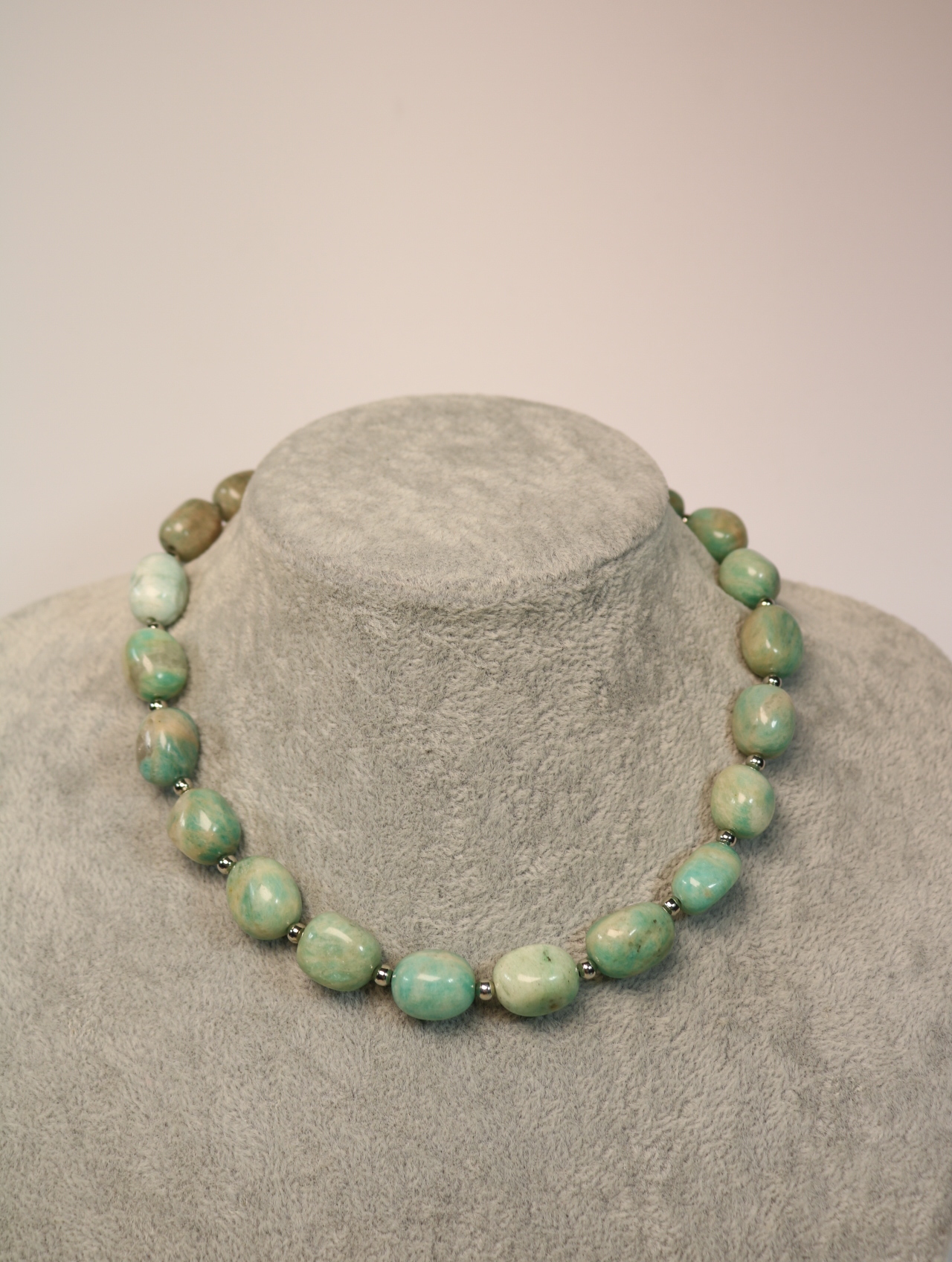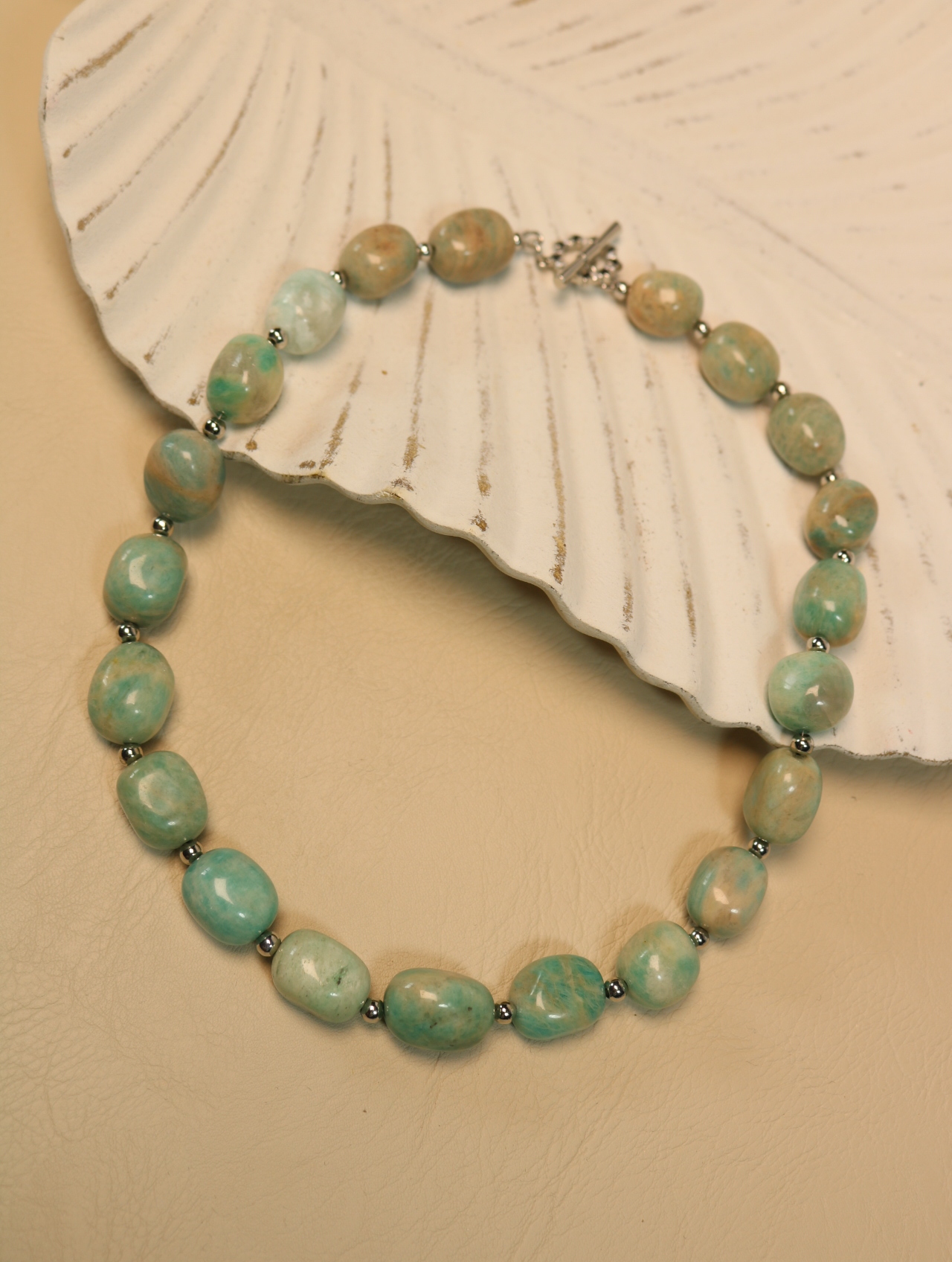 Колье в подарок из крупной галтовки амазонита (примерно 12×10 мм): живые неровные бусины с мраморными прожилками морской волны. Между ними — аккуратные металлические шарики, которые добавляют блеск и аккуратно выстраивают камни в линию. Застежка тогл - инкрустированный фианитами. Крупный амазонит красиво ложится по ключицам и мягко подсвечивает кожу тёплым мятно-бирюзовым оттенком.