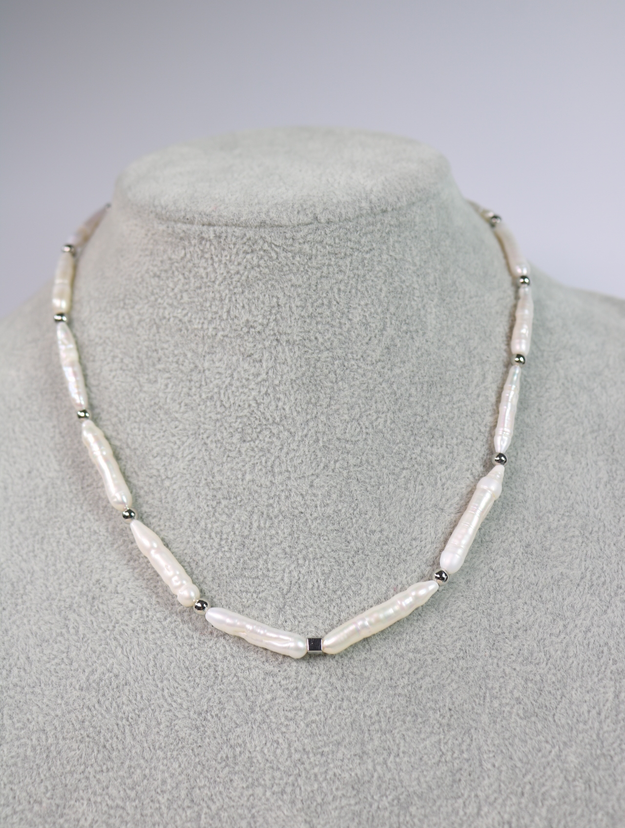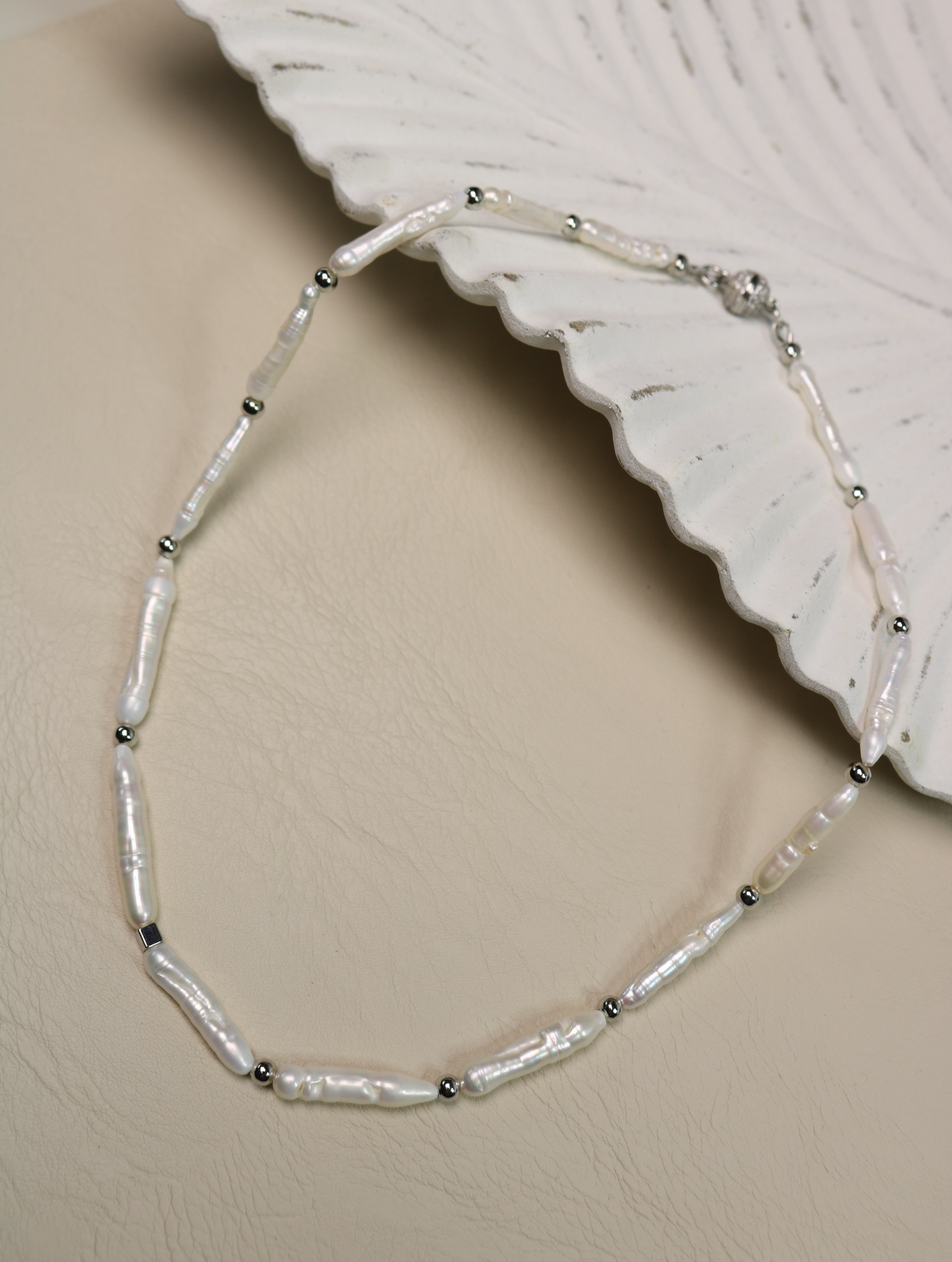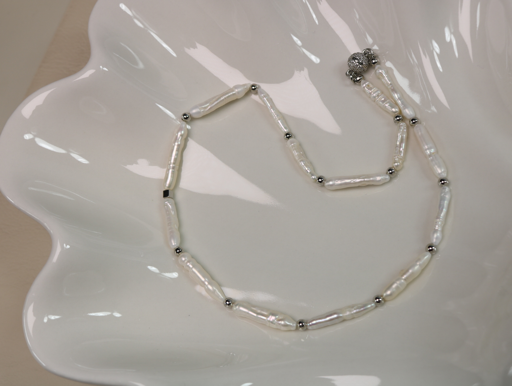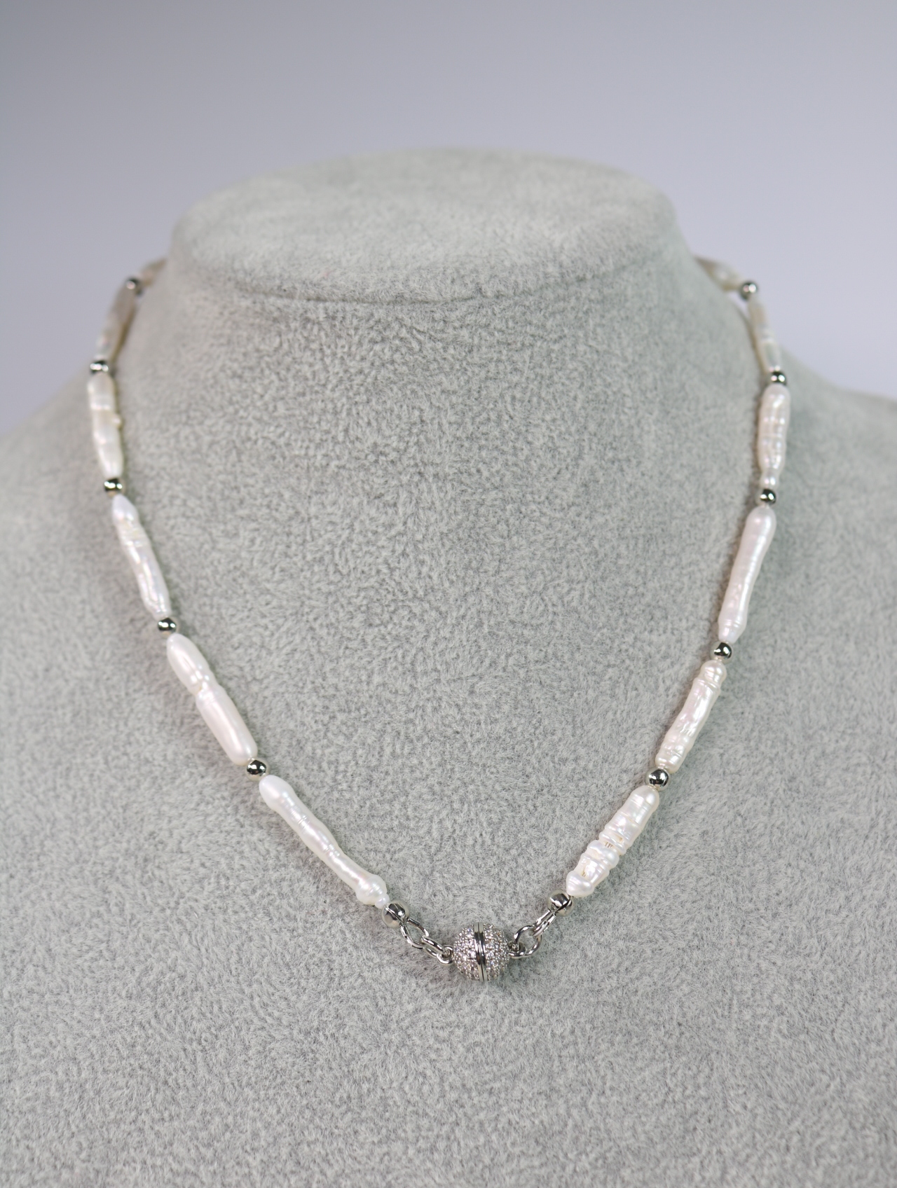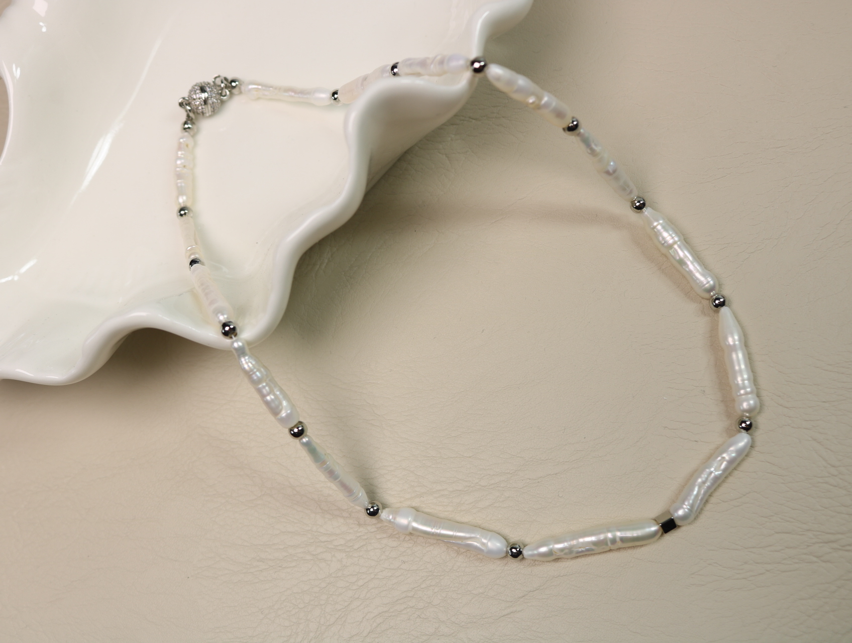 Минималистичное колье из вытянутого барочного жемчуга, собранного в изящную линию. Нестандартная форма бусин делает украшение живым и «текучим» – каждый жемчужный фрагмент отражает свет по-своему и мягко подсвечивает шею. Акцент — магнитный замок, инкрустированный фианитами: он выглядит как декоративный элемент и при этом очень удобен в застегивании.