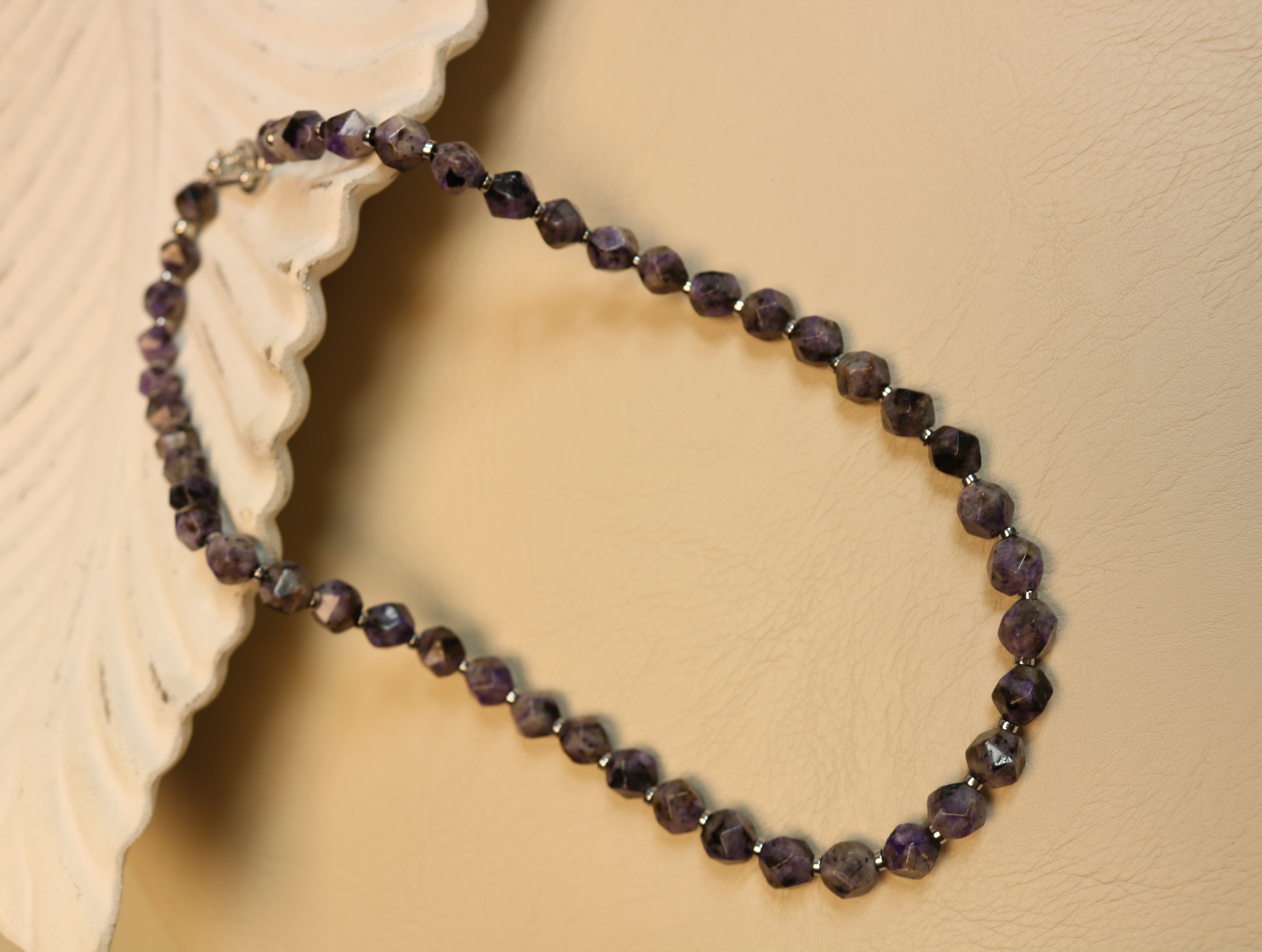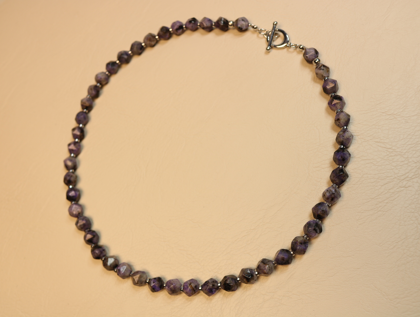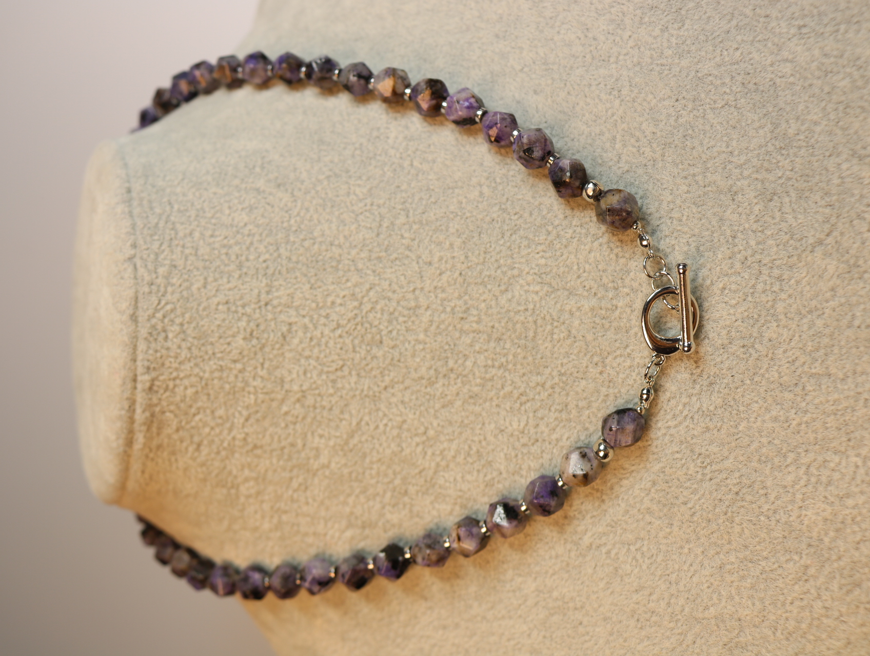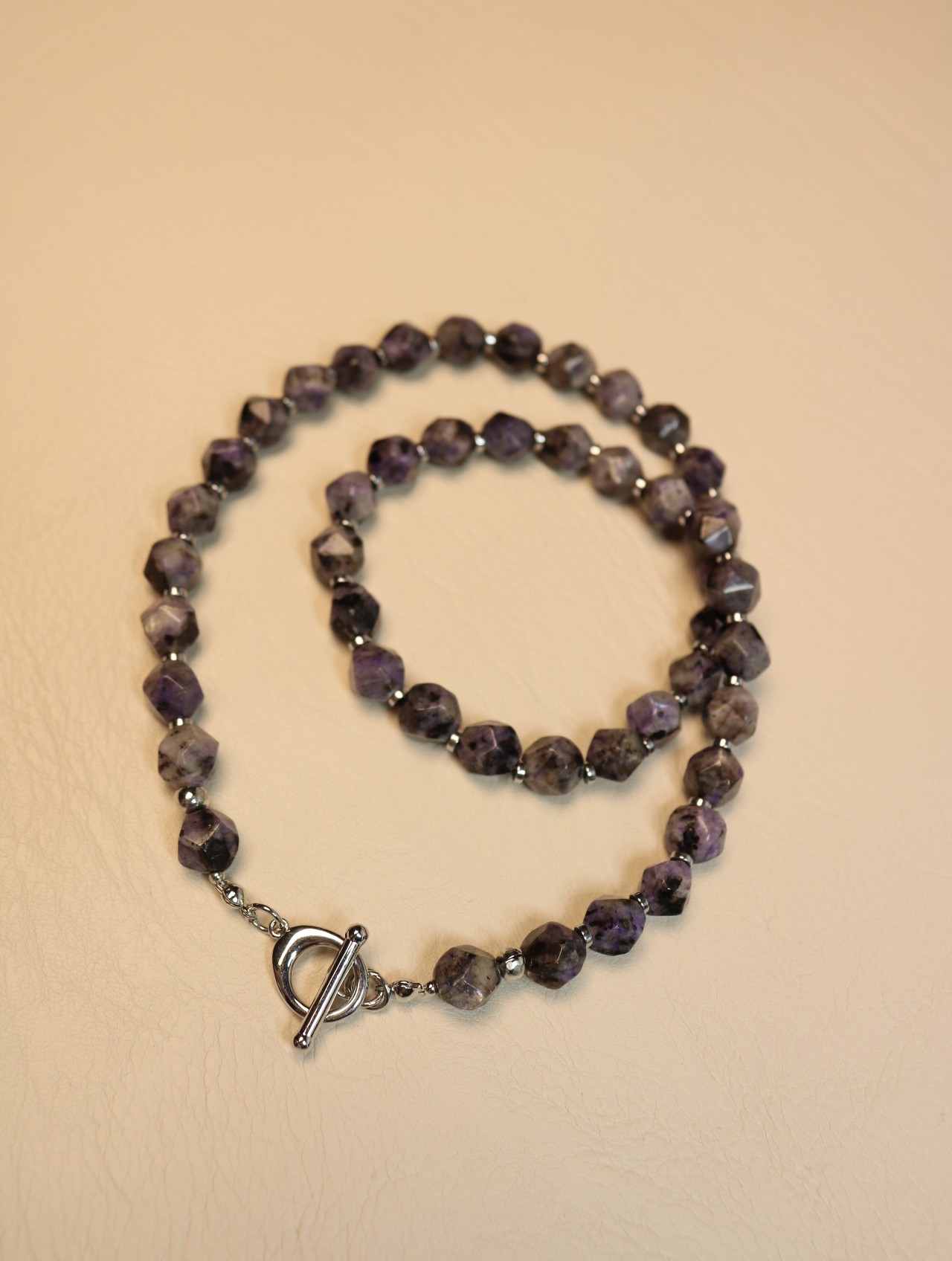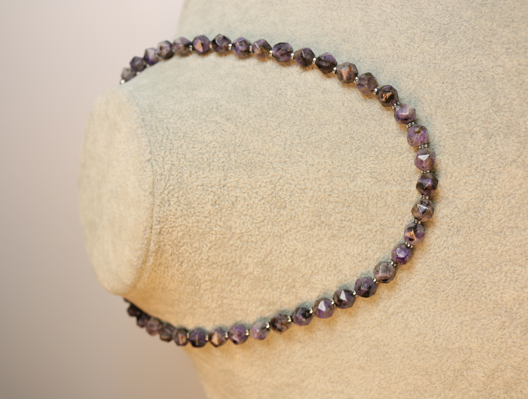 Чароит — редкий камень с узнаваемым “вихревым” рисунком: прожилки, облака и переливы фиолетовой гаммы делают каждую бусину неповторимой. В гранёной огранке чароит выглядит глубже и “живее”: на свету появляется мягкое мерцание, а фактура становится более выразительной, но при этом остаётся элегантной и носибельной.