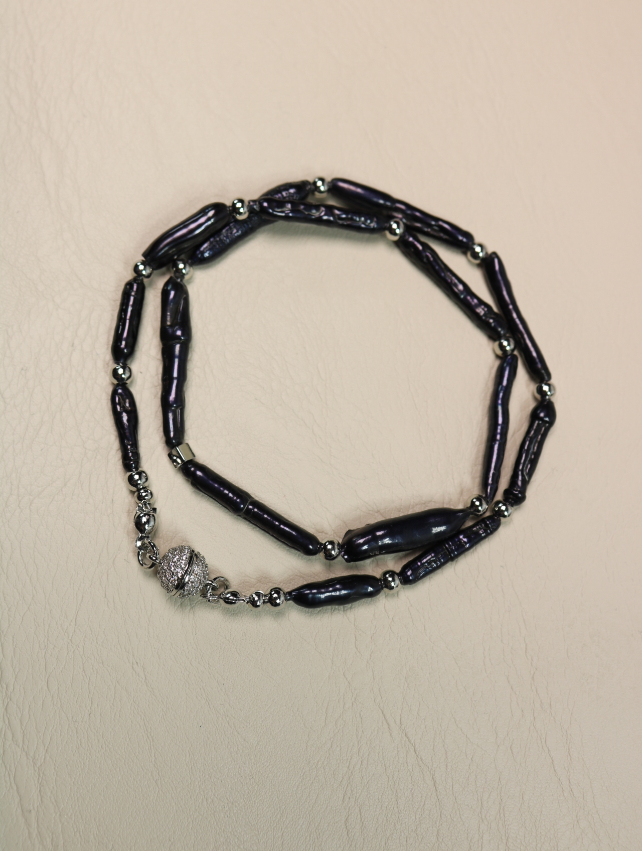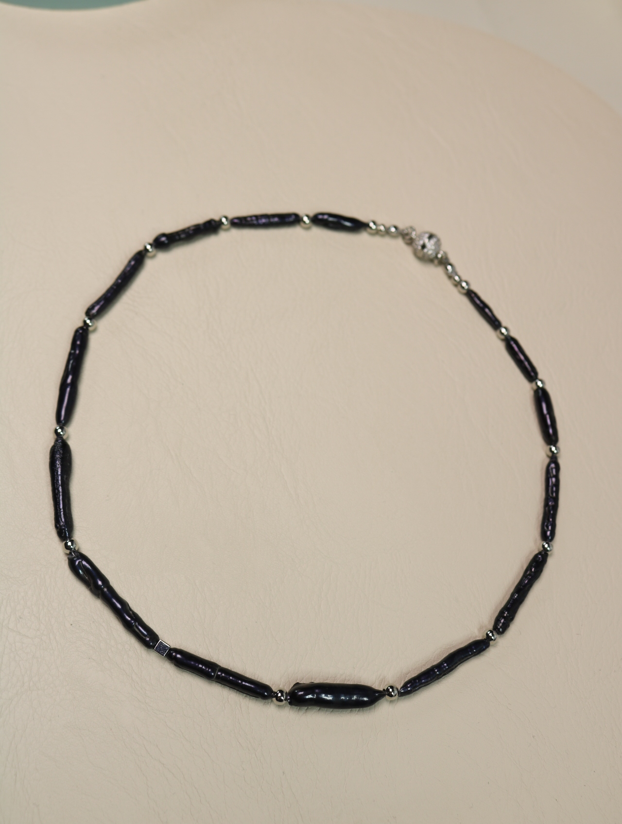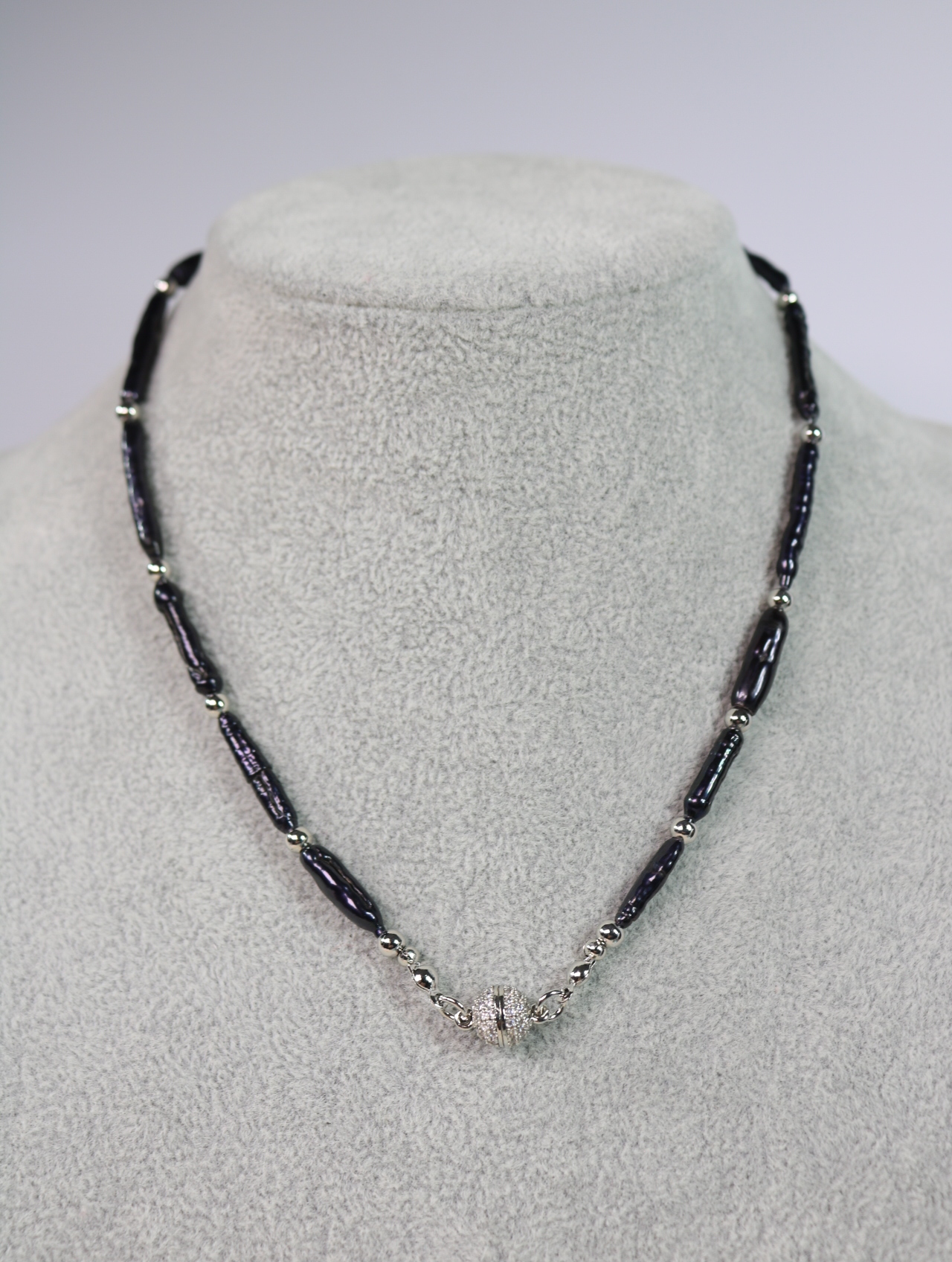 Графичный чокер из вытянутого чёрного жемчуга-палочек с холодным металлическим блеском фурнитуры. Нежные серебристые шарики между бусинами подчёркивают фактуру жемчуга и делают линию по шее более живой и пластичной. Удобный магнитный замок позволяет надевать чокер одним движением — без танцев перед зеркалом и просьб «помоги застегнуть». Украшение легко поддержит как минималистичный чёрный лук, так и белую рубашку или вечернее платье.