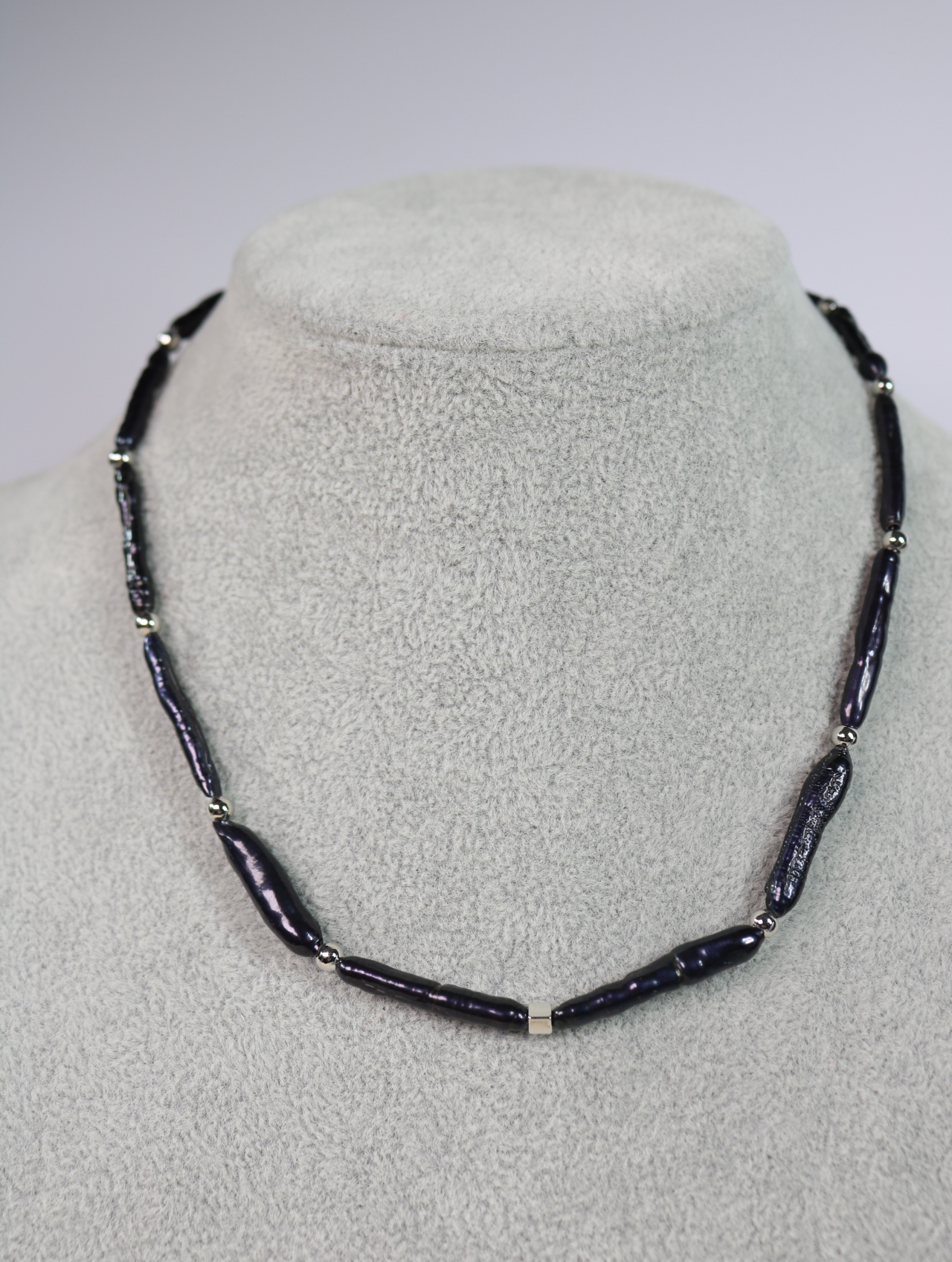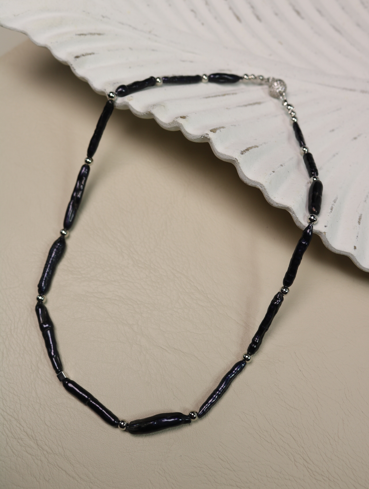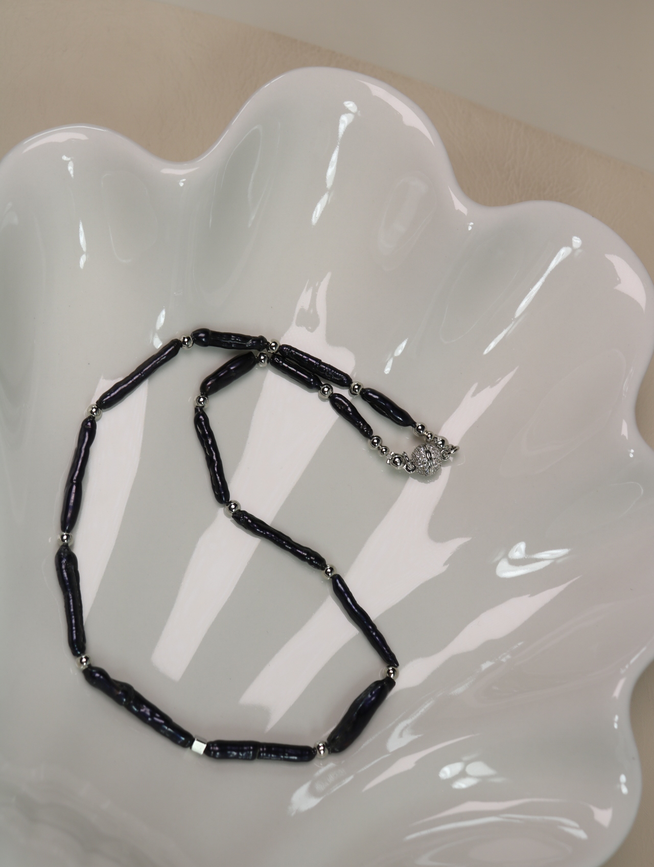 Графичный чокер из вытянутого чёрного жемчуга-палочек с холодным металлическим блеском фурнитуры. Нежные серебристые шарики между бусинами подчёркивают фактуру жемчуга и делают линию по шее более живой и пластичной. Удобный магнитный замок позволяет надевать чокер одним движением — без танцев перед зеркалом и просьб «помоги застегнуть». Украшение легко поддержит как минималистичный чёрный лук, так и белую рубашку или вечернее платье.