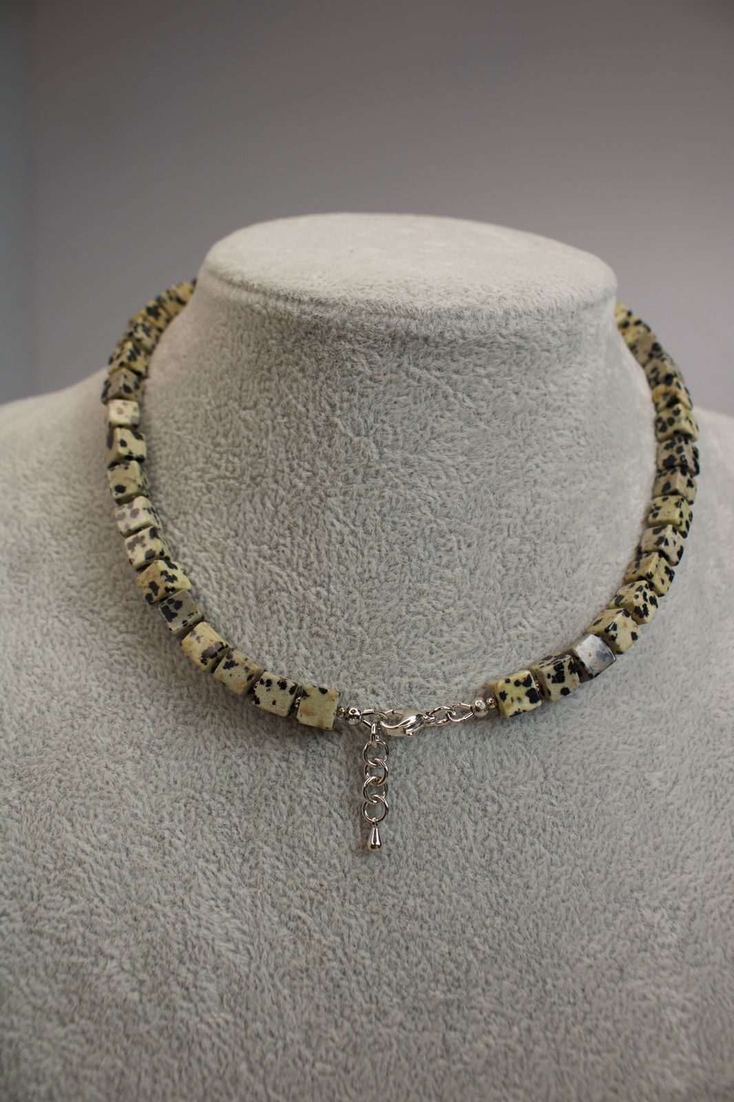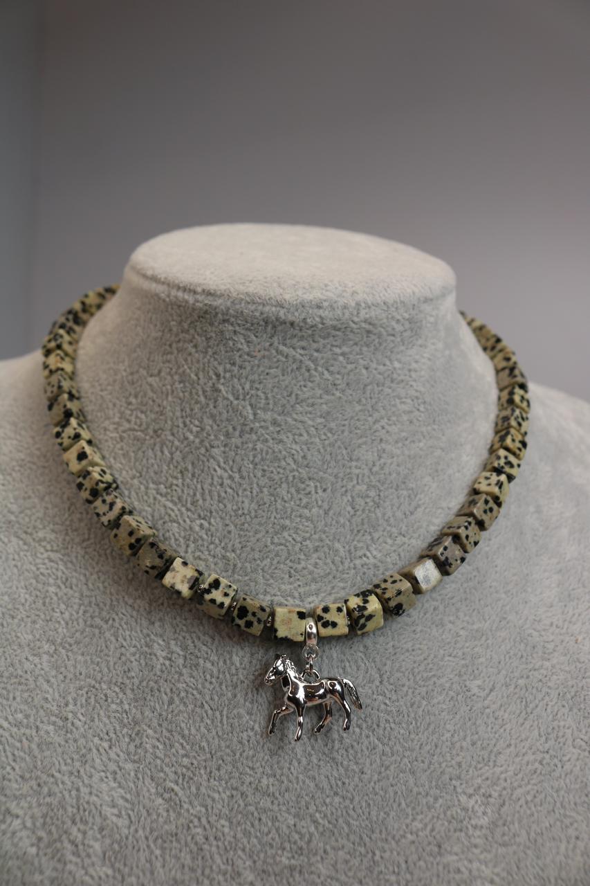 Материалы: натуральная далматиновая яшма (кубики), гематит, подвеска-лошадь (металл под серебро), гипоаллергенная фурнитура.