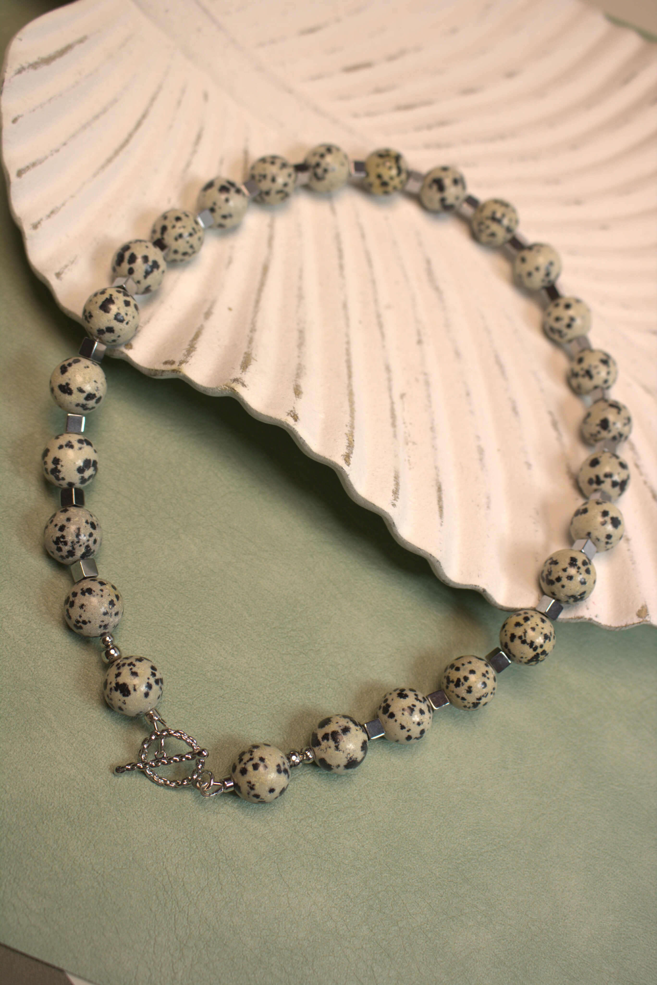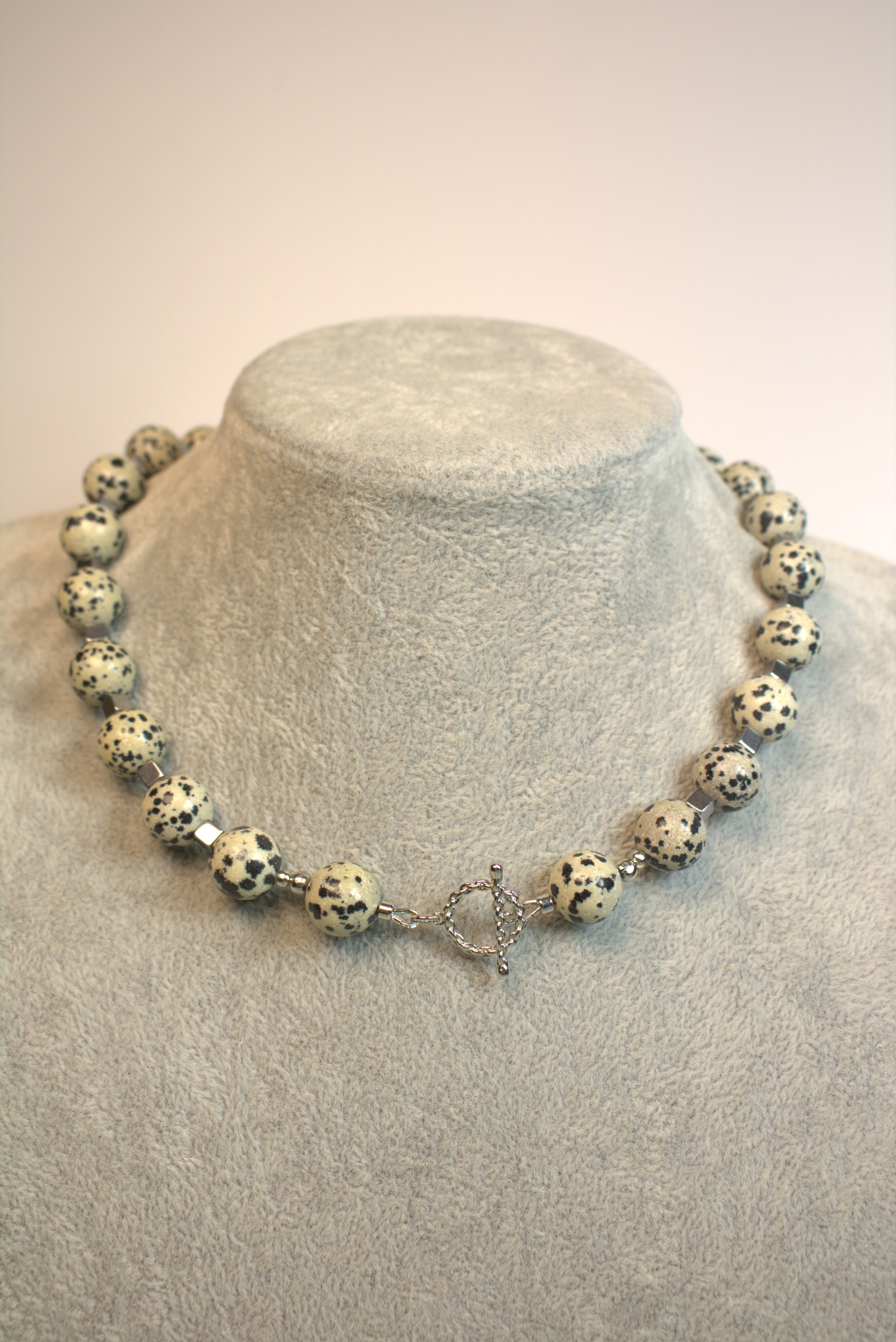 Объёмное женское украшение из далматиновой яшмы с крупными шарами-бусинами 12 мм — акцент, который не затеряется ни в одном образе + кубики гематита. Мягкие бежевые тона с контрастными тёмными крапинками и холодный блеск металлических вставок создают стильный, немного дерзкий минимализм. Украшение, которое смотрится дорого само по себе и не требует «подсветки» другими аксессуарами.