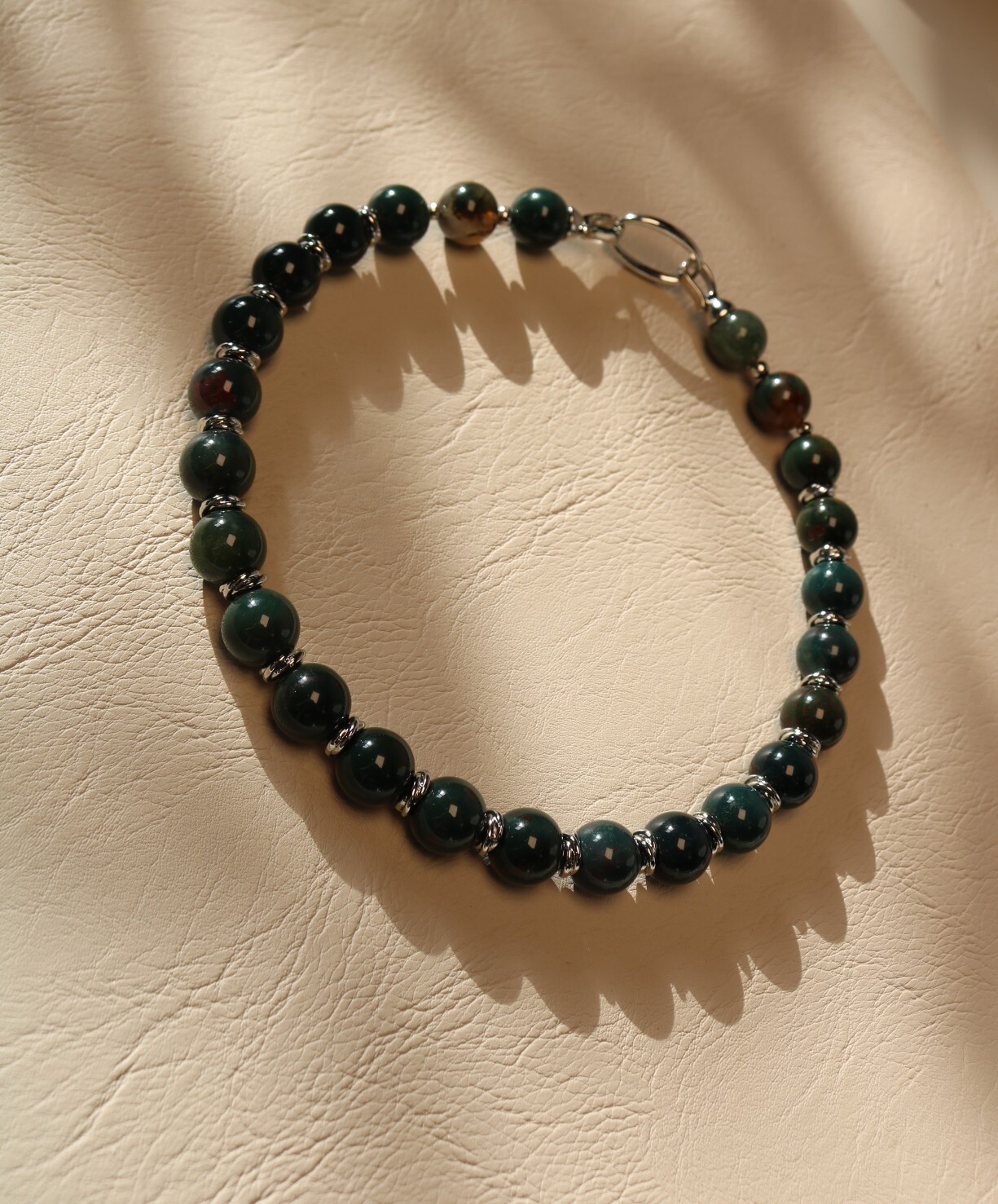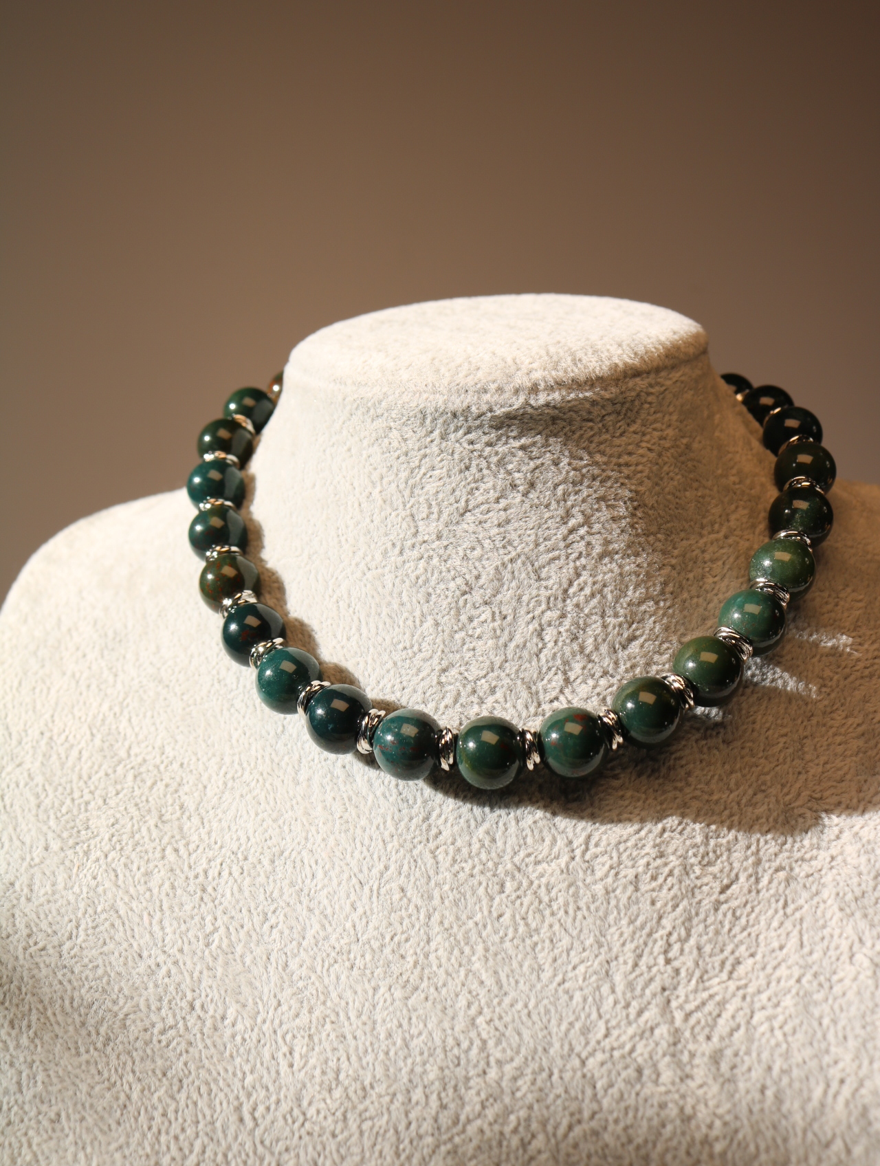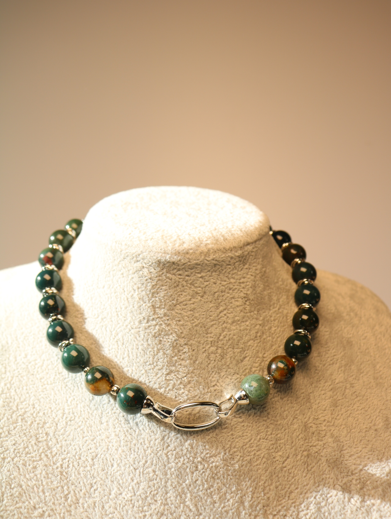 Объёмный женский чокер из гелиотропа с крупными бусинами 12 мм — серьёзный, весомый акцент в образе. Глубокий тёмно-зелёный камень с едва заметными вкраплениями напоминает ночной лес после дождя. Простая застёжка крючок-петля добавляет украшению немного «винтажного» шарма и позволяет легко регулировать посадку по шее.