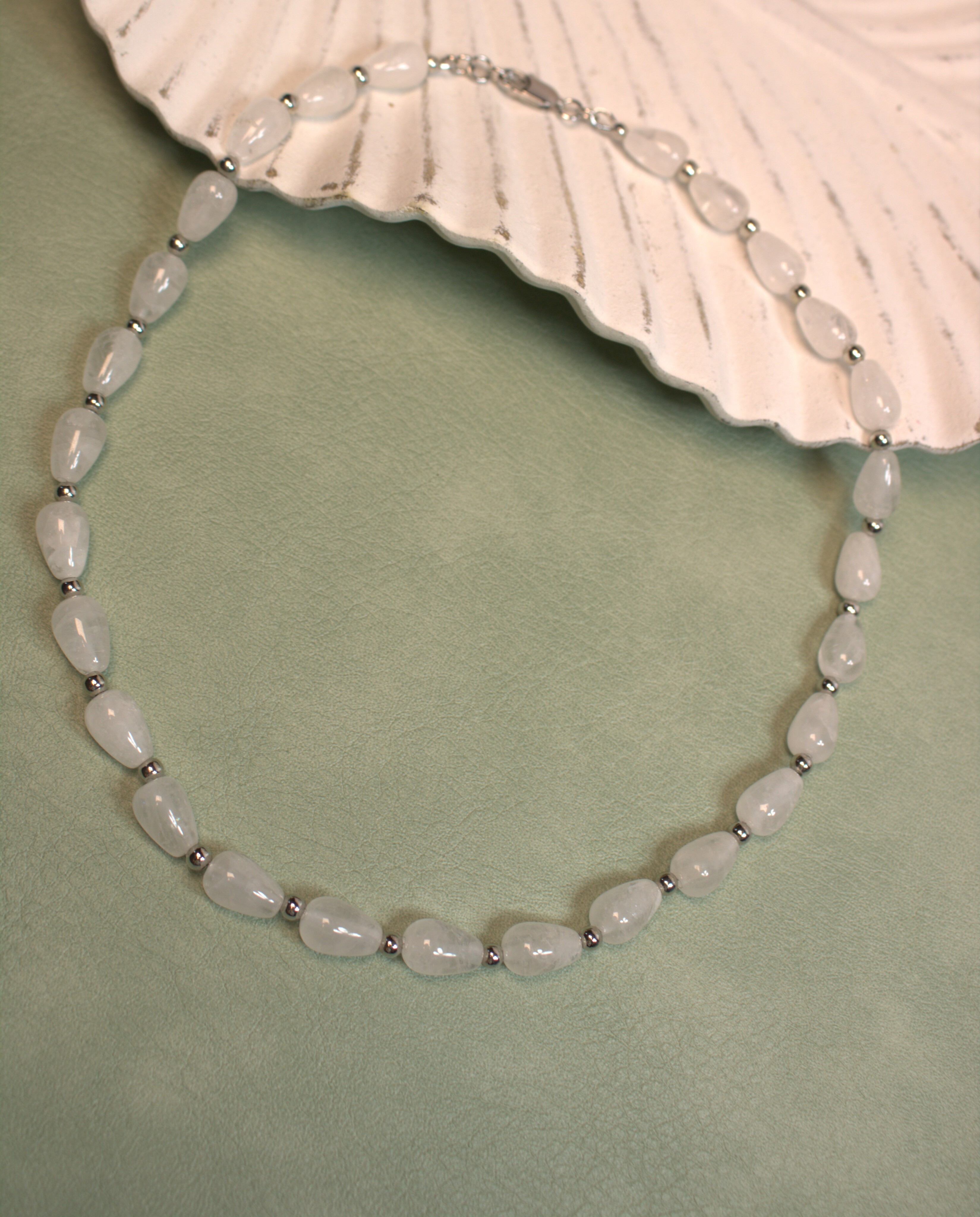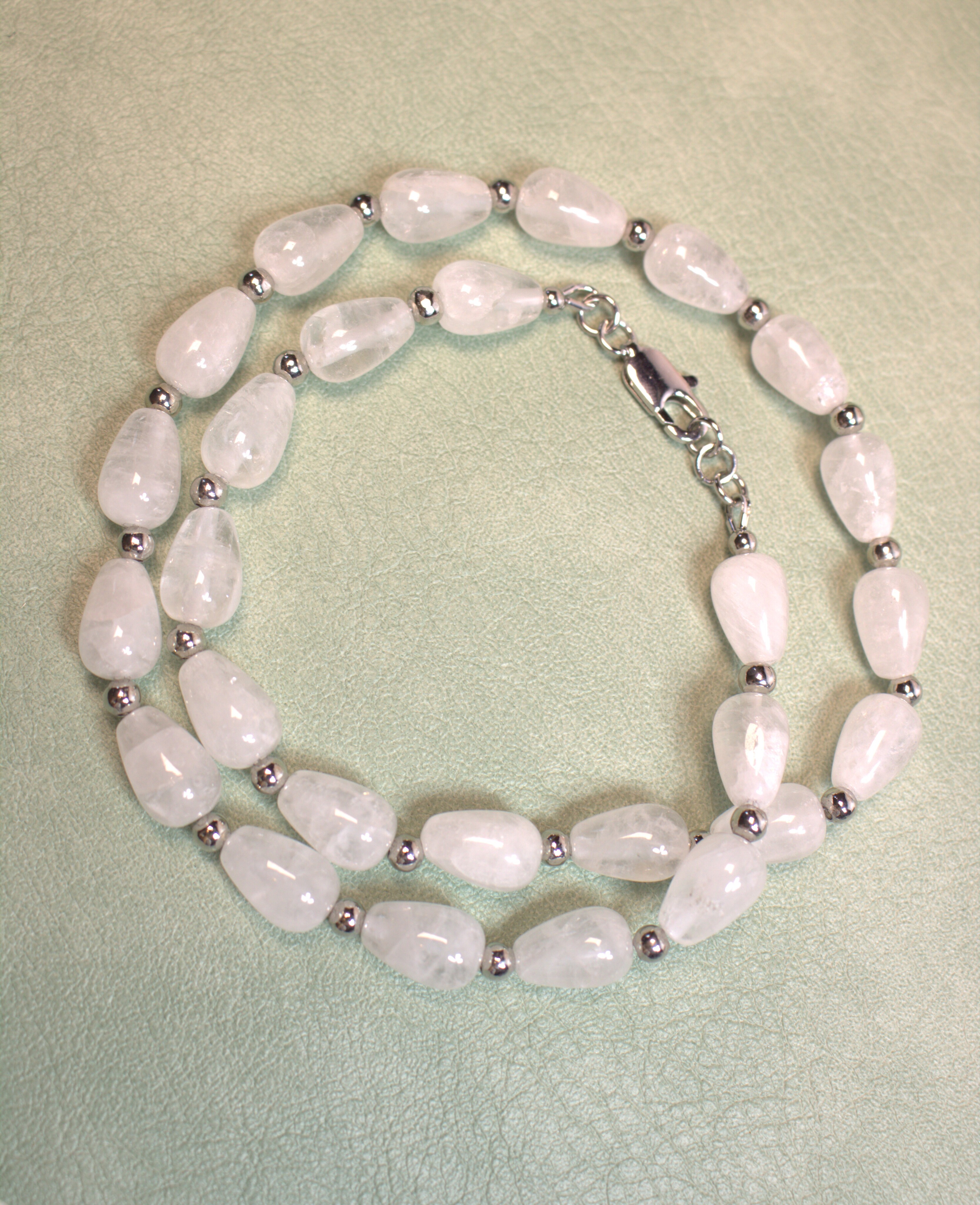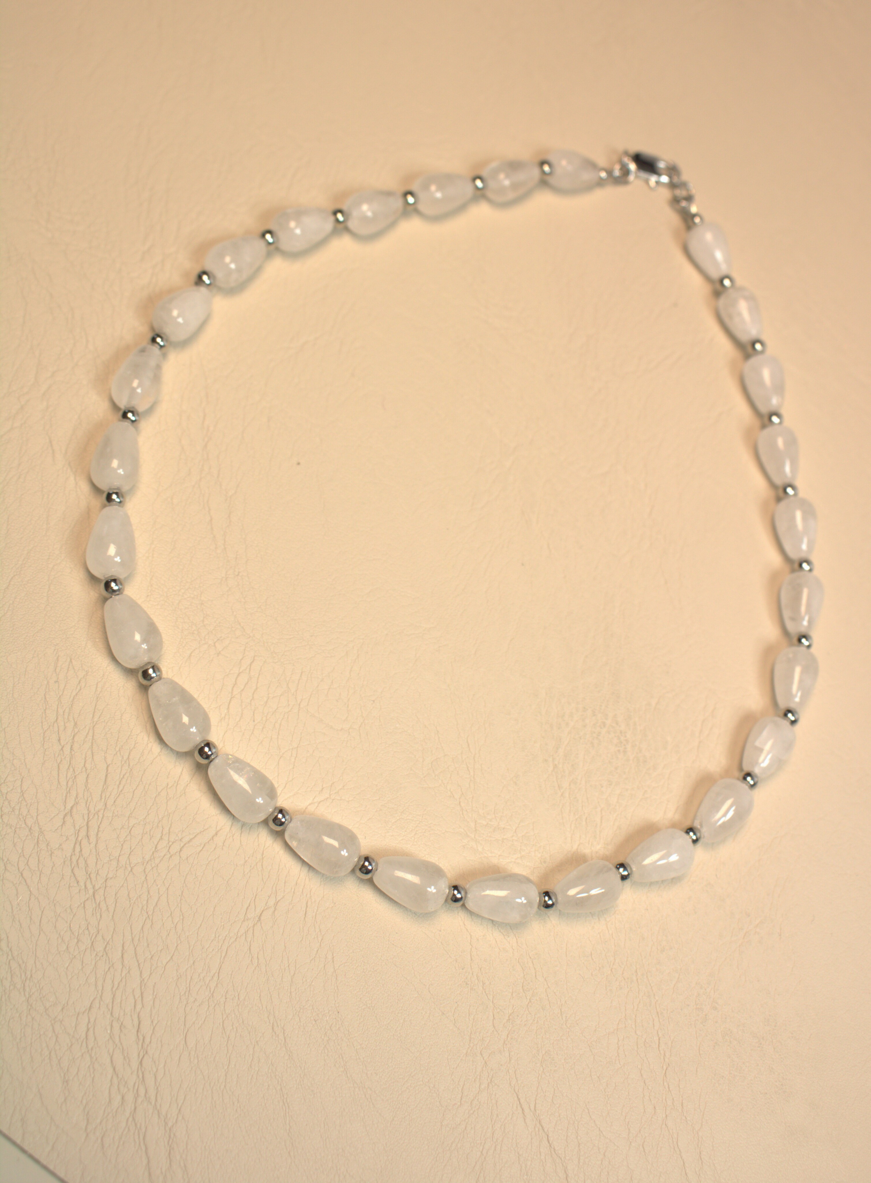 Нежное колье из натурального горного хрусталя в форме капель 12×8 мм. Полупрозрачные бусины дают мягкое свечение, красиво ловят свет и визуально освежают зону декольте. Между камнями — аккуратные металлические разделители с родиевым покрытием (Южная Корея), застёжка-карабин. Длина изделия в диапазоне классического колье около 42 см — комфортно садится по шее, не утяжеляя образ. Украшение собрано вручную в мастерской «Викторинэль».