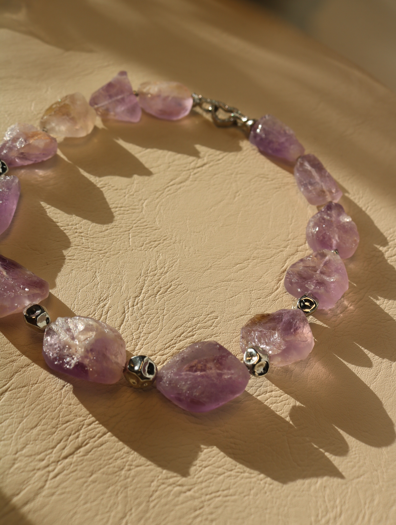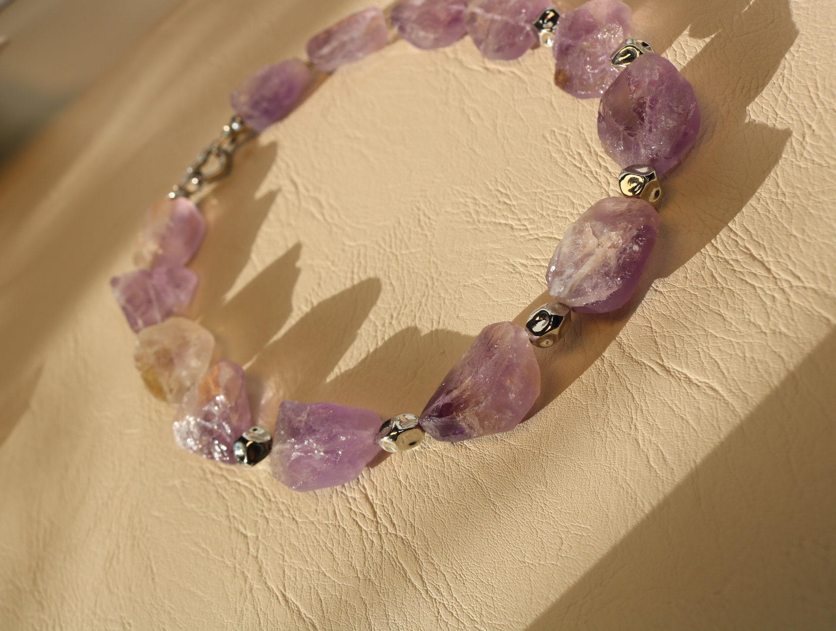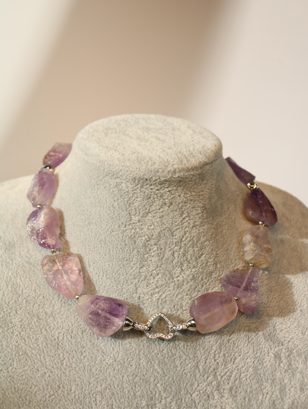 Колье из необработанного лавандового аметиста: крупные природные кристаллы размером около 18–30 мм собраны в яркую линию и разделены благородной металлизированной фурнитурой. Застежка петля-крючок, с сердцем, инкрустированный фианитами. Каждый камень живёт своей фактурой и оттенком — от нежно-дымчатого до насыщенно-фиолетового, так что на шее это украшение выглядит как россыпь маленьких амулетов.