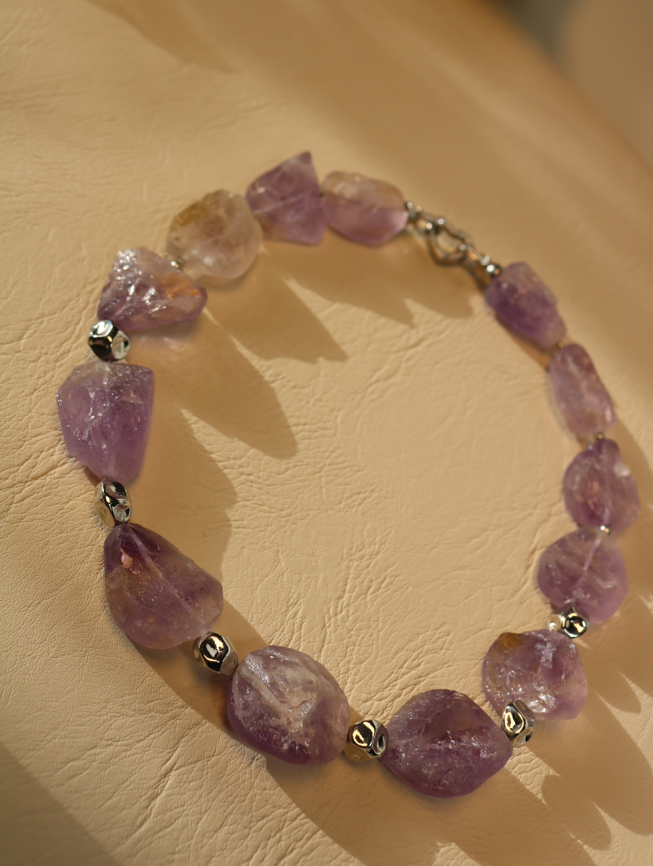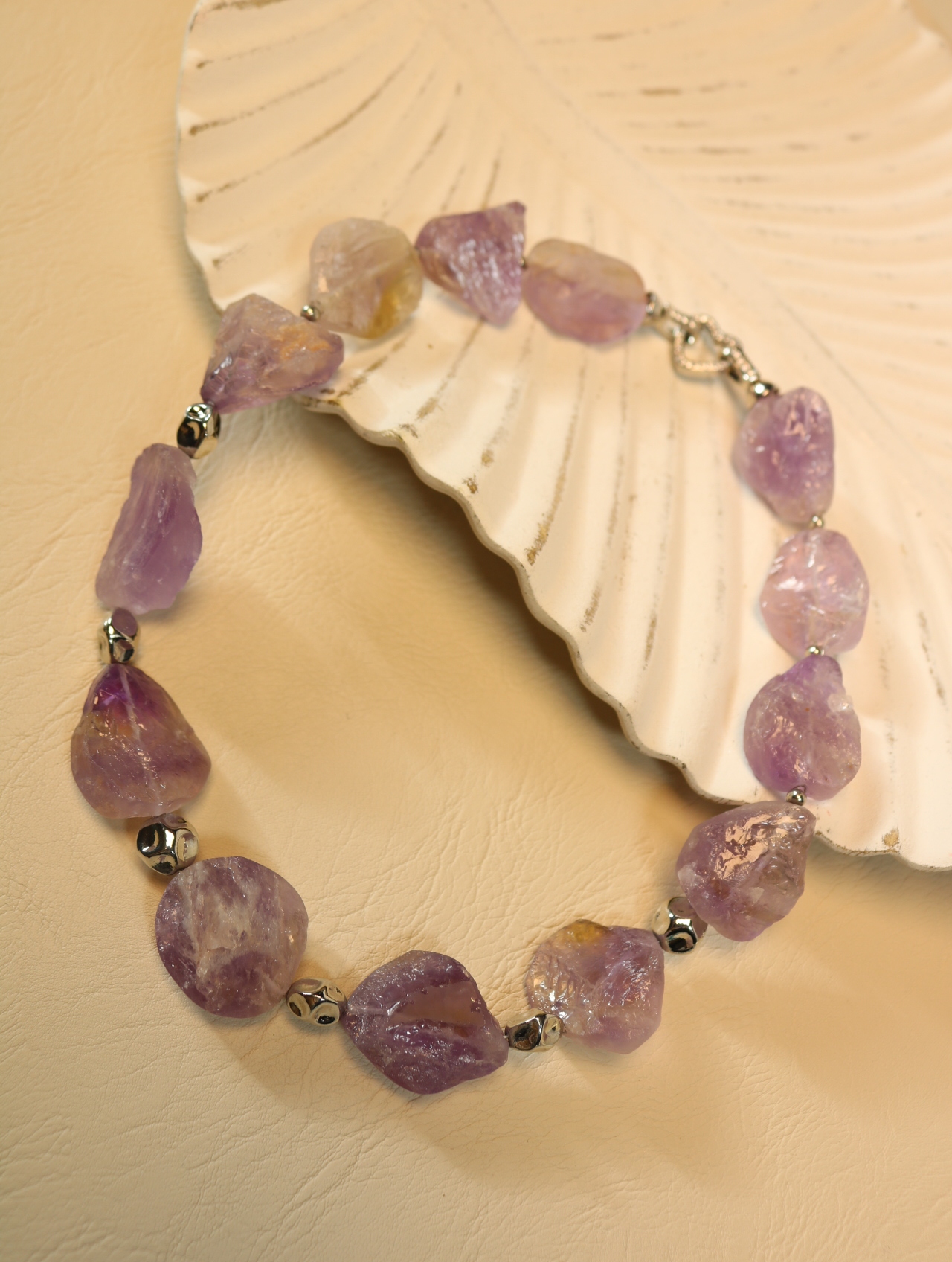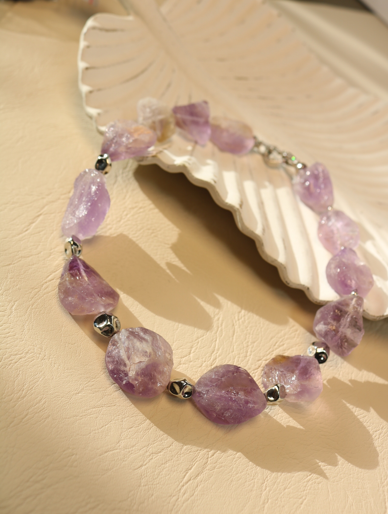 Колье из необработанного лавандового аметиста: крупные природные кристаллы размером около 18–30 мм собраны в яркую линию и разделены благородной металлизированной фурнитурой. Застежка петля-крючок, с сердцем, инкрустированный фианитами. Каждый камень живёт своей фактурой и оттенком — от нежно-дымчатого до насыщенно-фиолетового, так что на шее это украшение выглядит как россыпь маленьких амулетов.