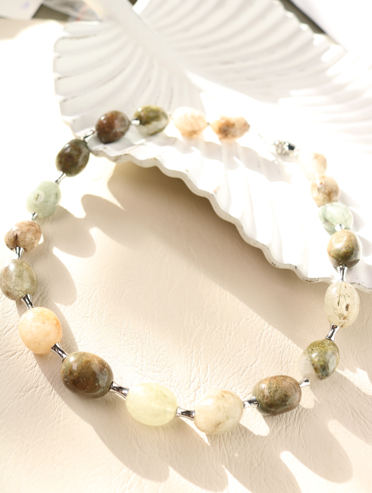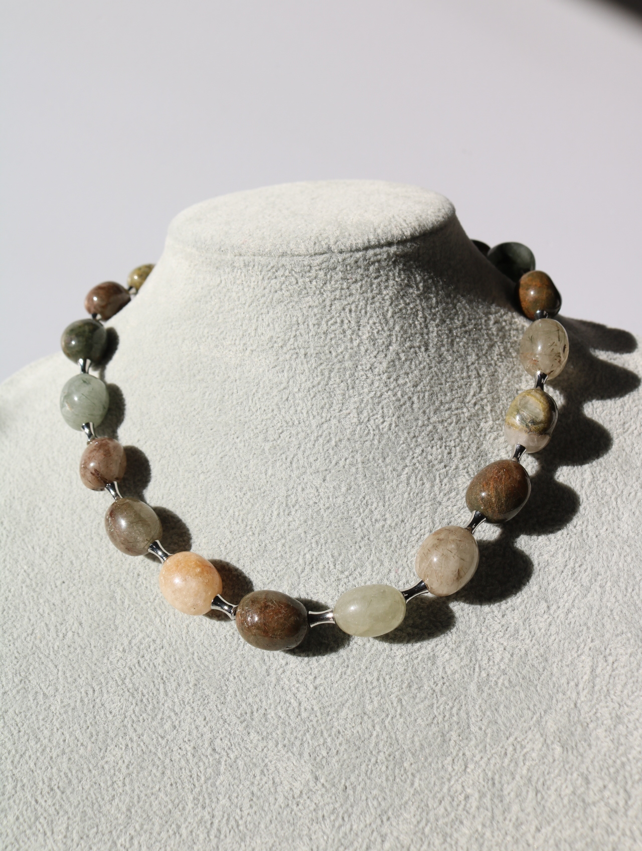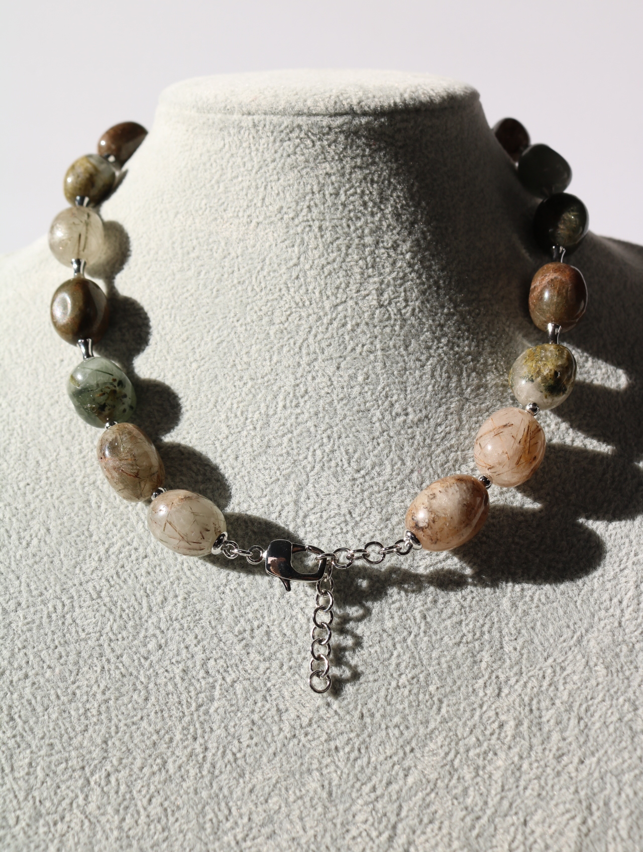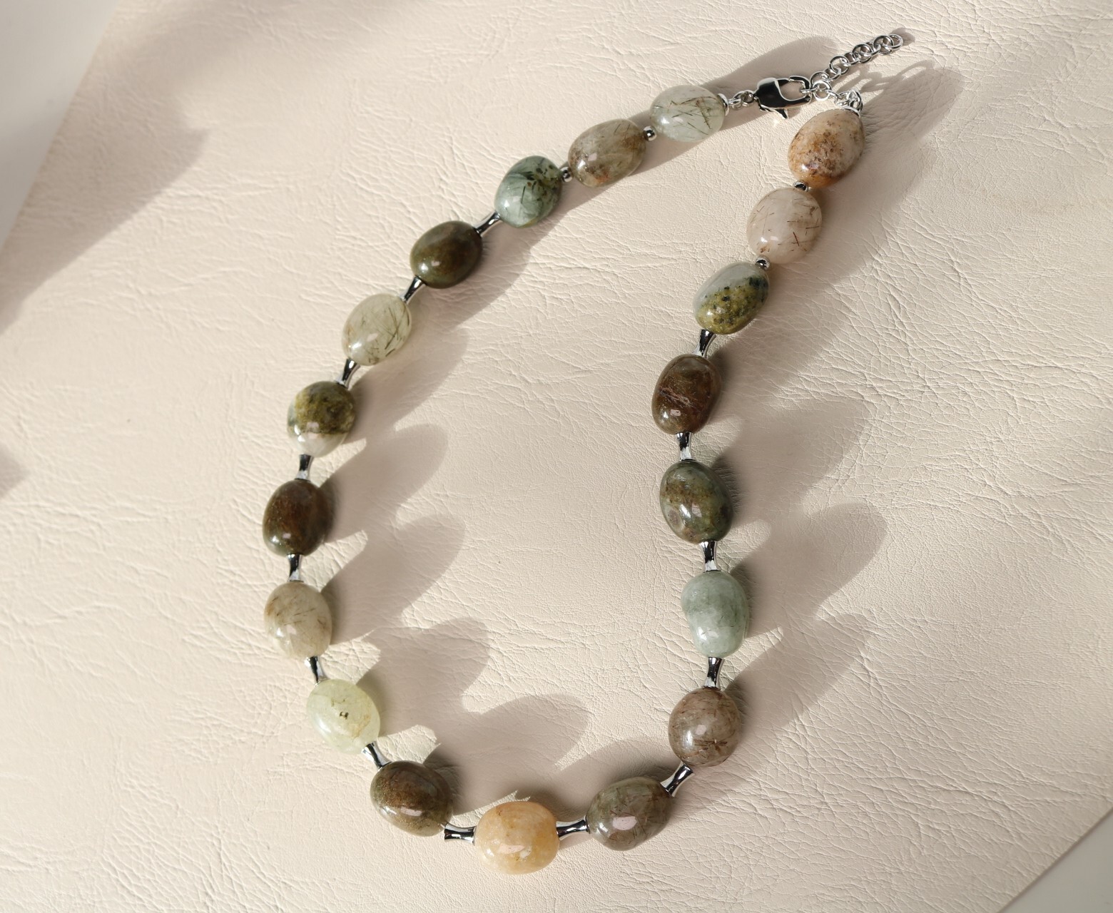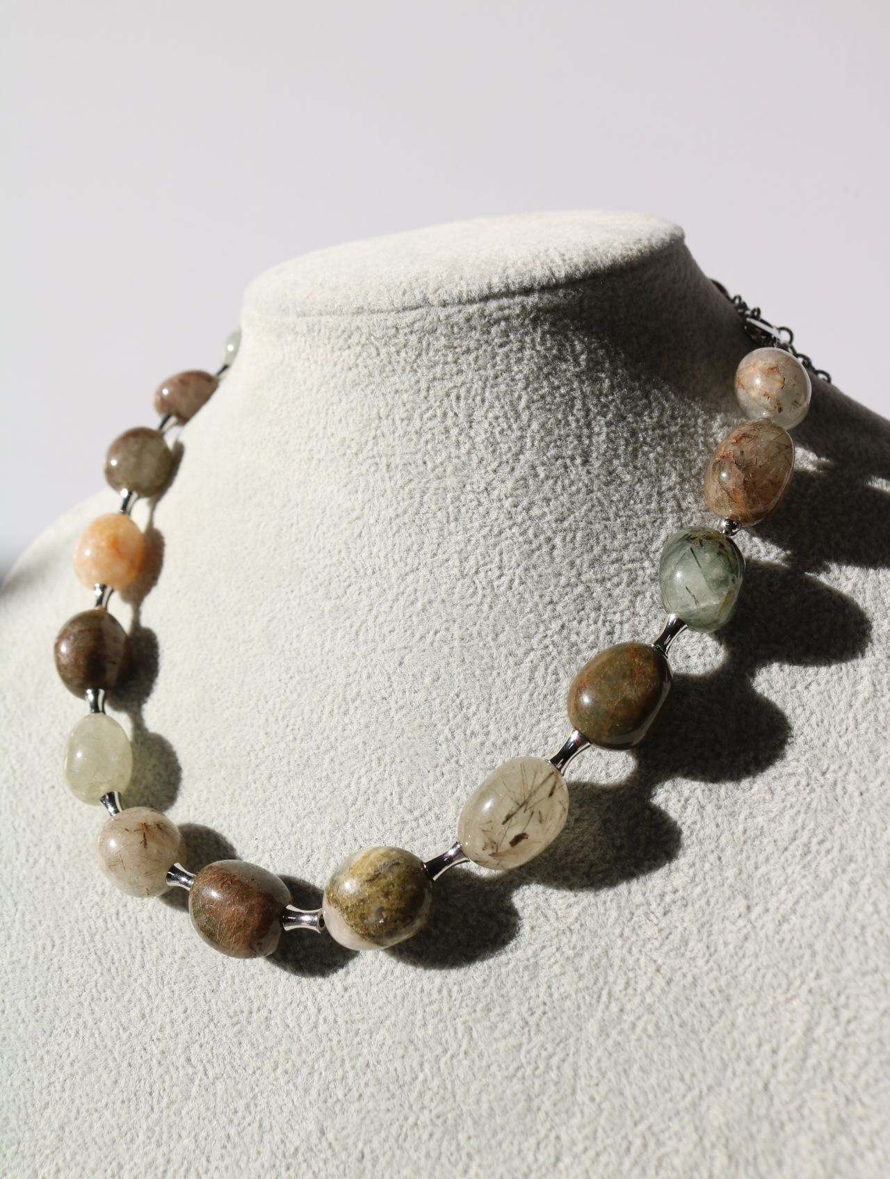 Колье из рутилового кварца в крупной галтовке: каждое зерно – маленькая планета с черными «нитями» внутри. Овальные бусины (примерно 14×12 мм) нанизаны на прочный ювелирный тросик, между ними — аккуратные вставки из металла под серебро, которые подчеркивают глубину природных оттенков. Карабин с удлинительной цепочкой позволяет легко подстроить посадку по линии ключиц. Украшение из натуральных камней от «Викторинэль» для тех, кто любит живую, немного «дикую» красоту минералов и ощущение талисмана, всегда рядом.