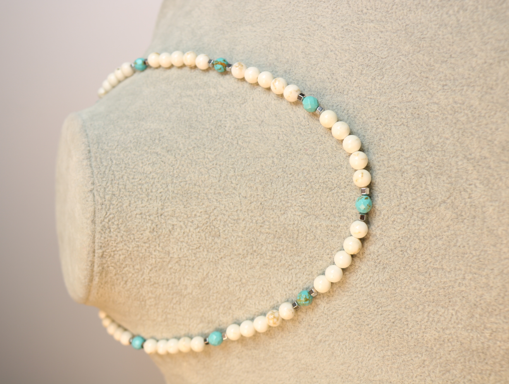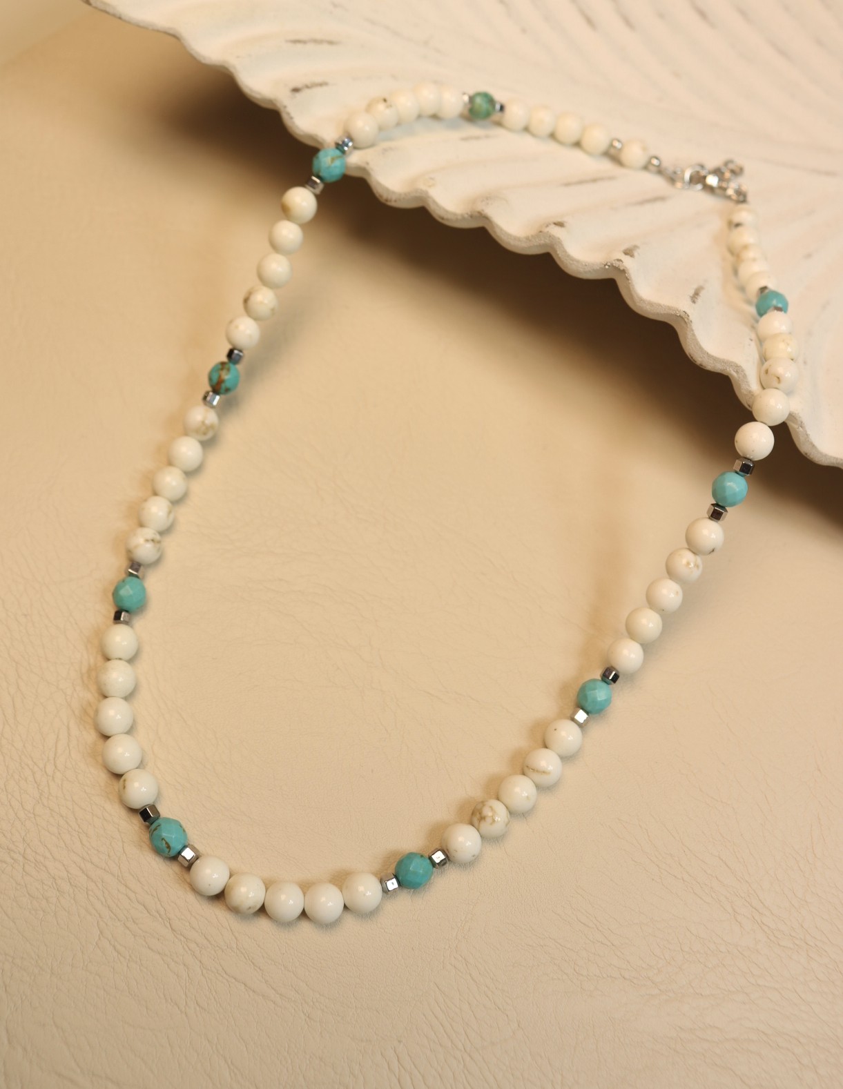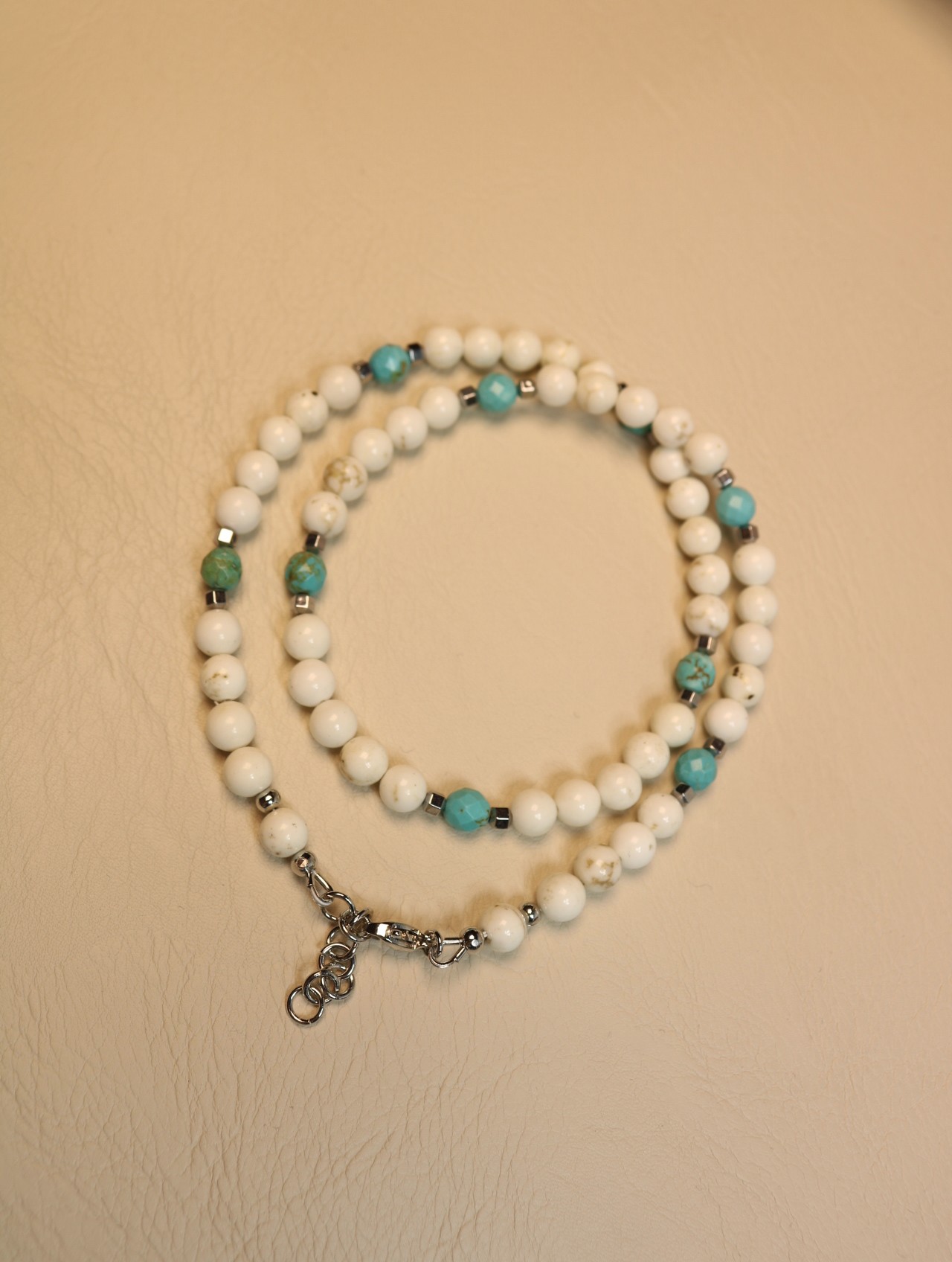 Это колье собрано из турквенита 6 мм в двух оттенках: молочный (мягкий, спокойный) и окрашенный под бирюзу (яркий, но не кричащий). Контраст получается чистый и дорогой по впечатлению: белый камень “подсвечивает” кожу, а бирюзовые акценты добавляют энергии и цвета. Между камнями — металлические вставки серебристого тона для ритма и лёгкого блеска.