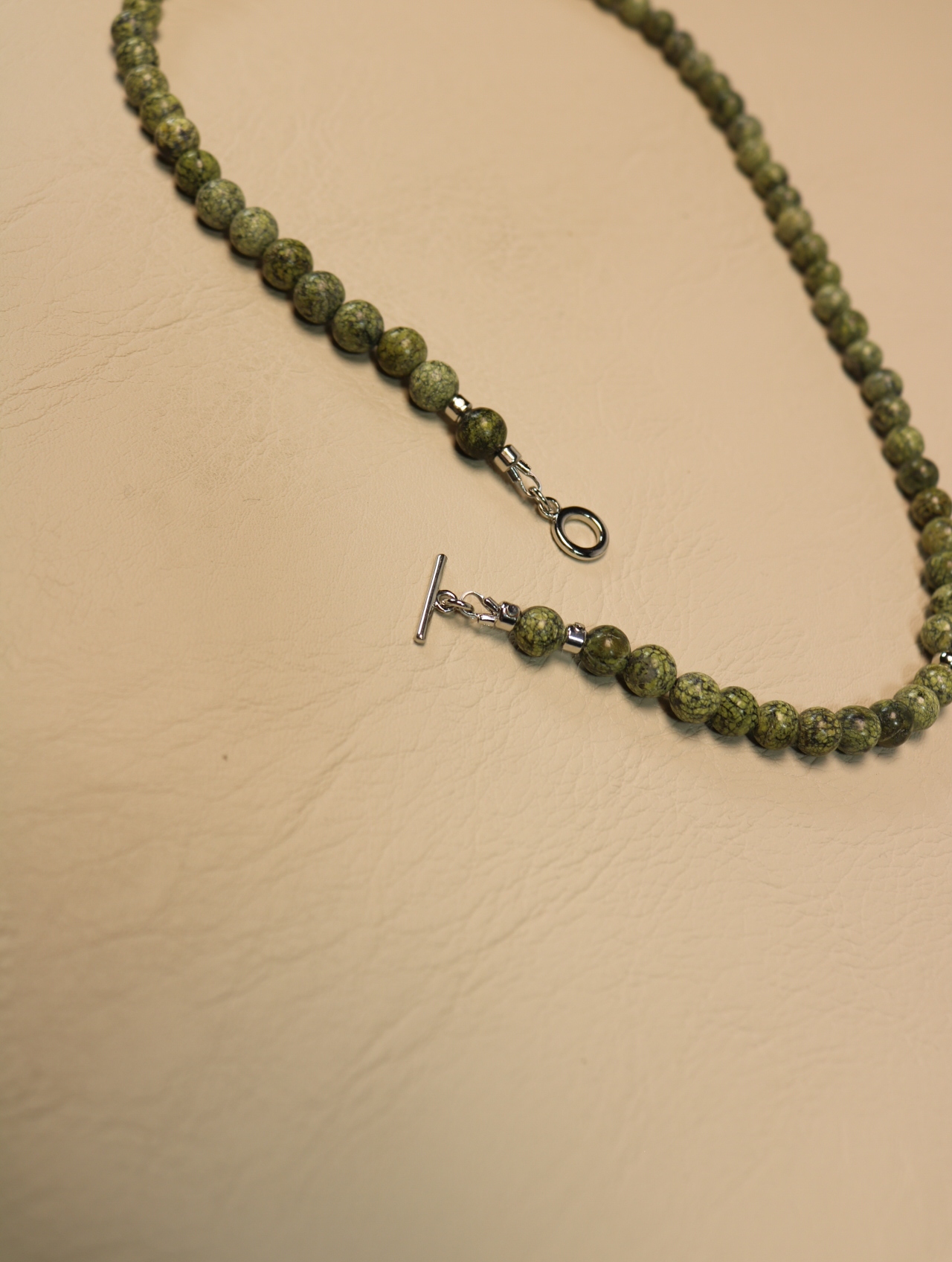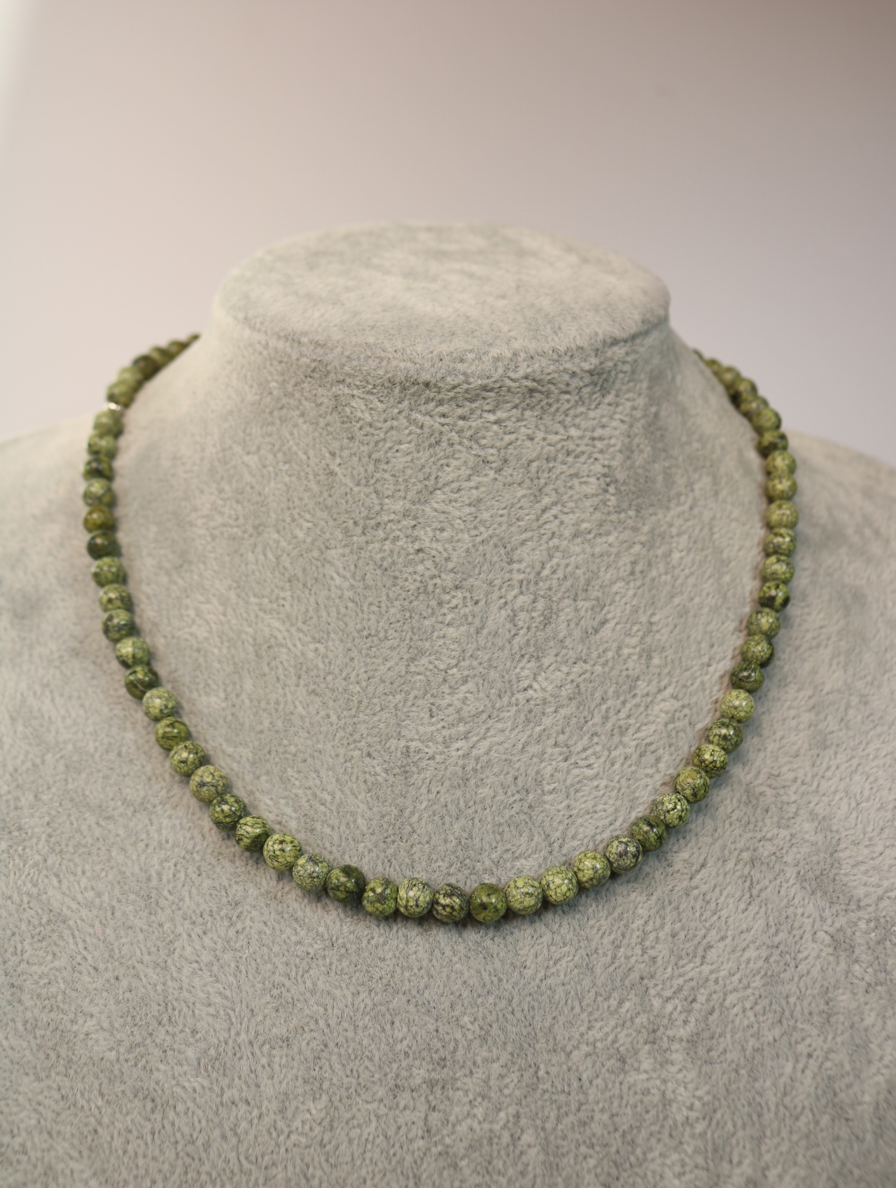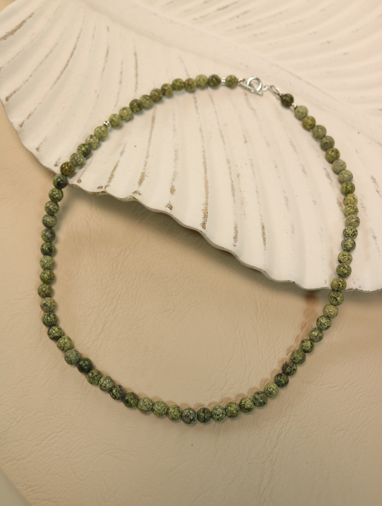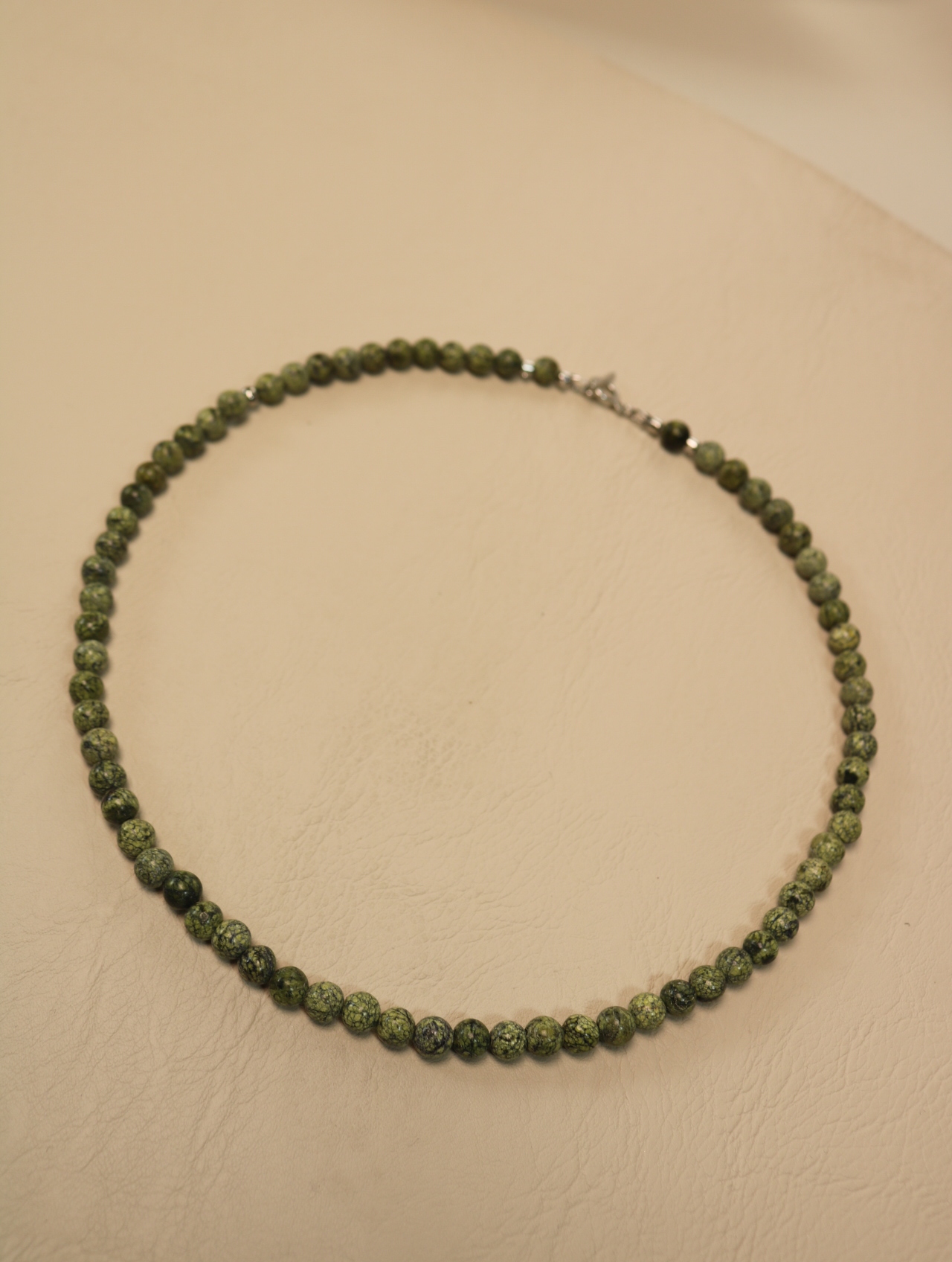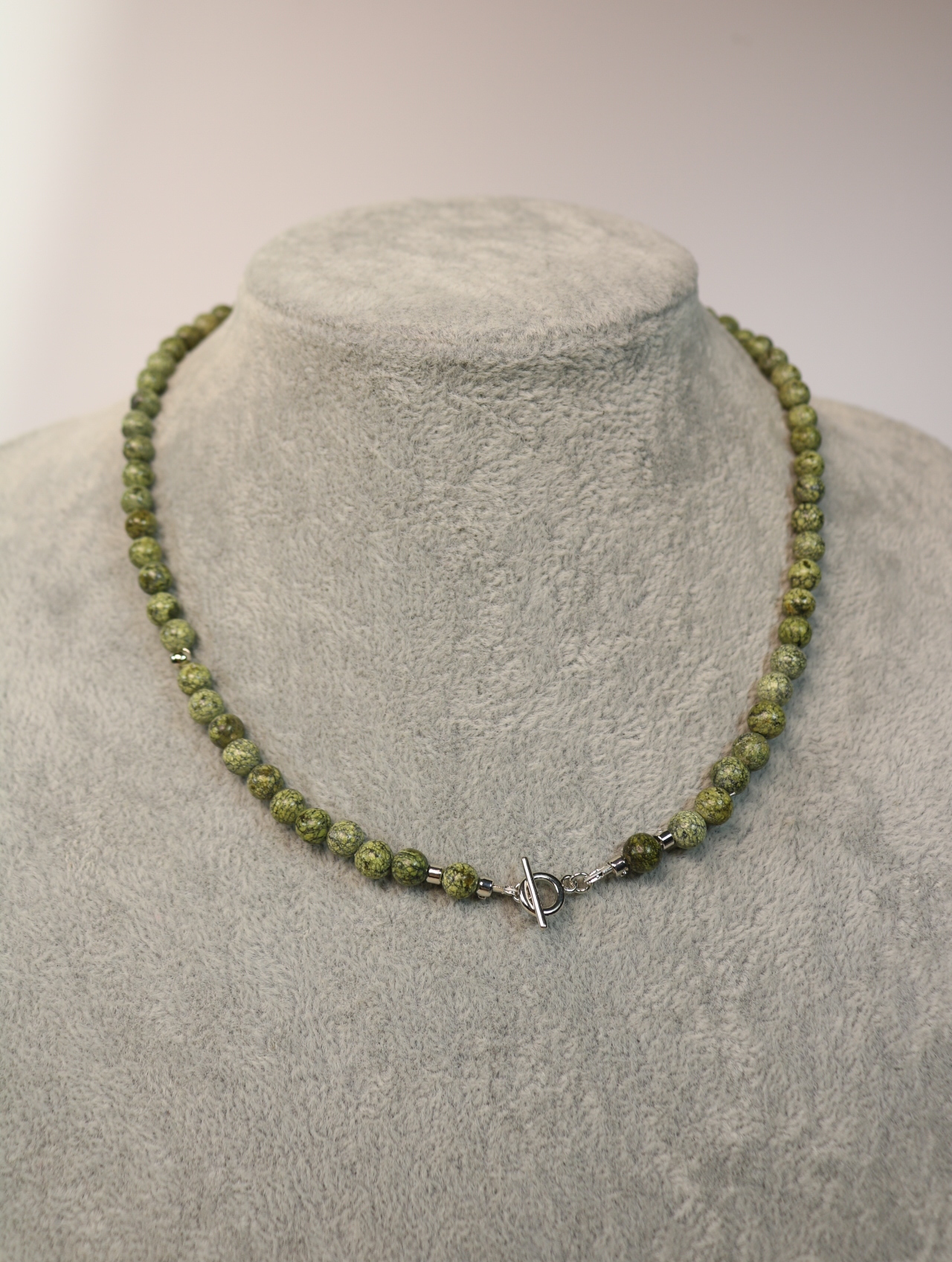 Аккуратный чокер из натурального змеевика диаметром 6 мм. Тёплый болотный зелёный оттенок с тёмными вкраплениями напоминает мох на камнях и хвойный лес после дождя. Бусины собраны на прочный ювелирный тросик, между ними — аккуратные металлические разделители с родиевым покрытием (Южная Корея), застёжка-тоггл удобна и надёжна. Лаконичное украшение на каждый день, которое легко вписывается и в офис, и в casual-образы.