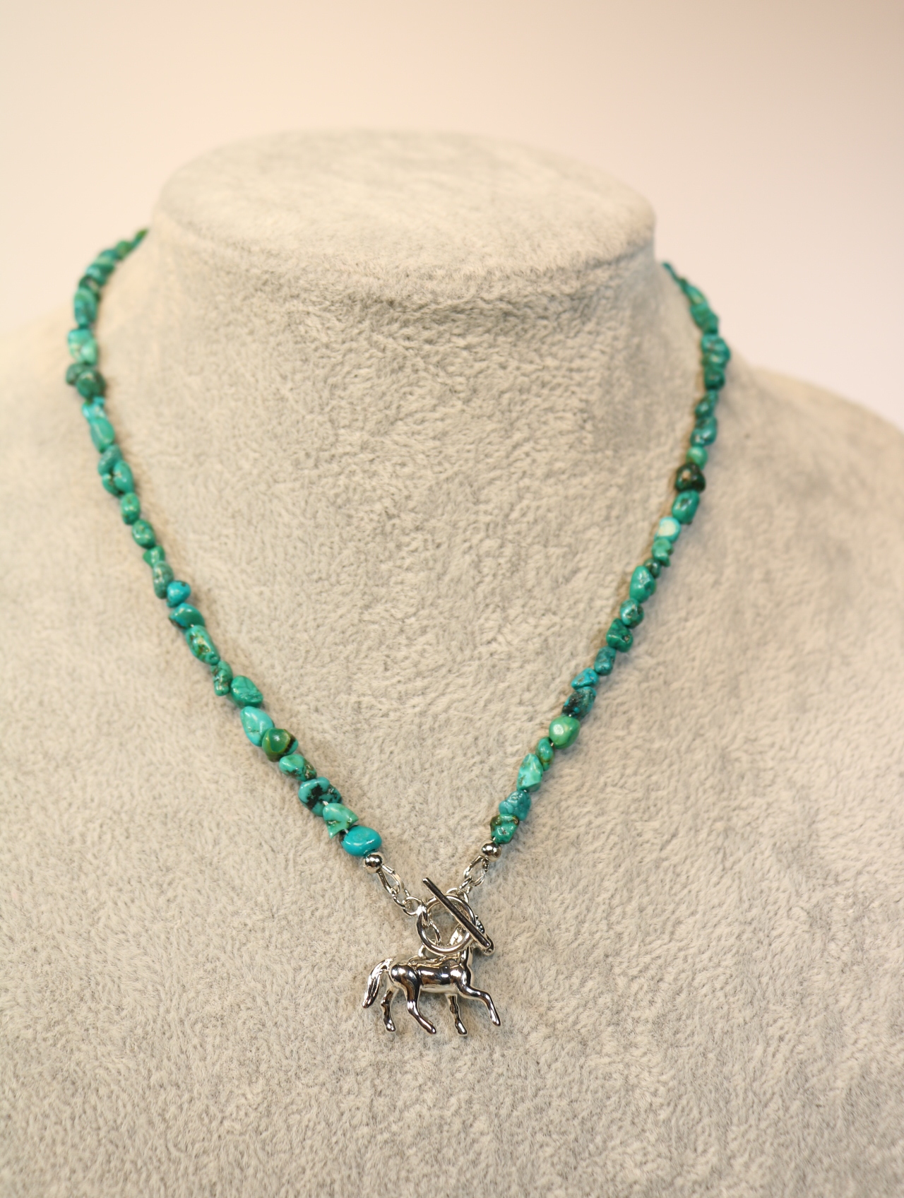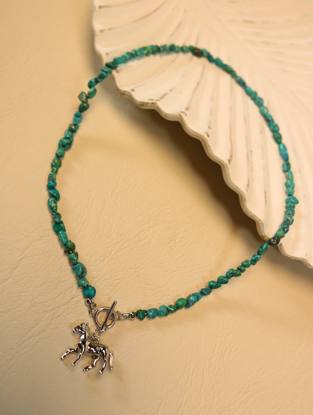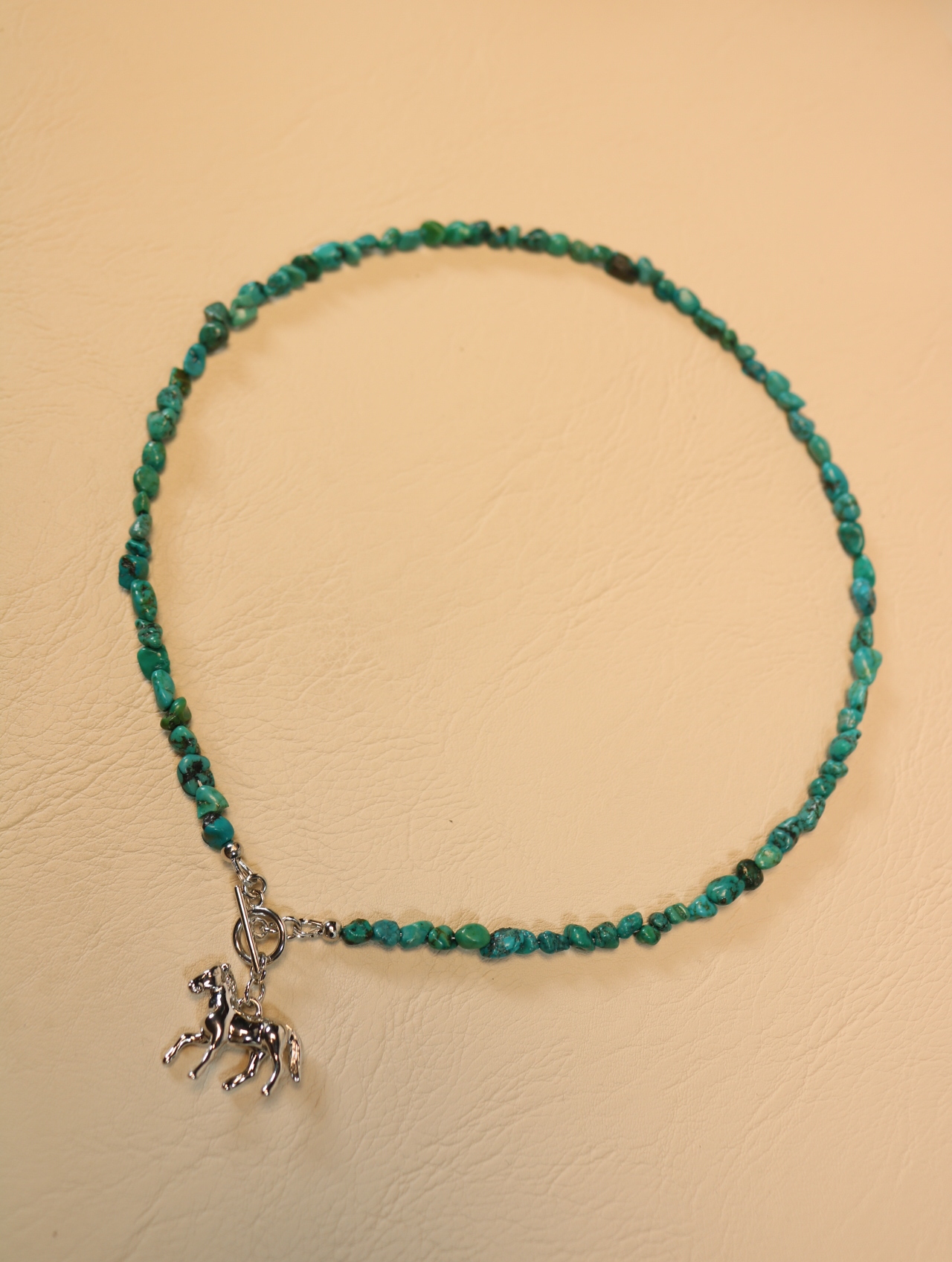 Колье из крошки натуральной бирюзы с подвеской-лошадью — украшение про движение вперёд. Живой неровный камень даёт красивую фактуру и ощущение «дикой» природы, а серебристая лошадь у застёжки-тоггл напоминает: главное — не стоять на месте.