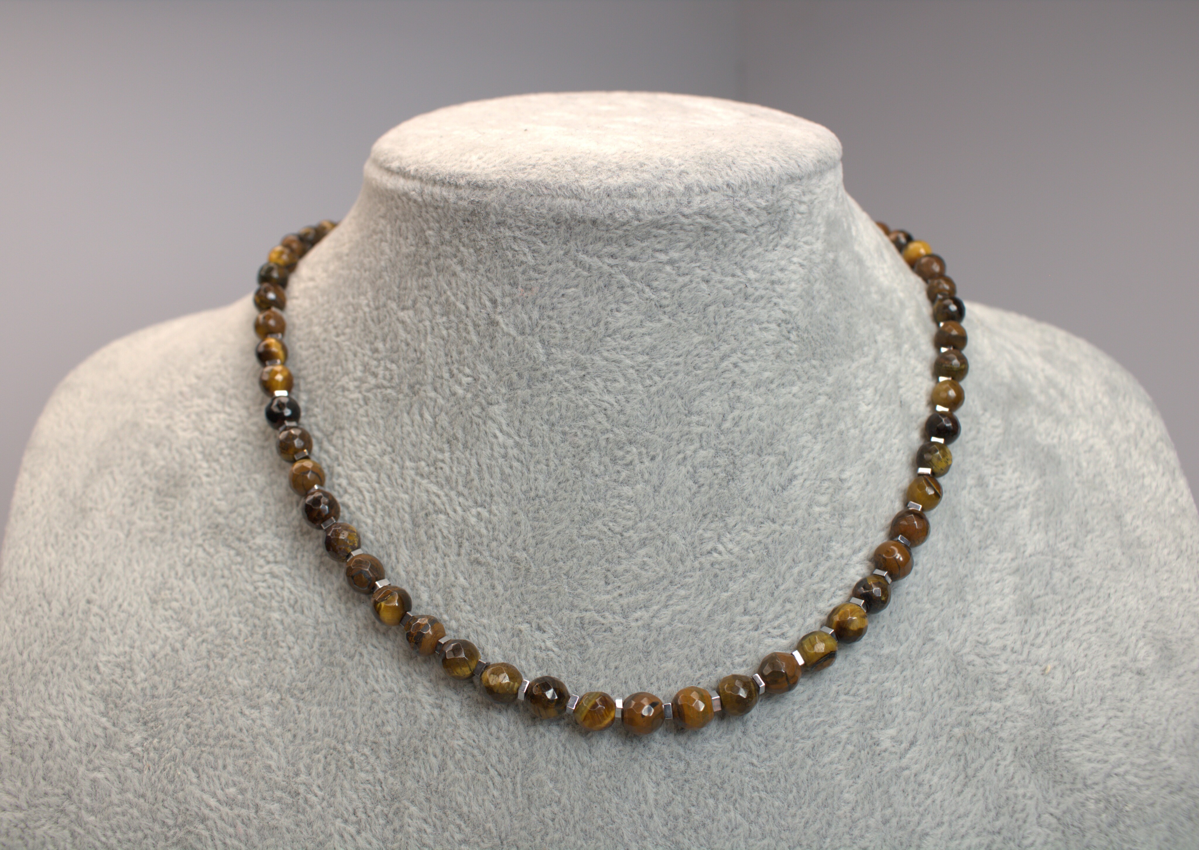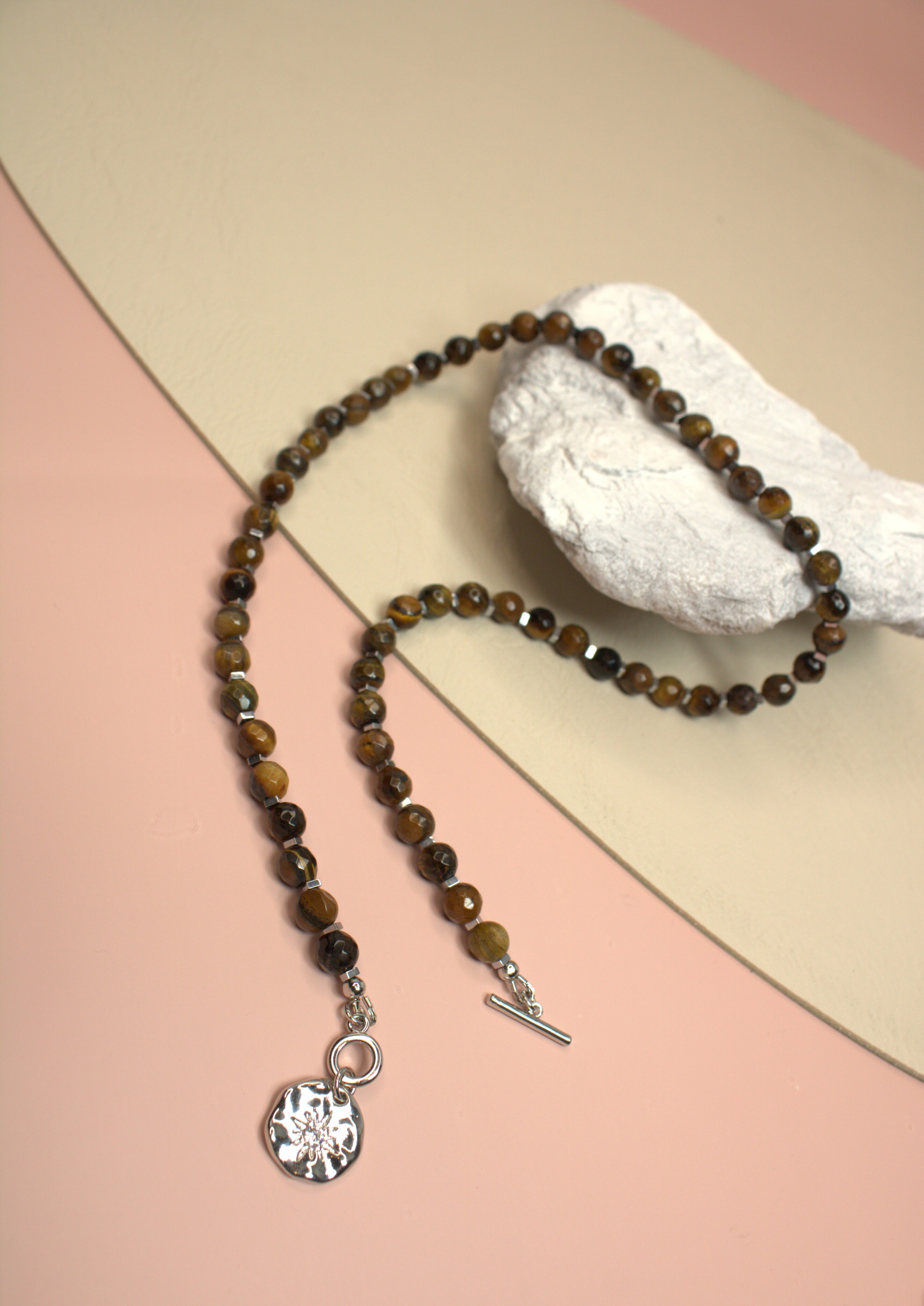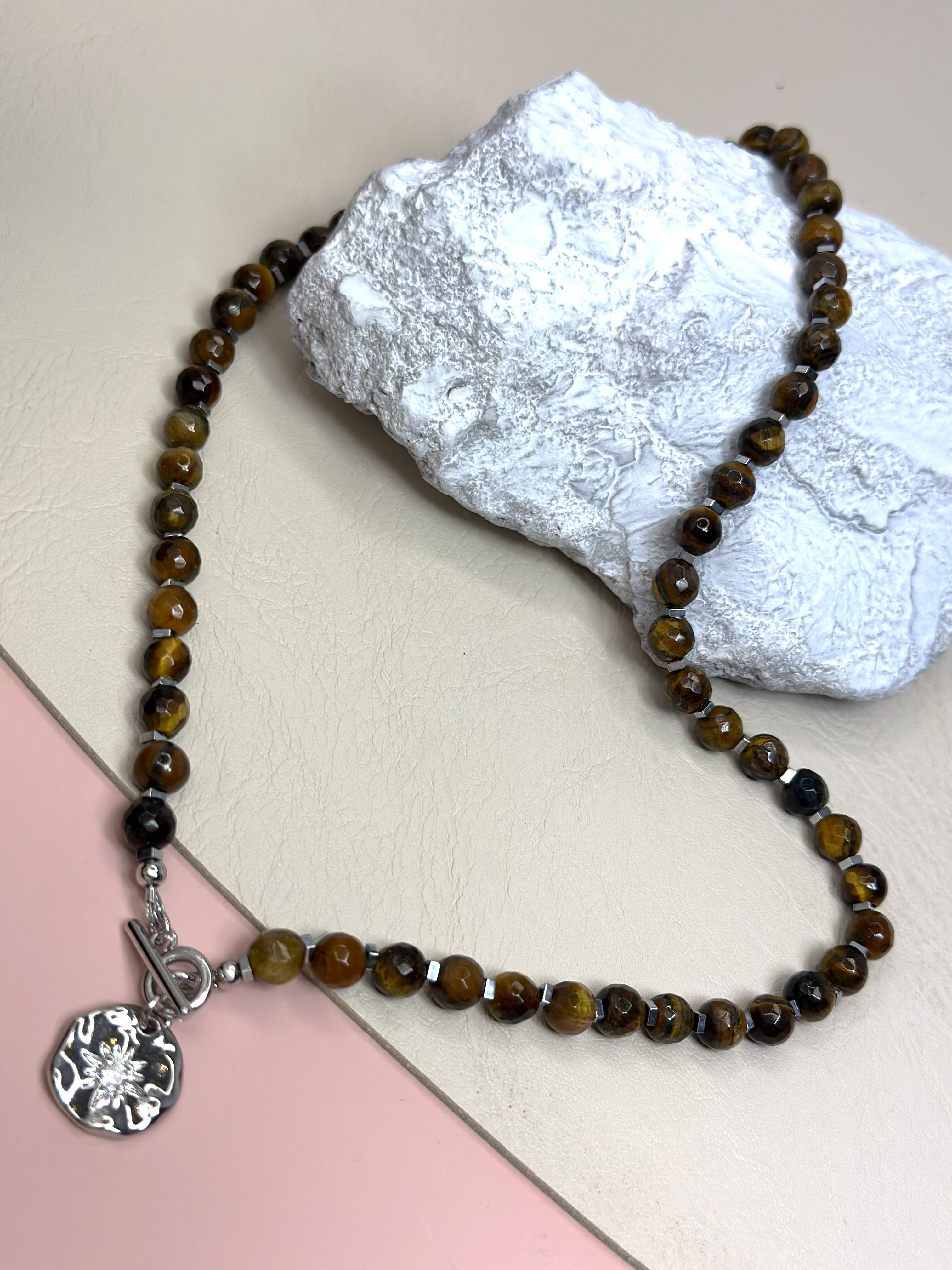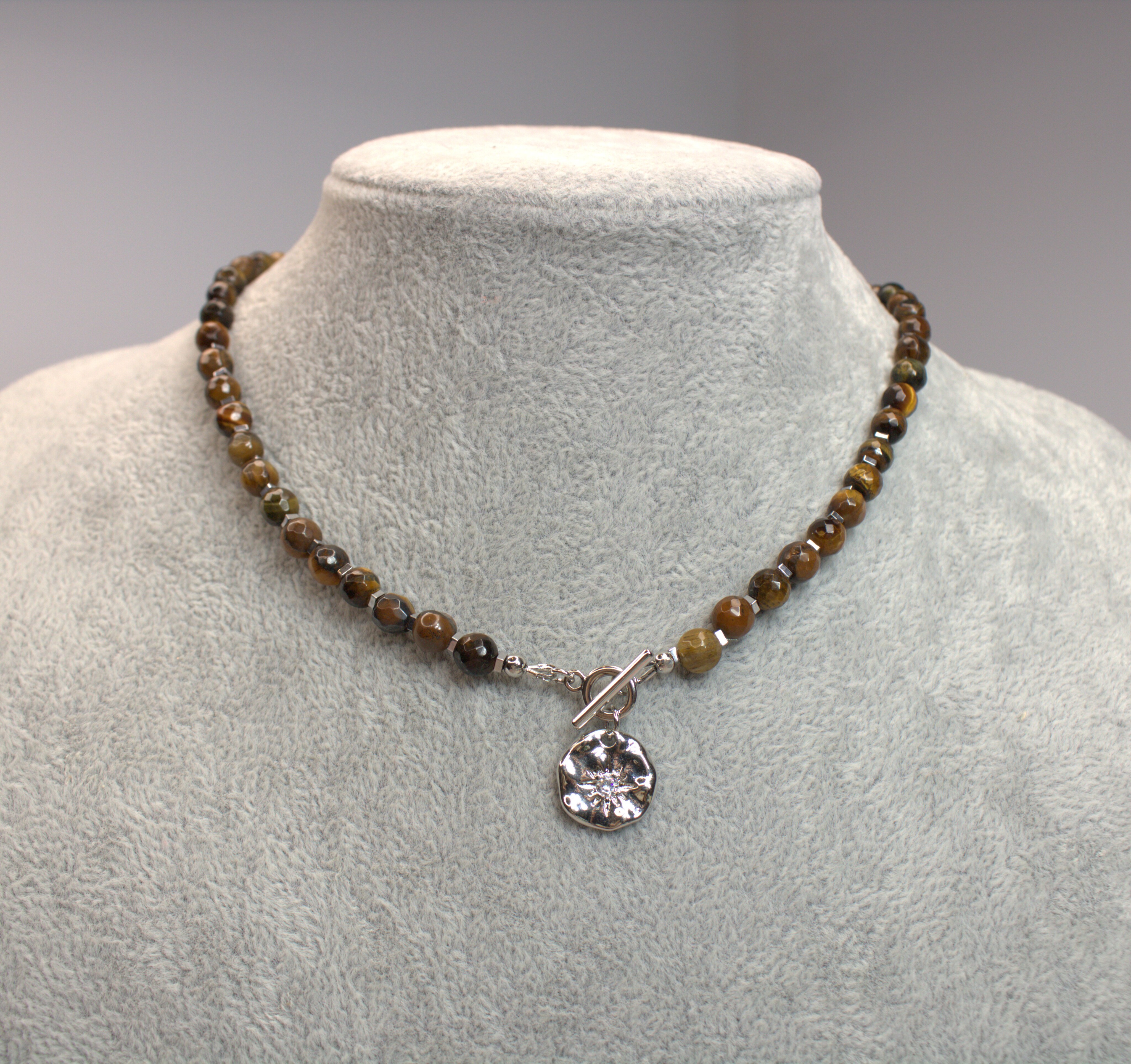 Материалы: натуральный тигровый глаз (фасет 6 мм), гематит 2х2 мм, подвеска-монетка со звездой и фианитом, премиальная корейская фурнитура под серебро, застёжка-тогл.