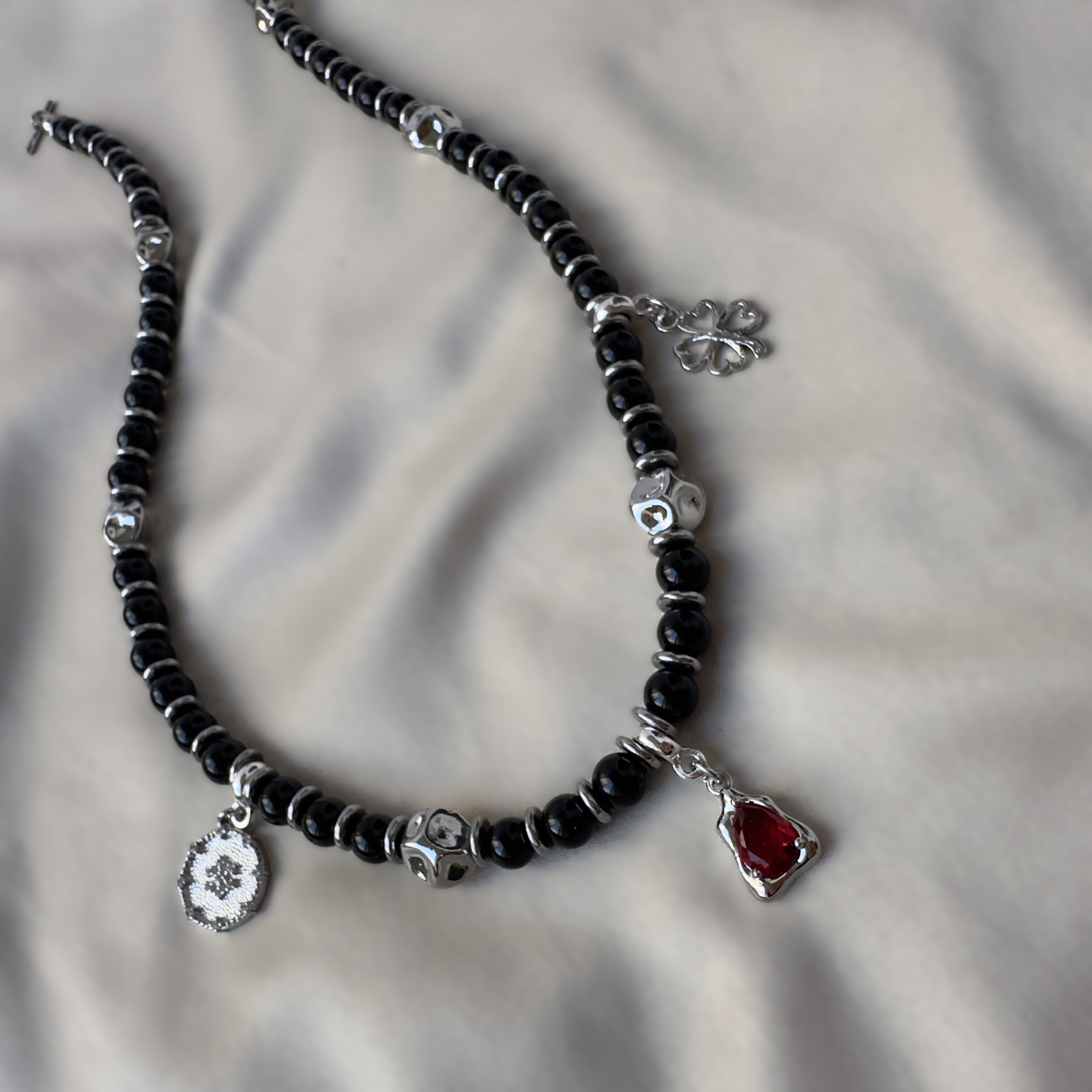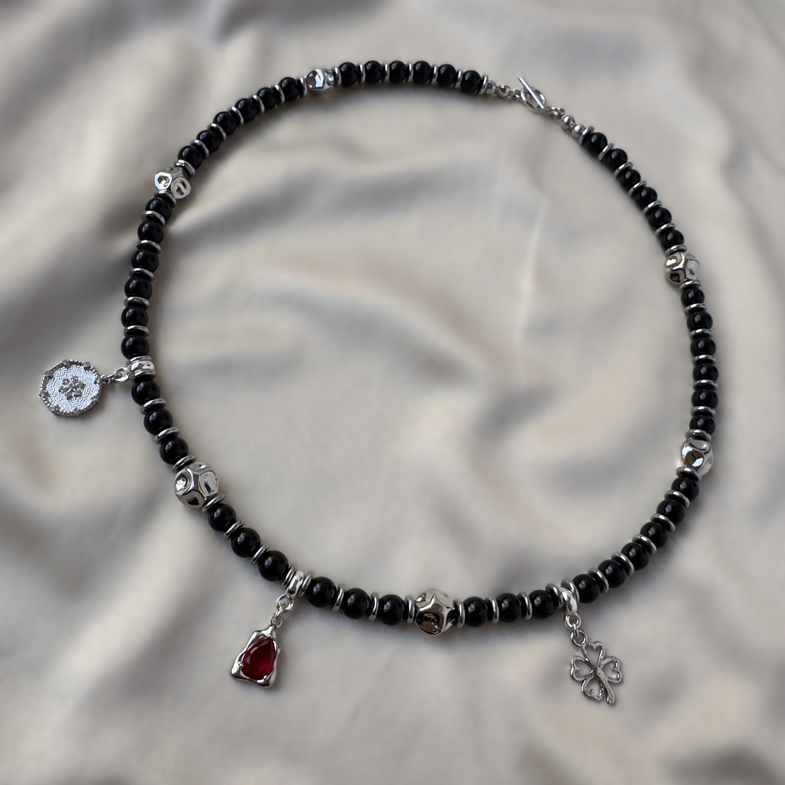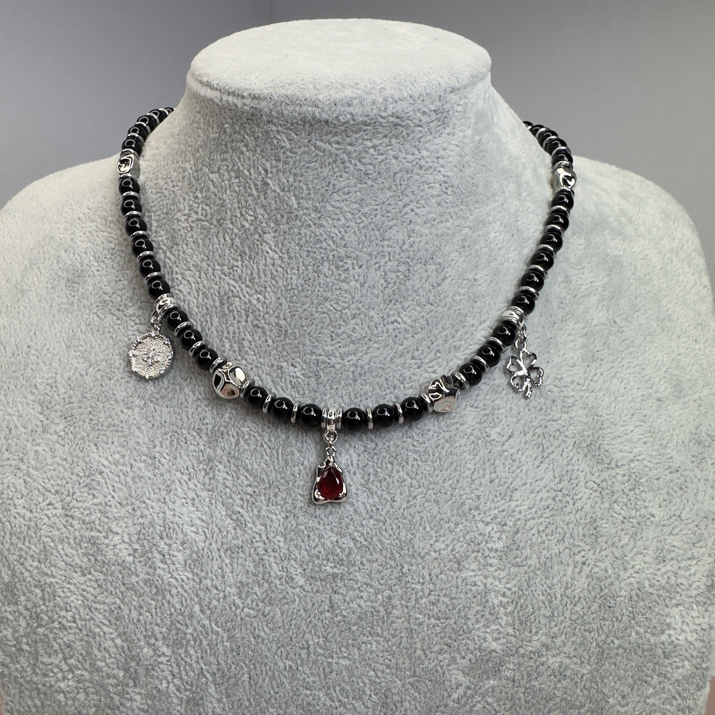 Вечерний лук: открытое платье, бархат, чёрный топ или корсет — гематит и агат подчёркивают блеск кожи и глубину взгляда.