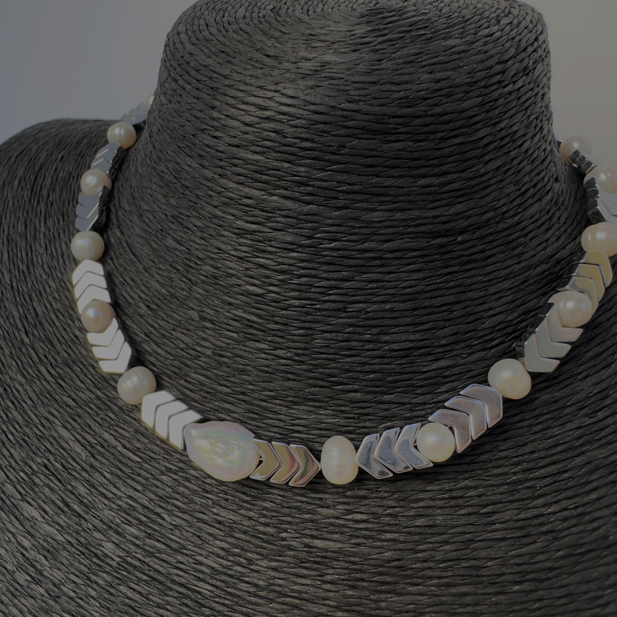 Чокер из натурального речного жемчуга и гематита, с барочной жемчужиной в центре. Длина 40 см + 4 см цепочка на замочке для регулирования размера