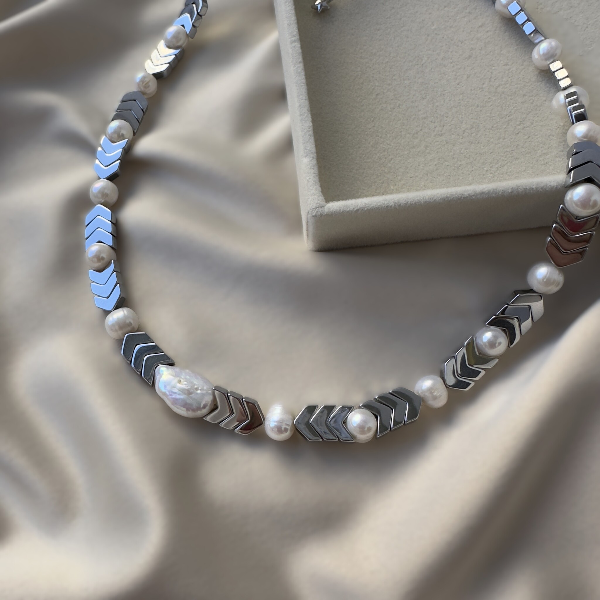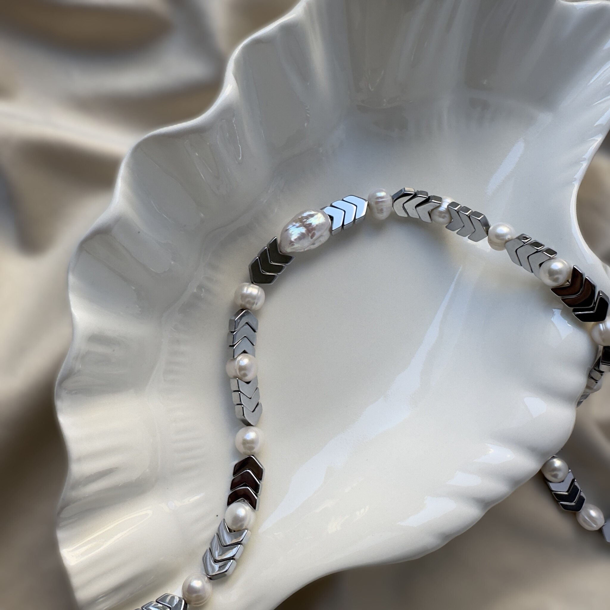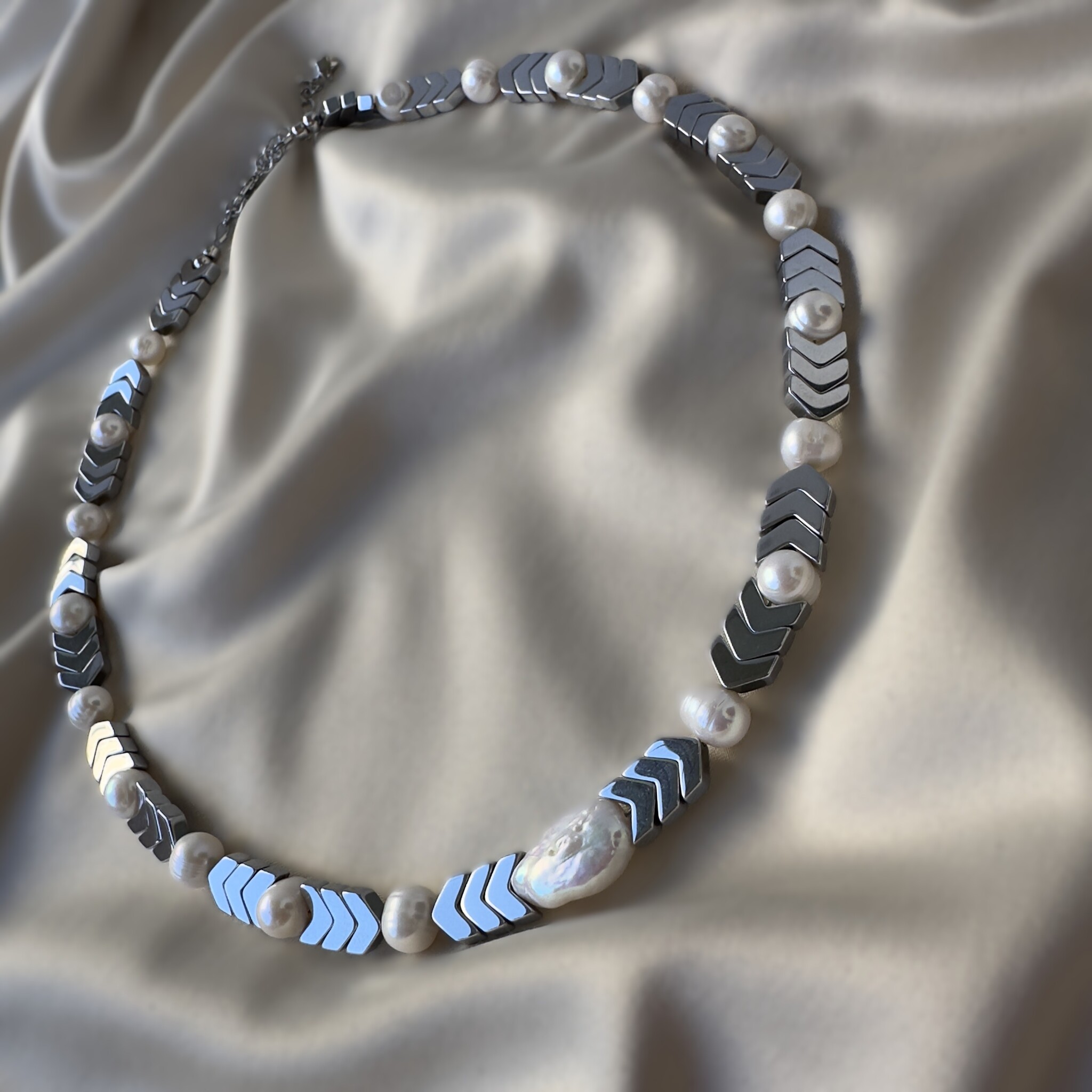 Это украшение создано для женщины, которая сочетает мягкость и силу. Жемчуг дарит нежность и свет, а гематит защищает и придаёт внутреннюю опору. Вместе они образуют идеальный баланс противоположностей.