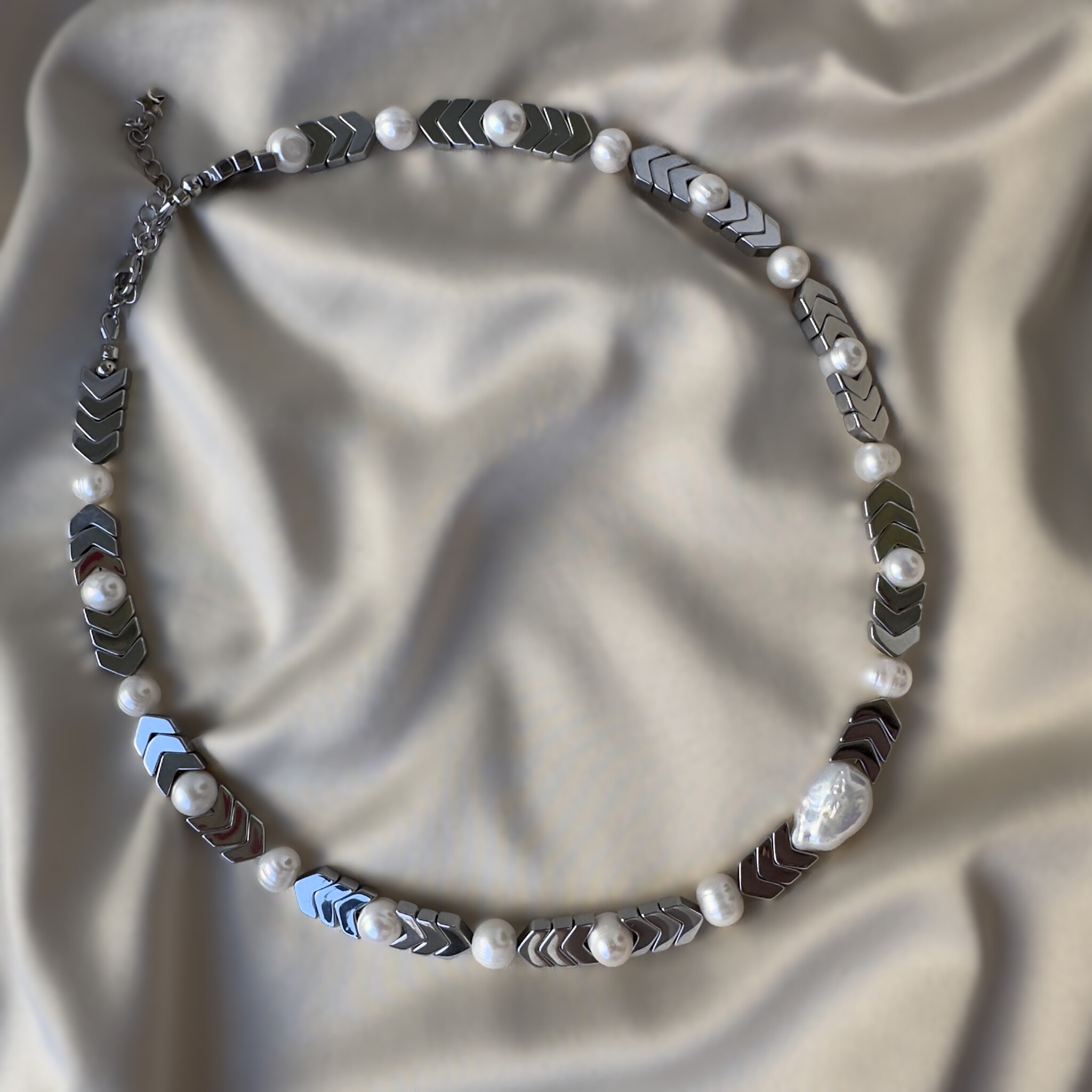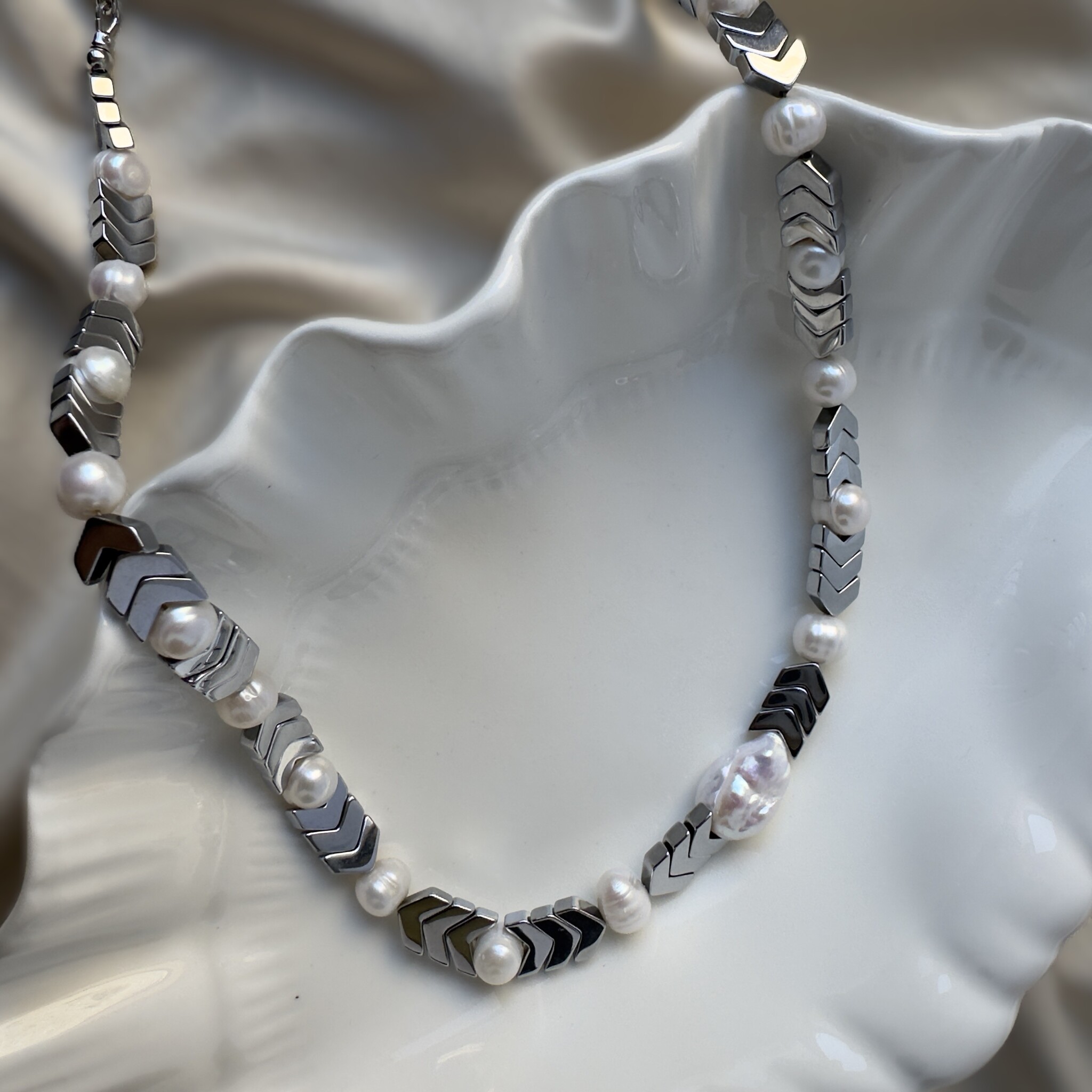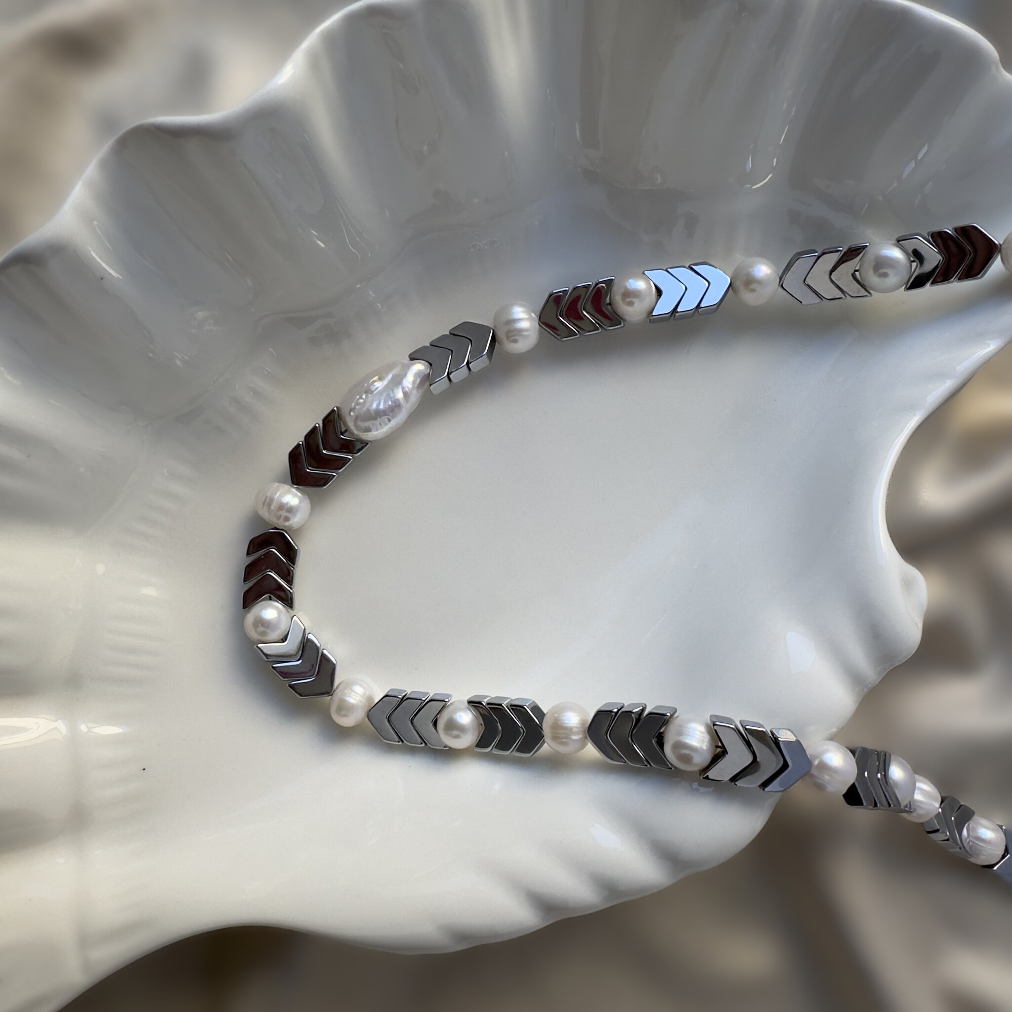 Это украшение создано для женщины, которая сочетает мягкость и силу. Жемчуг дарит нежность и свет, а гематит защищает и придаёт внутреннюю опору. Вместе они образуют идеальный баланс противоположностей.