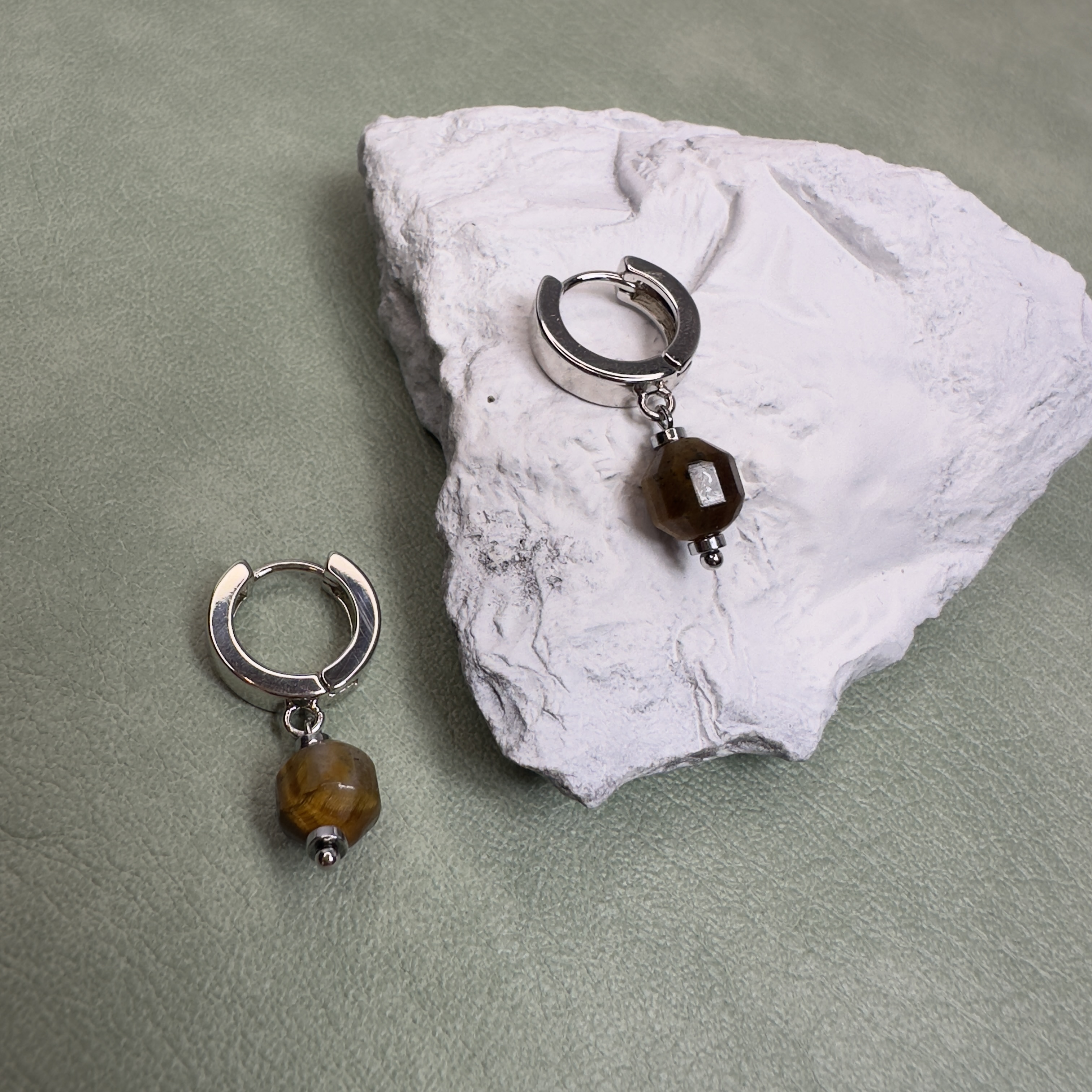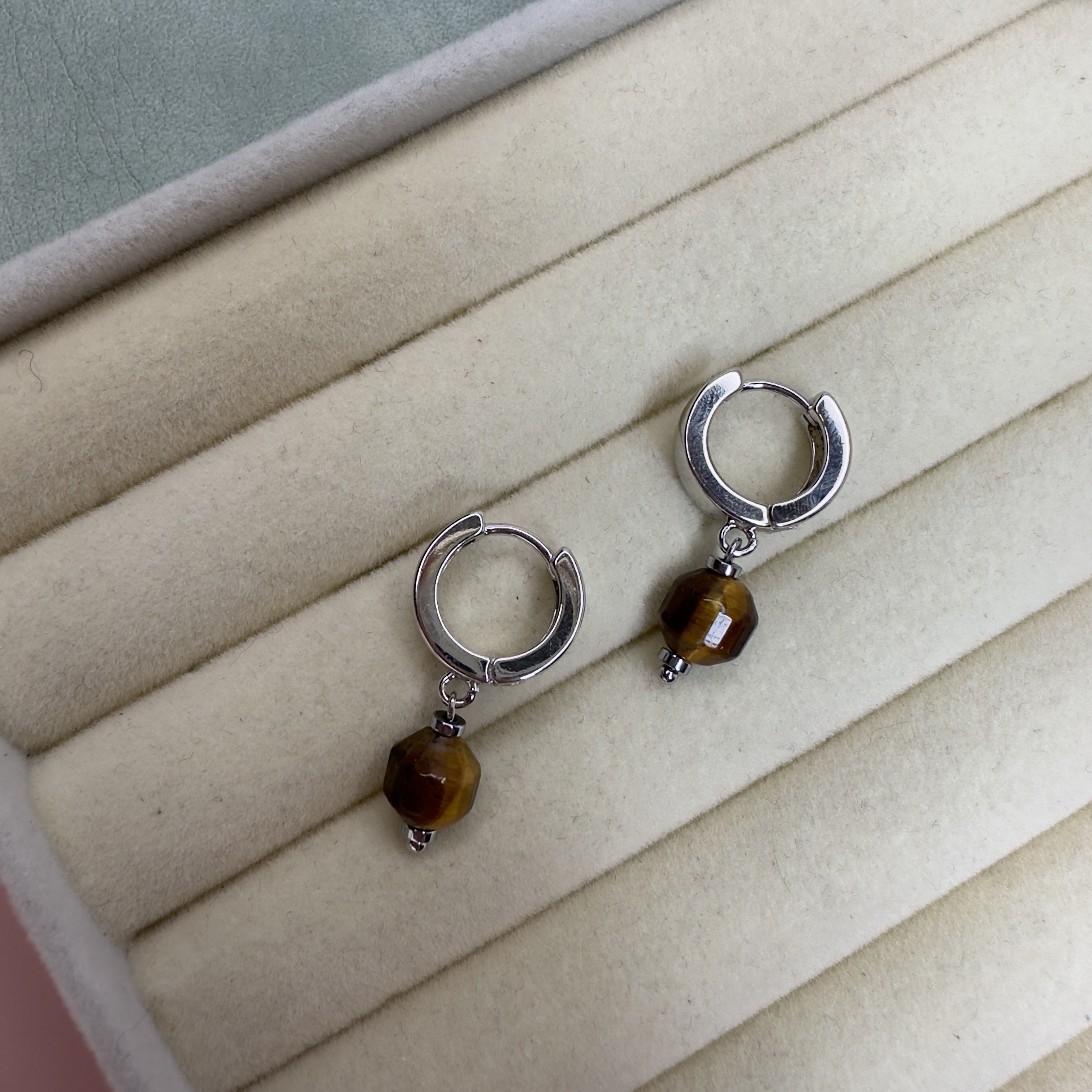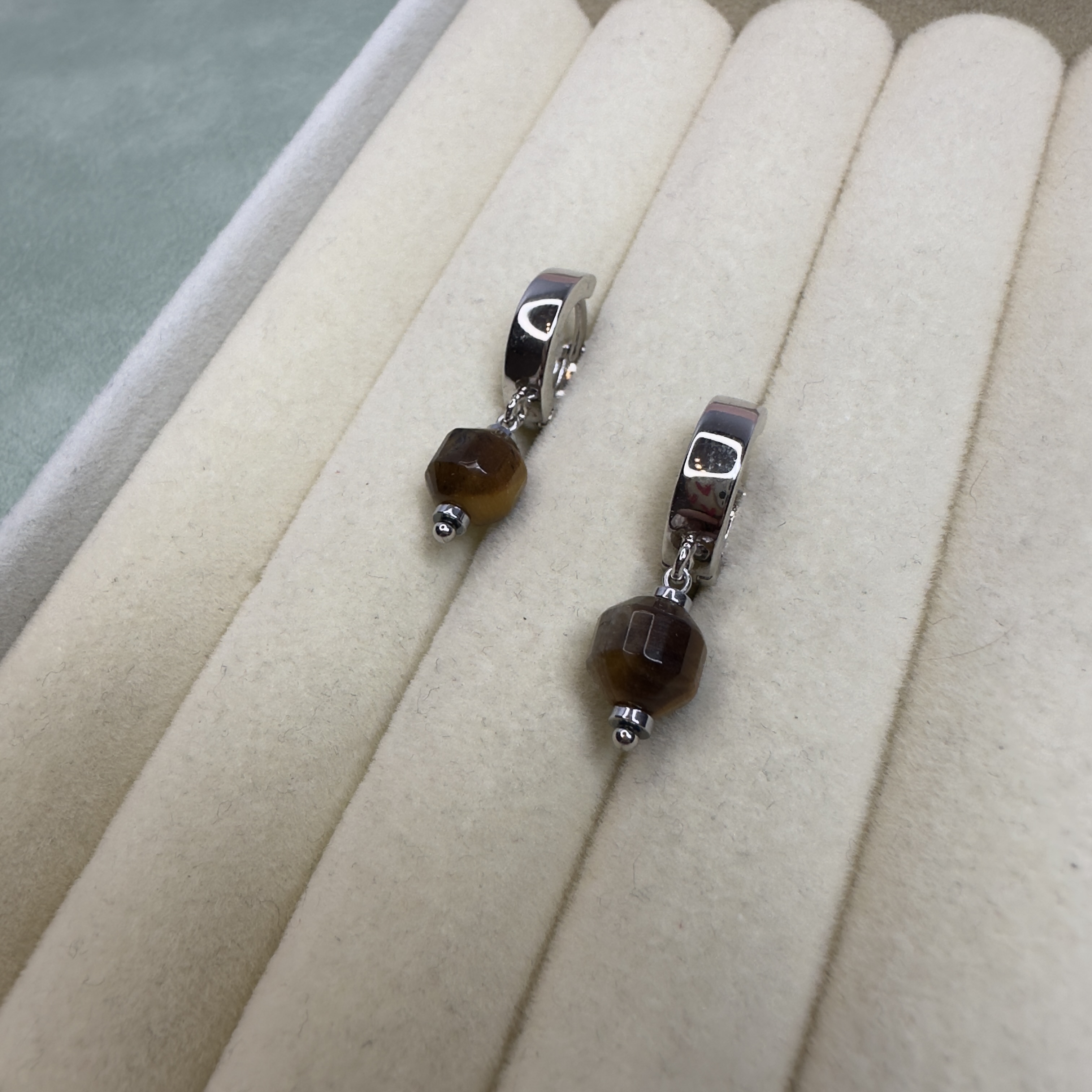 К каждому конго подвешена гранёная бусина 8 мм натурального тигрового глаза. Тёплый коричнево-медовый оттенок камня с живыми переливами подчёркивает глаза и красиво сочетается и с золотистыми, и с холодными оттенками в гардеробе.