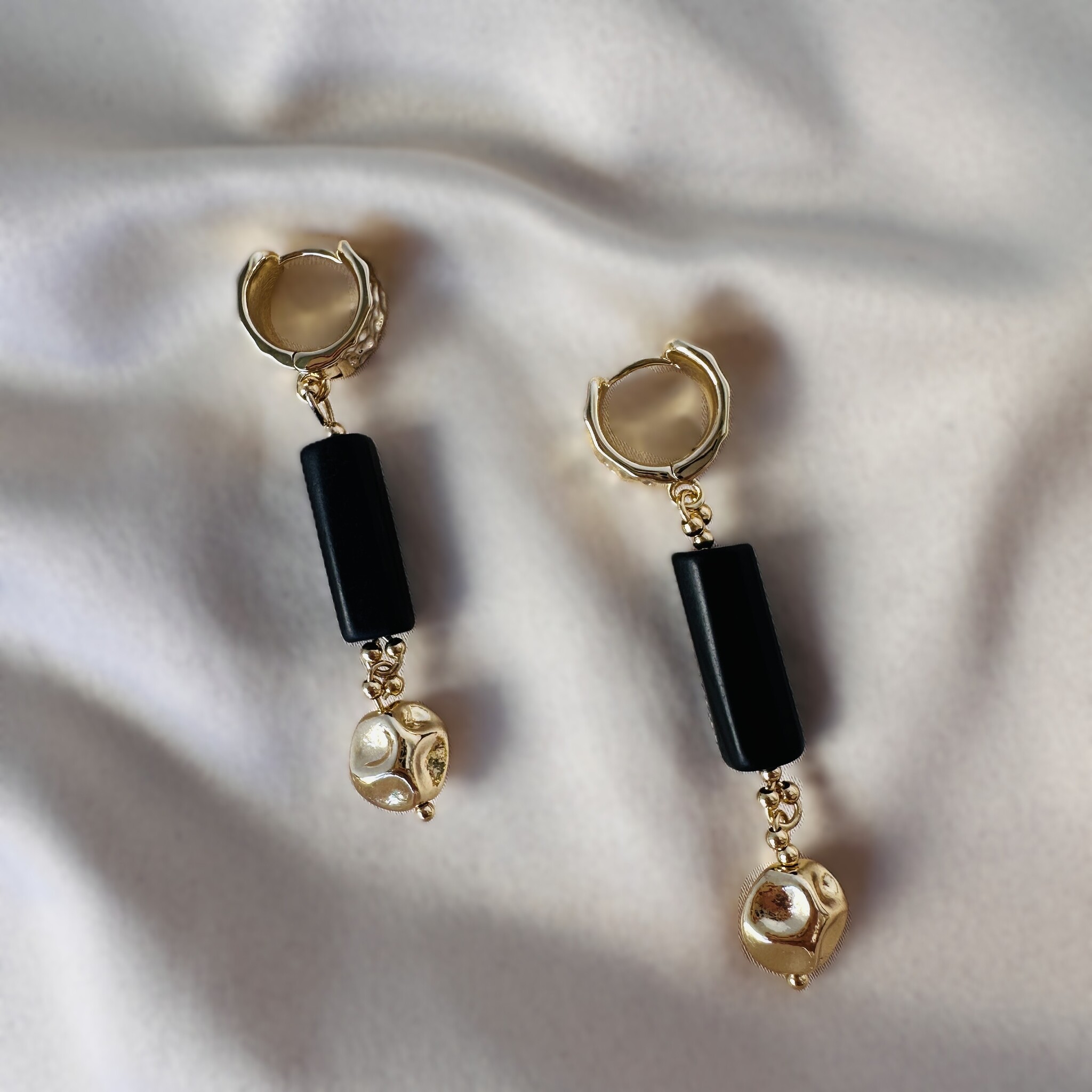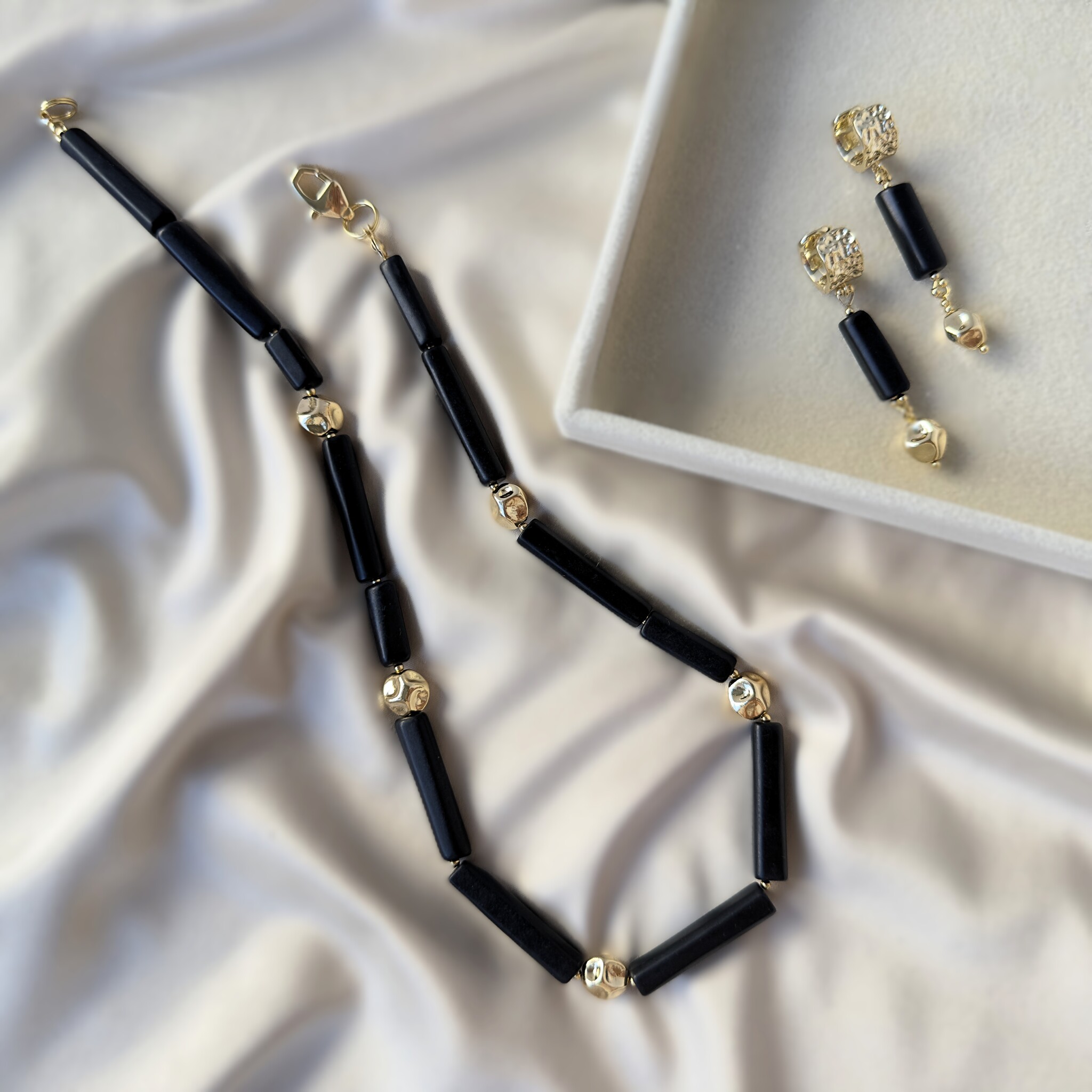 Повседневный образ: чёрные джинсы, белая рубашка, минималистичный акцент в виде этого комплекта.