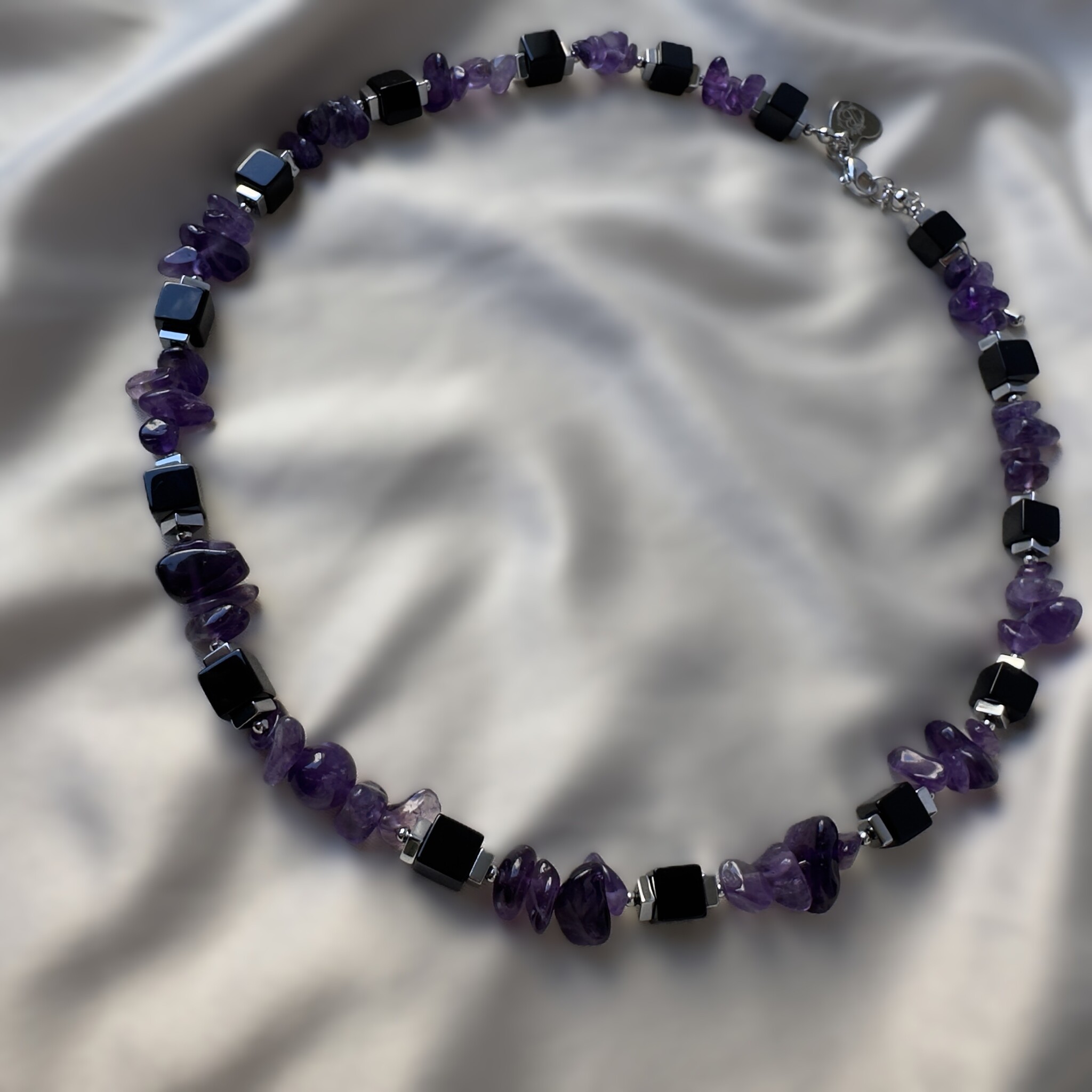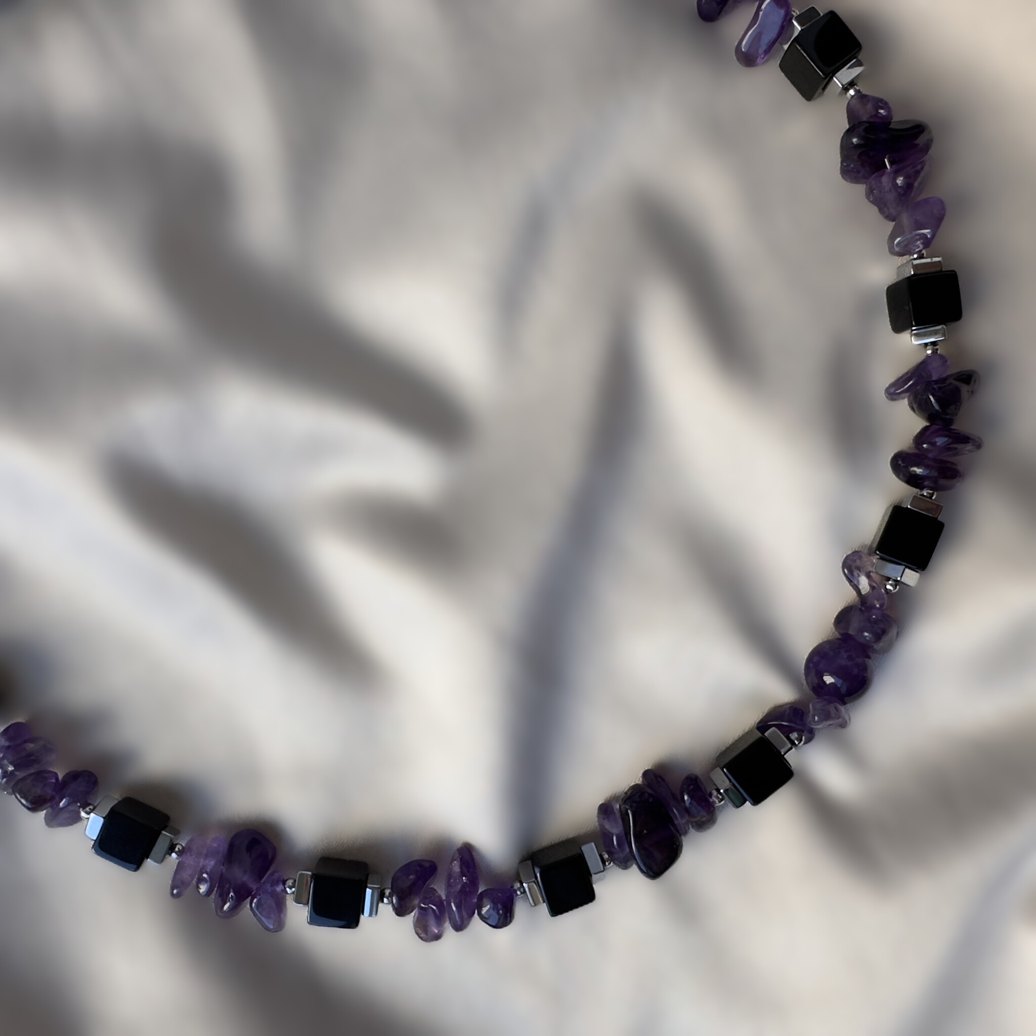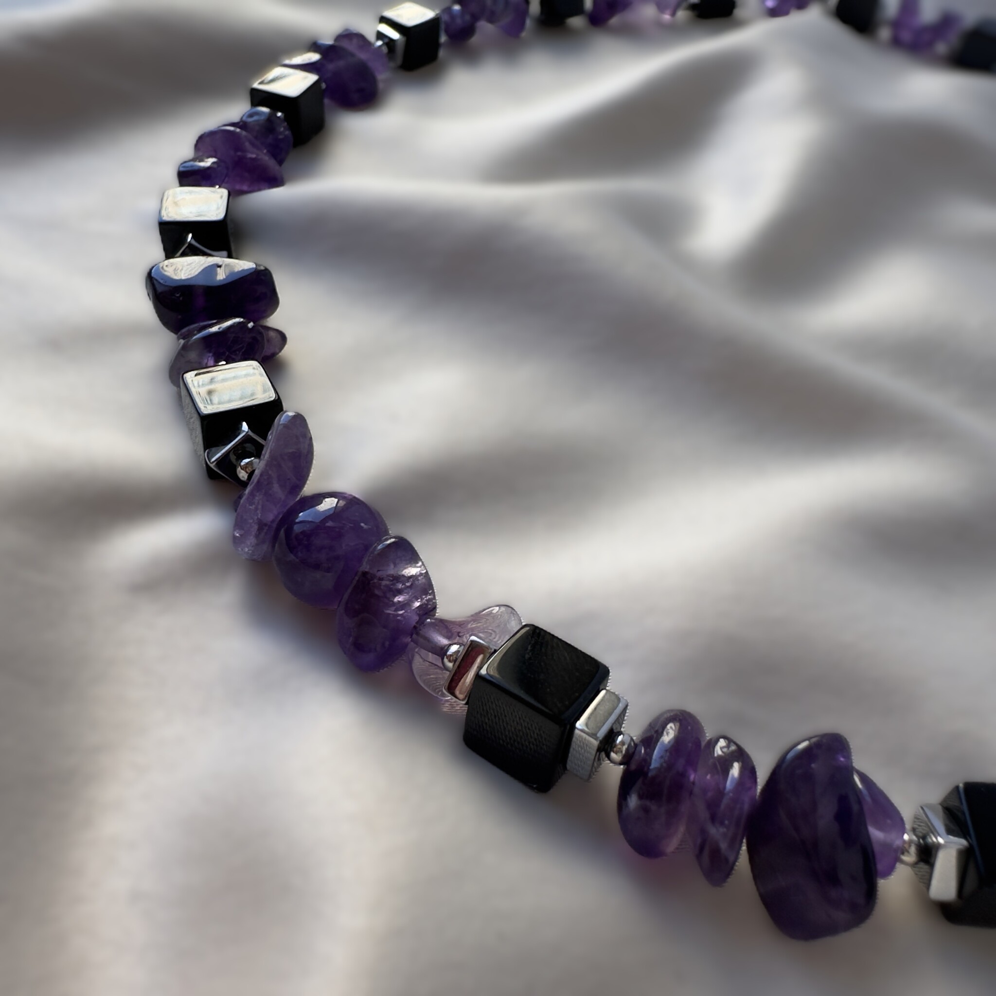 Соединение трёх камней превращает это колье в настоящий амулет баланса. Аметист открывает разум, гематит укрепляет силу, а агат оберегает от внешнего негатива. Вместе они создают украшение для женщины, которая хочет быть одновременно мягкой и сильной.