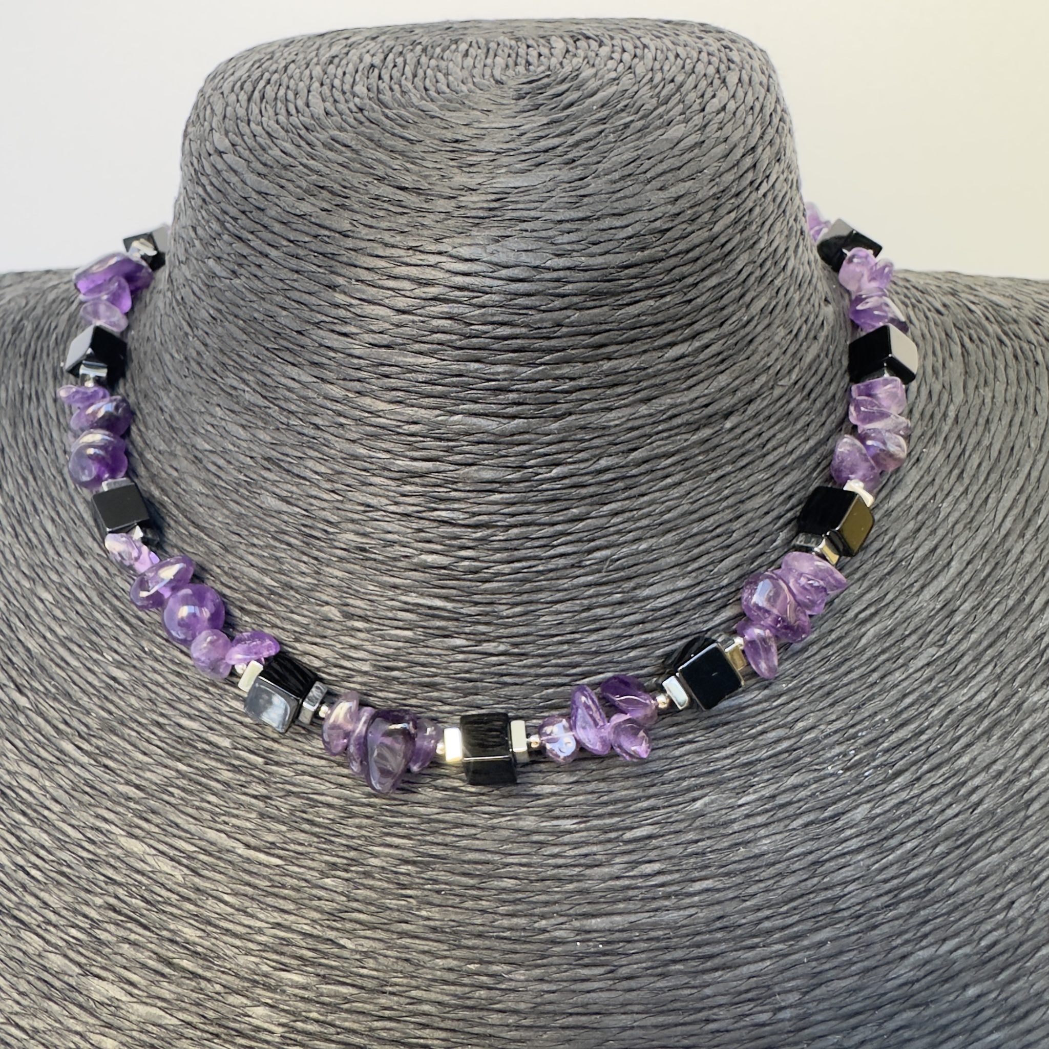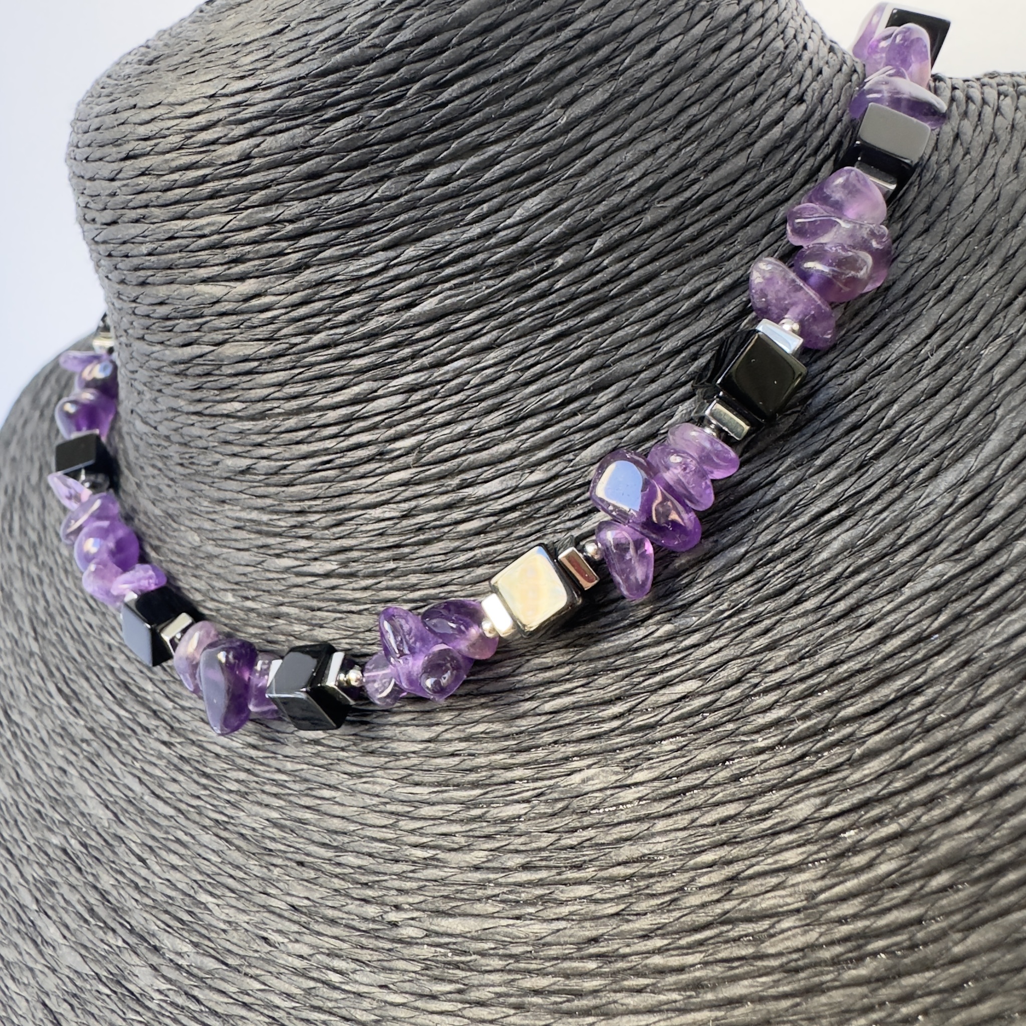 Чокер из натуральных камней: аметист, гематит и агат, ручной работы. Длина 40 см + 4 см цепочка на застежке, для регулирования размера.
