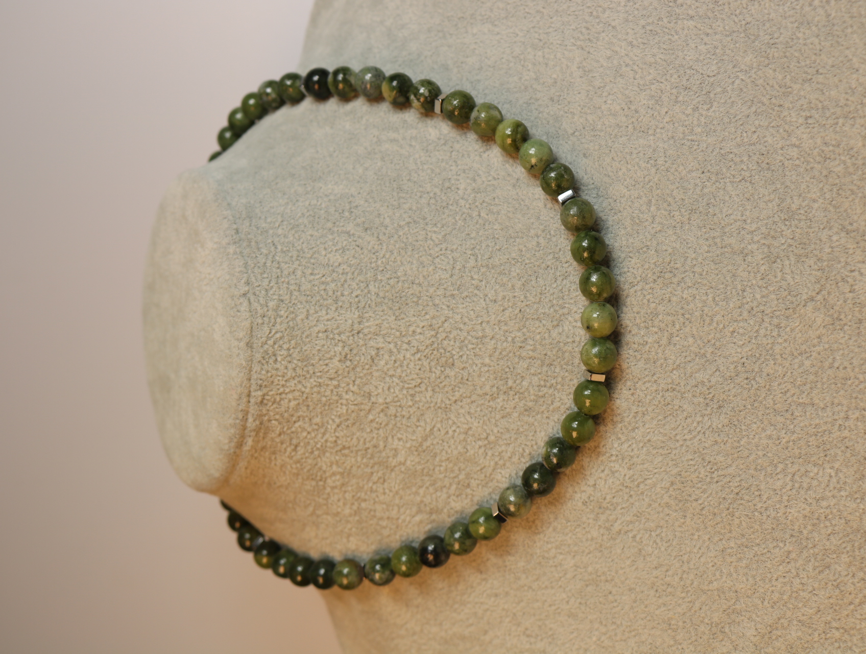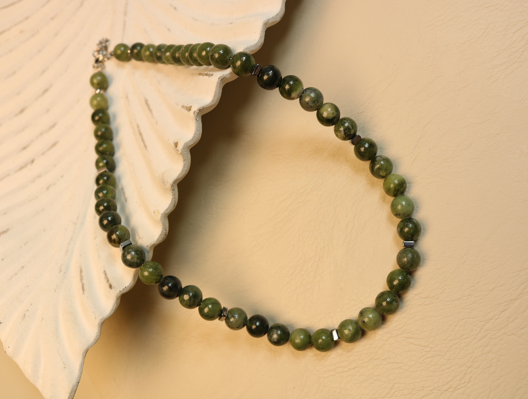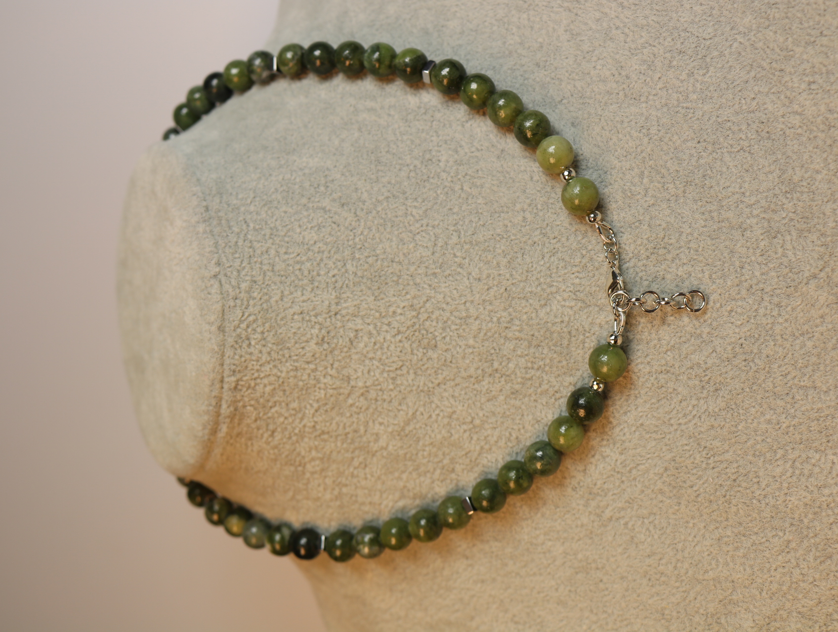 Нефрит — один из самых прочных и “выносливых” камней в ювелирных материалах (в хорошем смысле: он реально рассчитан на повседневную носку). Его ценят за гладкую полировку, глубину зелёного оттенка и спокойную, уверенную эстетику. В бусинах 8 мм нефрит выглядит особенно гармонично: заметный, но не массивный.