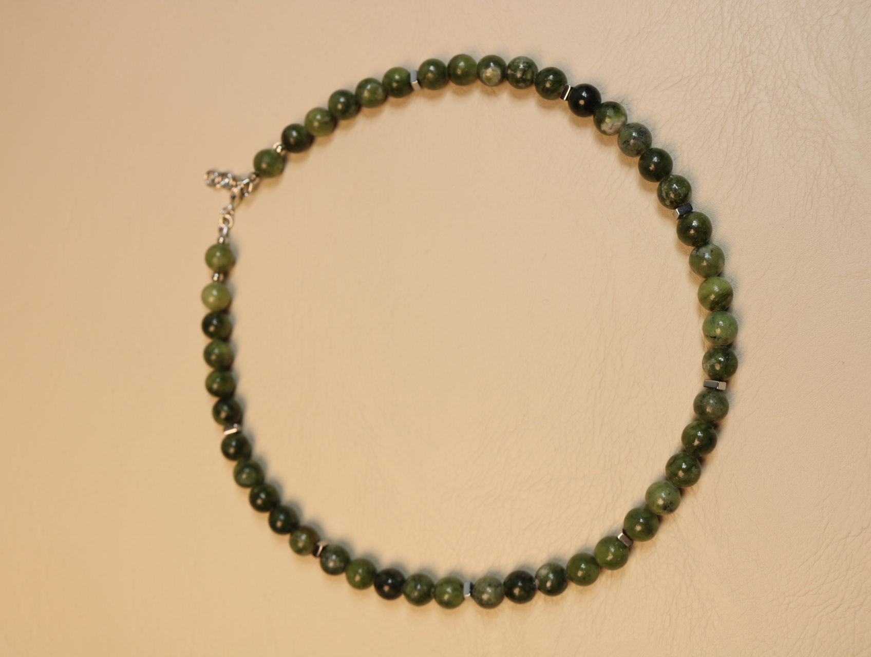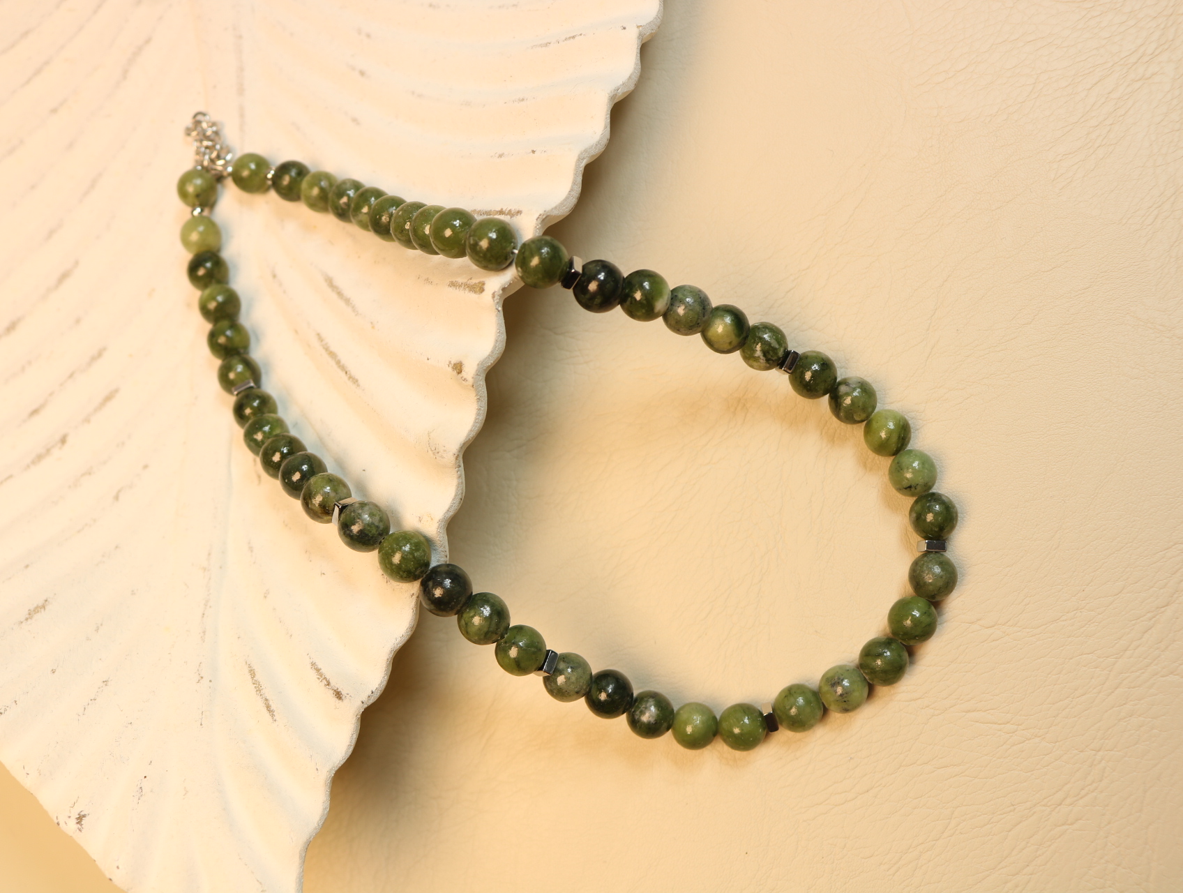Колье собрано из нефрита 8 мм — камня с плотной текстурой и благородным зелёным цветом. Круглые бусины дают ровный ритм, а вставки гематита добавляют аккуратный блеск и визуальную “собранность”. Украшение выглядит лаконично, но не скучно: нефрит всегда считывается как вещь “с характером”, особенно в минималистичной форме.