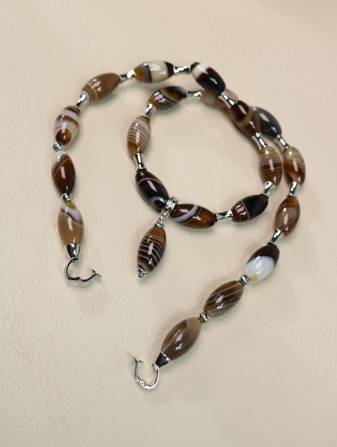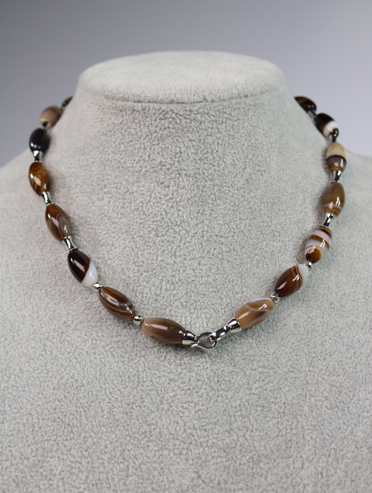 Продолговатые бусины-«оливки» образуют аккуратный мягкий овал по шее, между ними — маленькие металлические разделители, которые добавляют блеска и подчёркивают природный рисунок камня.