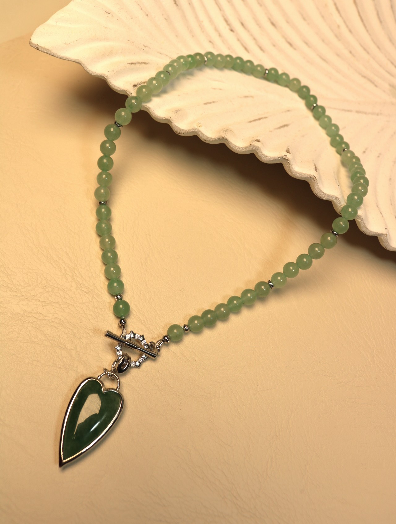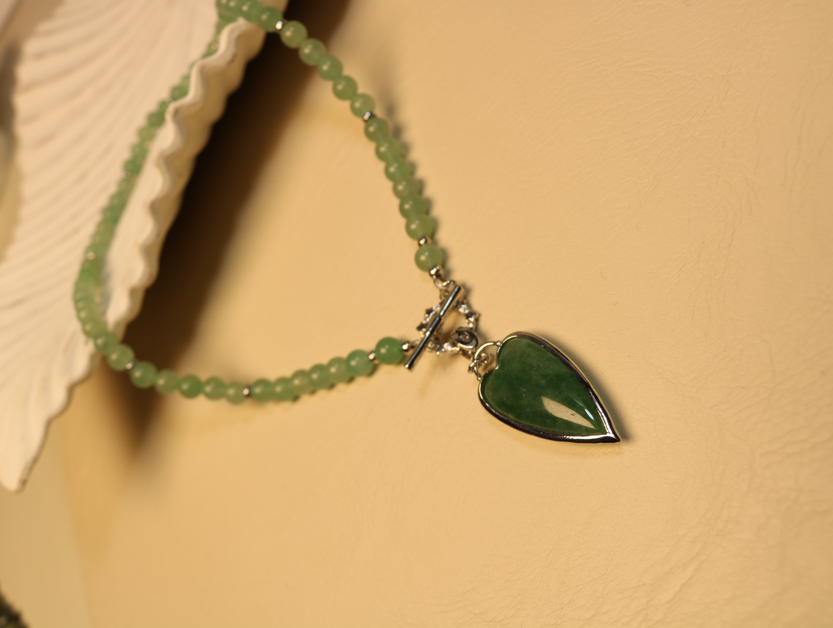 Лаконичное колье из зелёного авантюрина собирает на себе свет: мелкие полированные бусины создают мягкое мерцание, а крупное сердечко-подвеска ставит акцент в зоне декольте. Подвеска крепится на декоративный тогл с фианитами и легко снимается — у вас сразу два украшения: романтичный вариант с сердцем и спокойный минимализм без него.