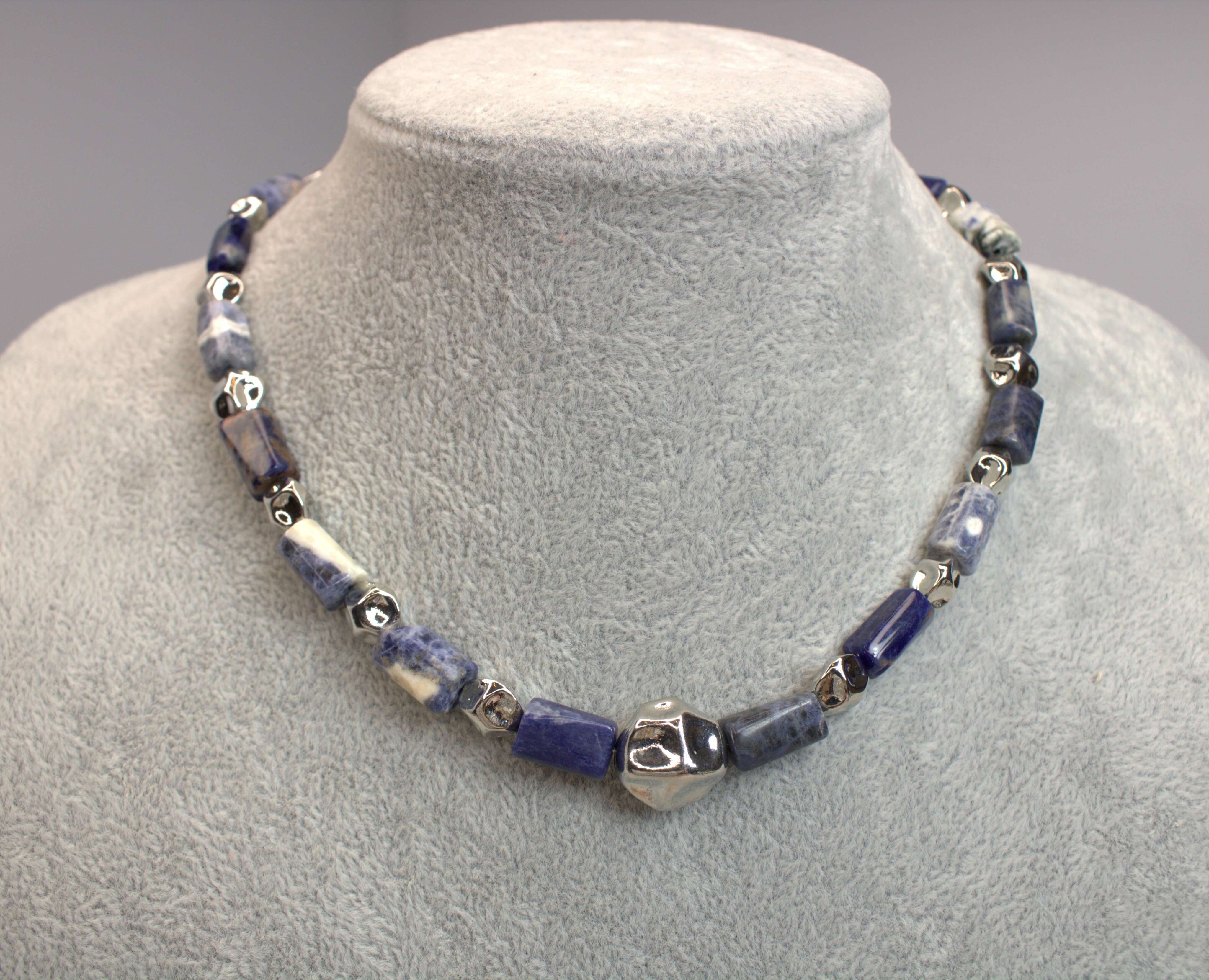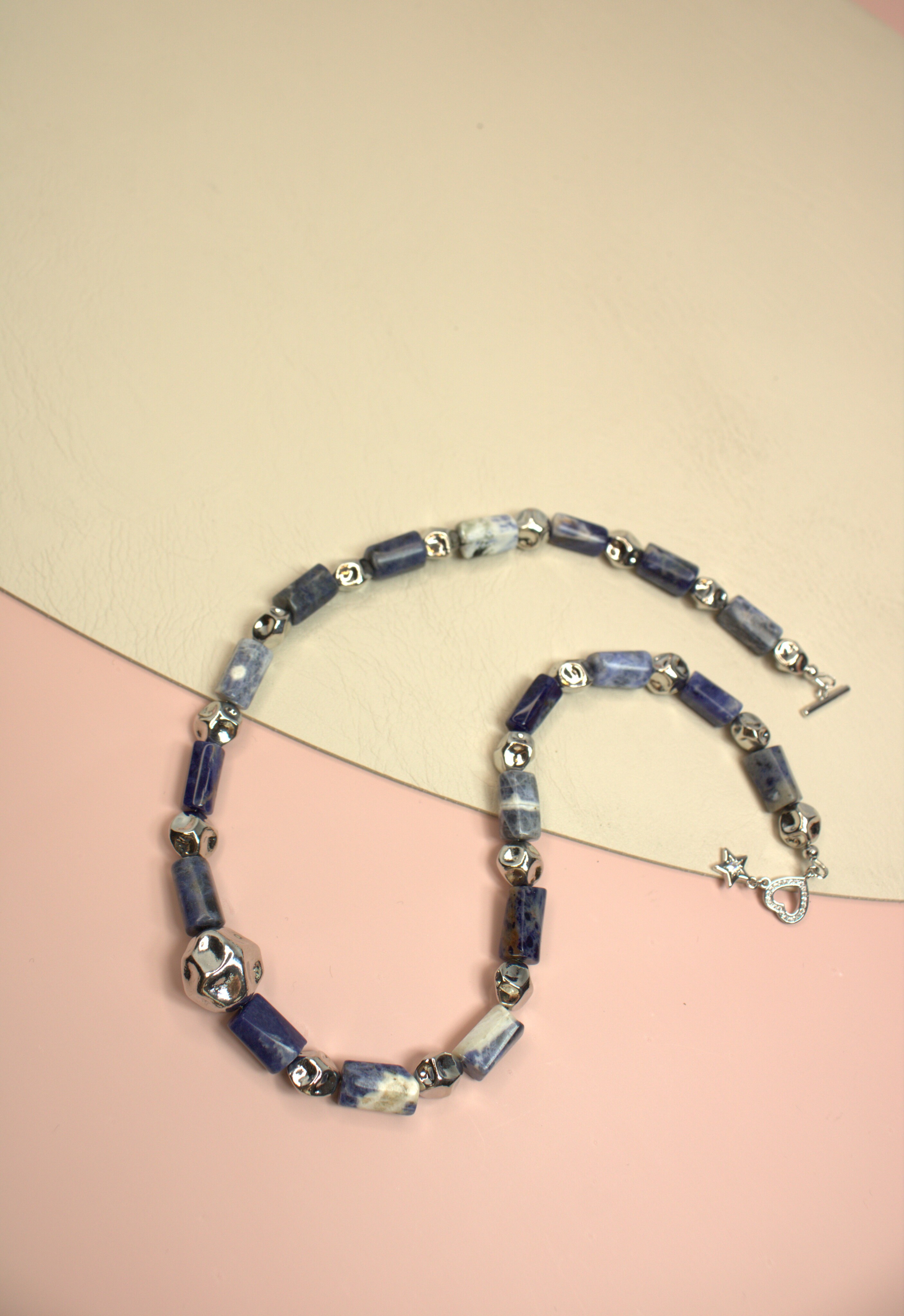 Геометричный чокер из натурального содалита (цилиндрики с гранями ≈12×8 мм) с серебристыми акцентами и застёжкой-тогл в виде сердечка с инкрустацией фианитами и с подвеской-монеткой со звездочкой. Глубокий синий с молочными прожилками — спокойный, но заметный акцент.