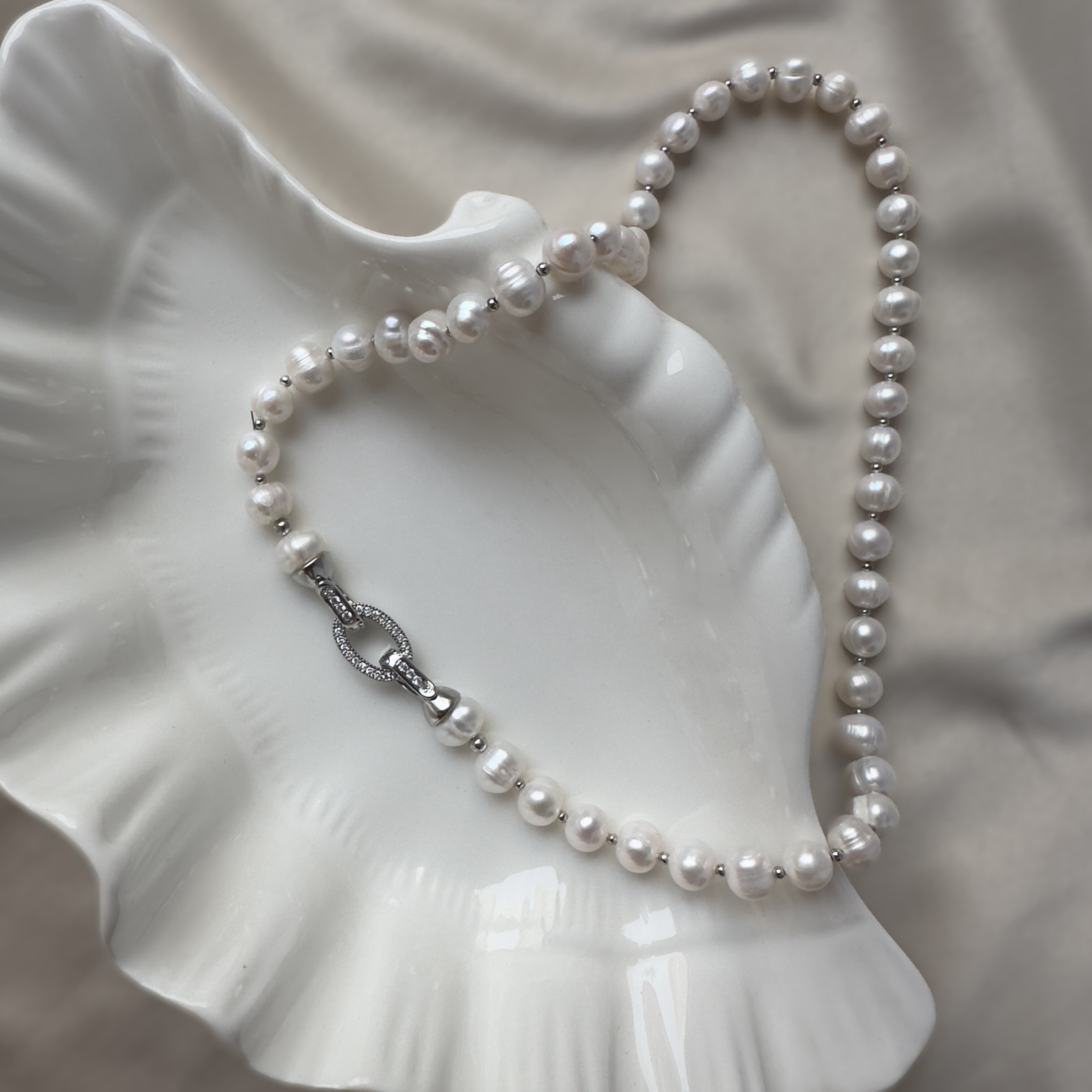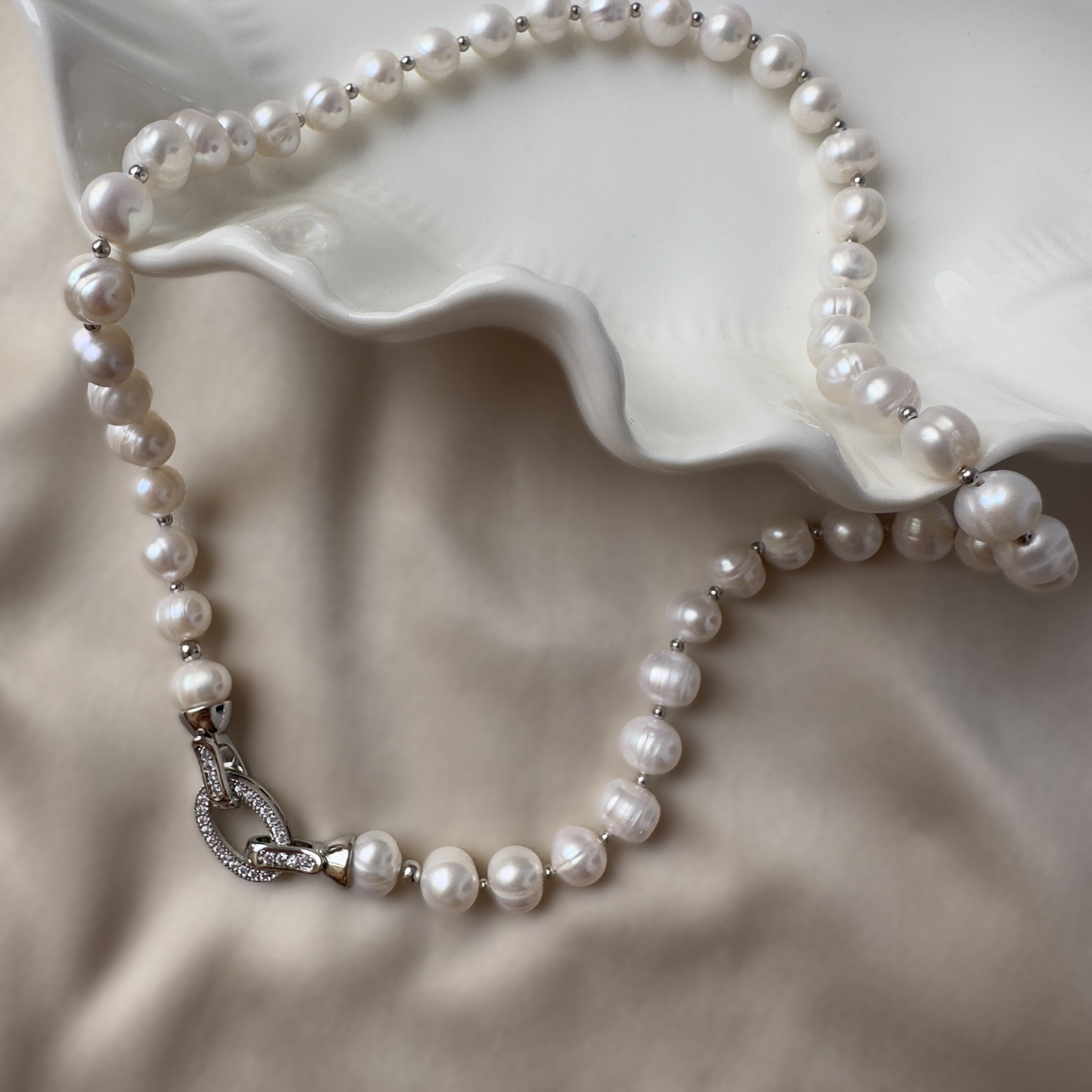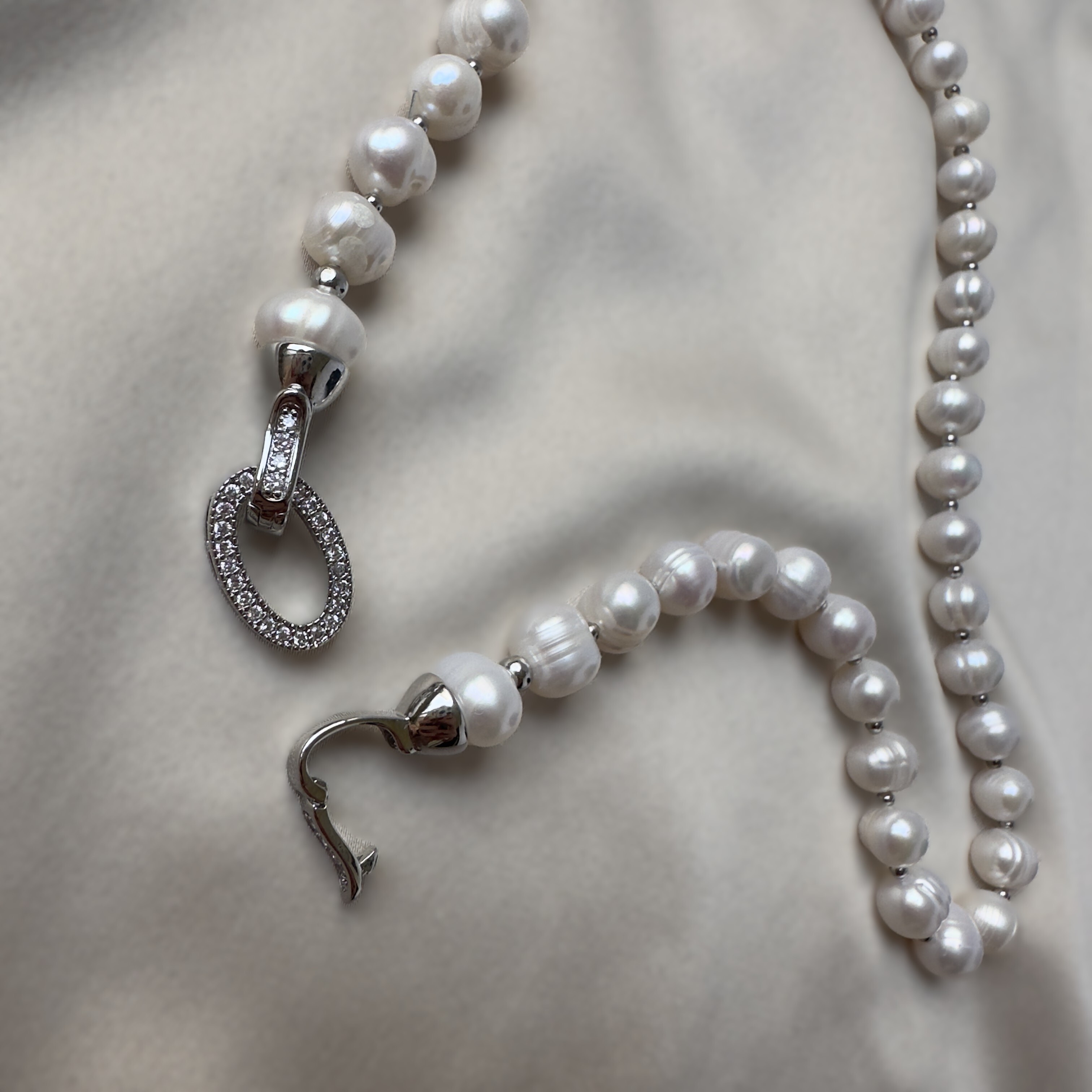Натуральный речной жемчуг 7–8 мм, серебристые акценты и эффектный декоративный замок, инкрустированный фианитами. Универсальная длина для базы и вечера. «Твой талисман в мире побед».