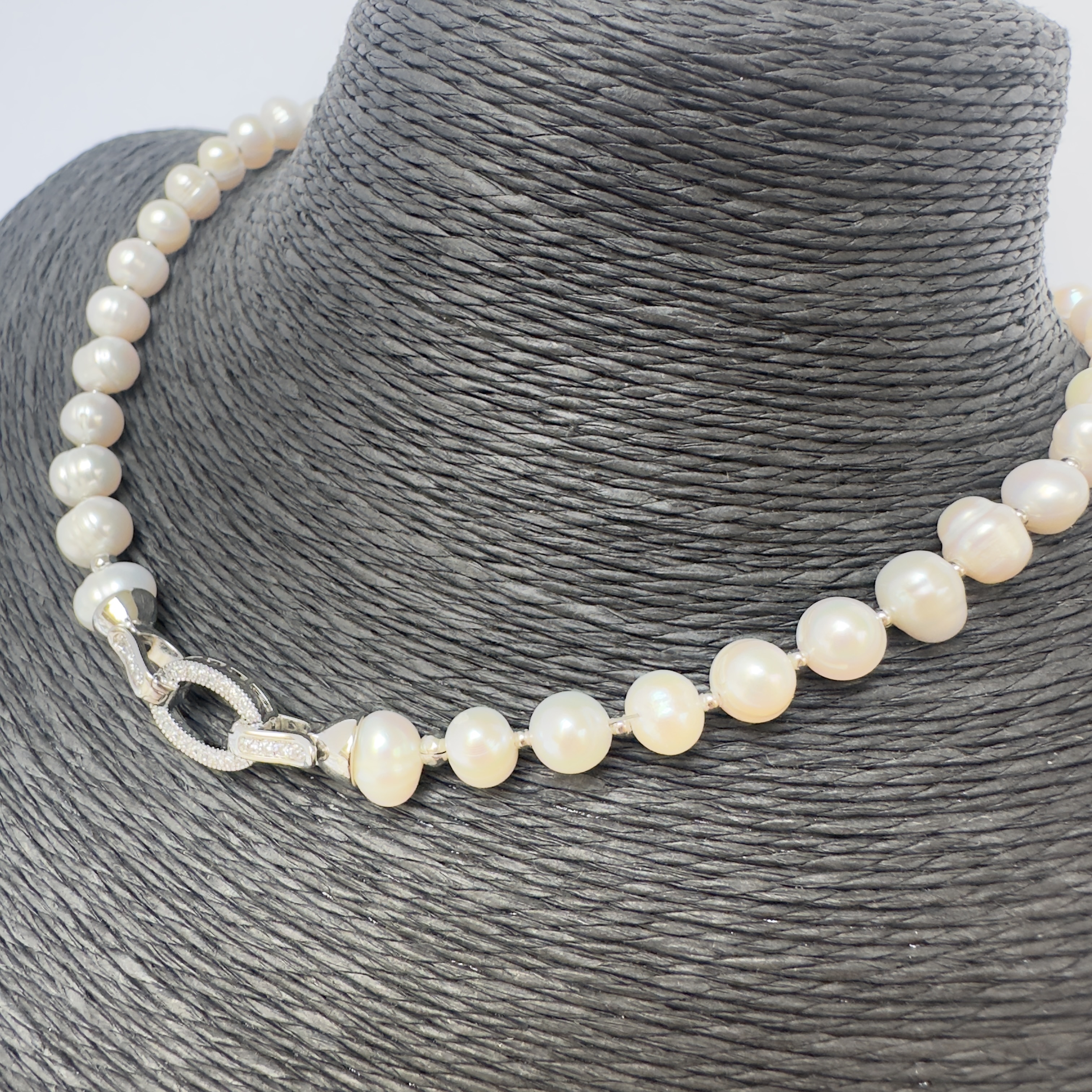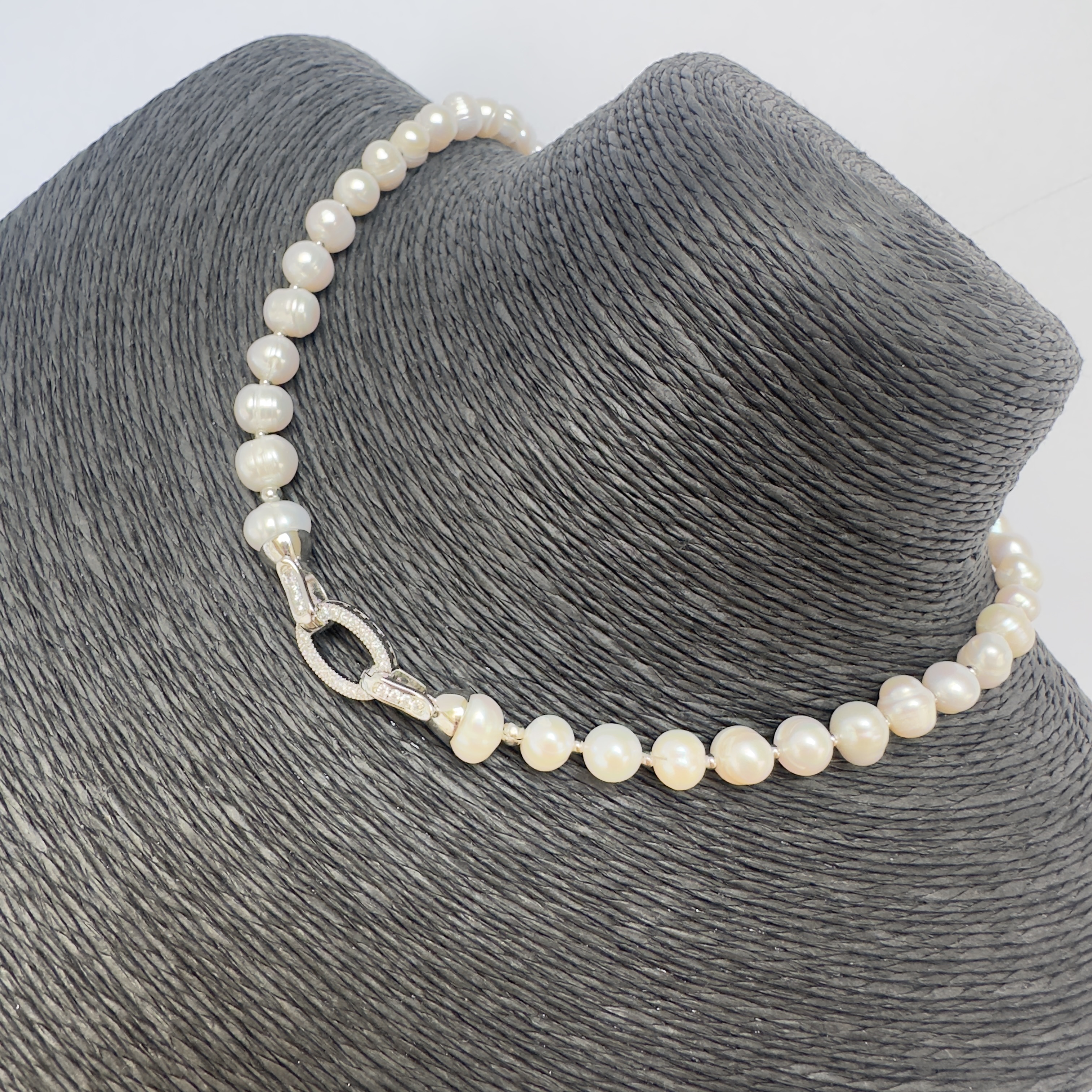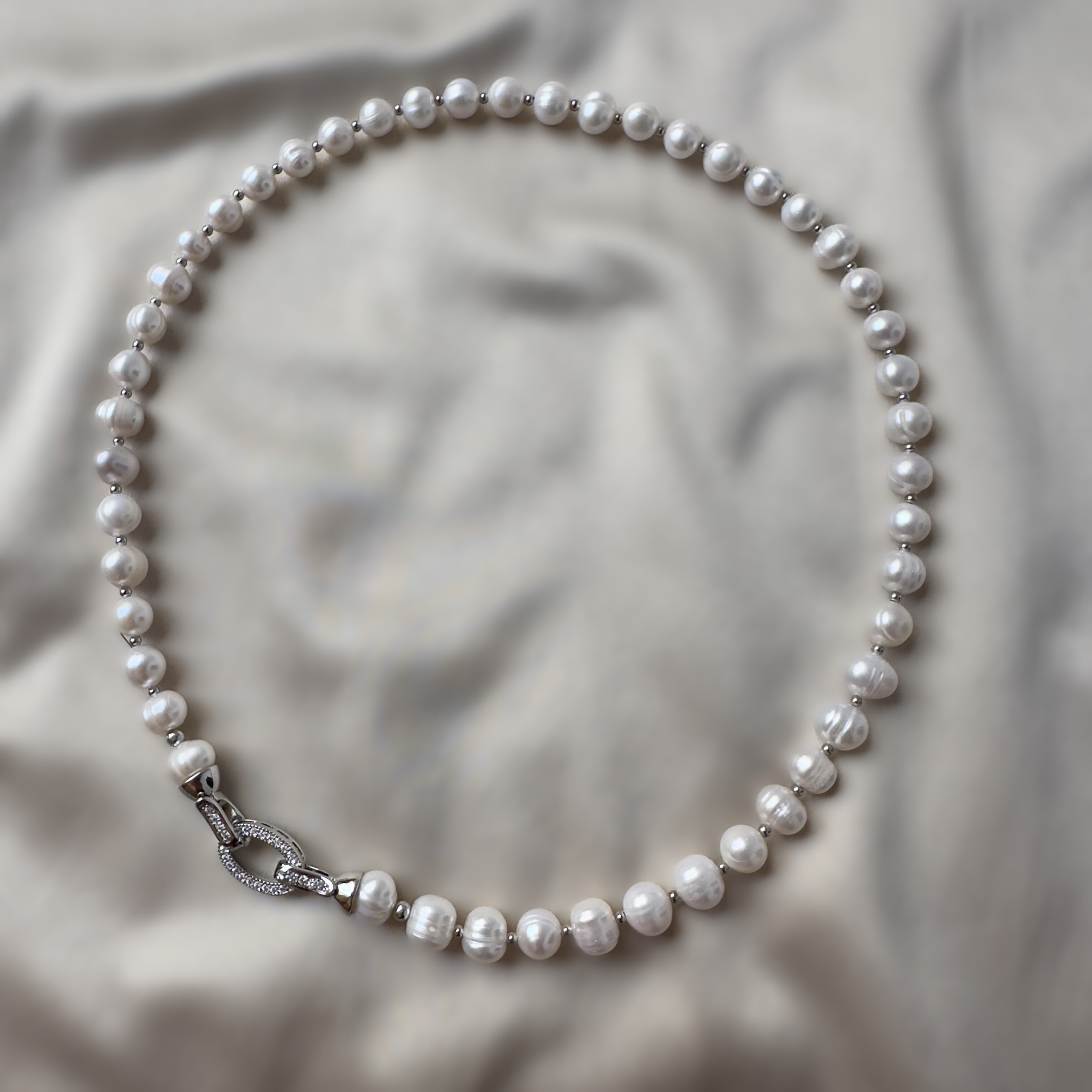 Натуральный речной жемчуг 7–8 мм, серебристые акценты и эффектный декоративный замок, инкрустированный фианитами. Универсальная длина для базы и вечера. «Твой талисман в мире побед».