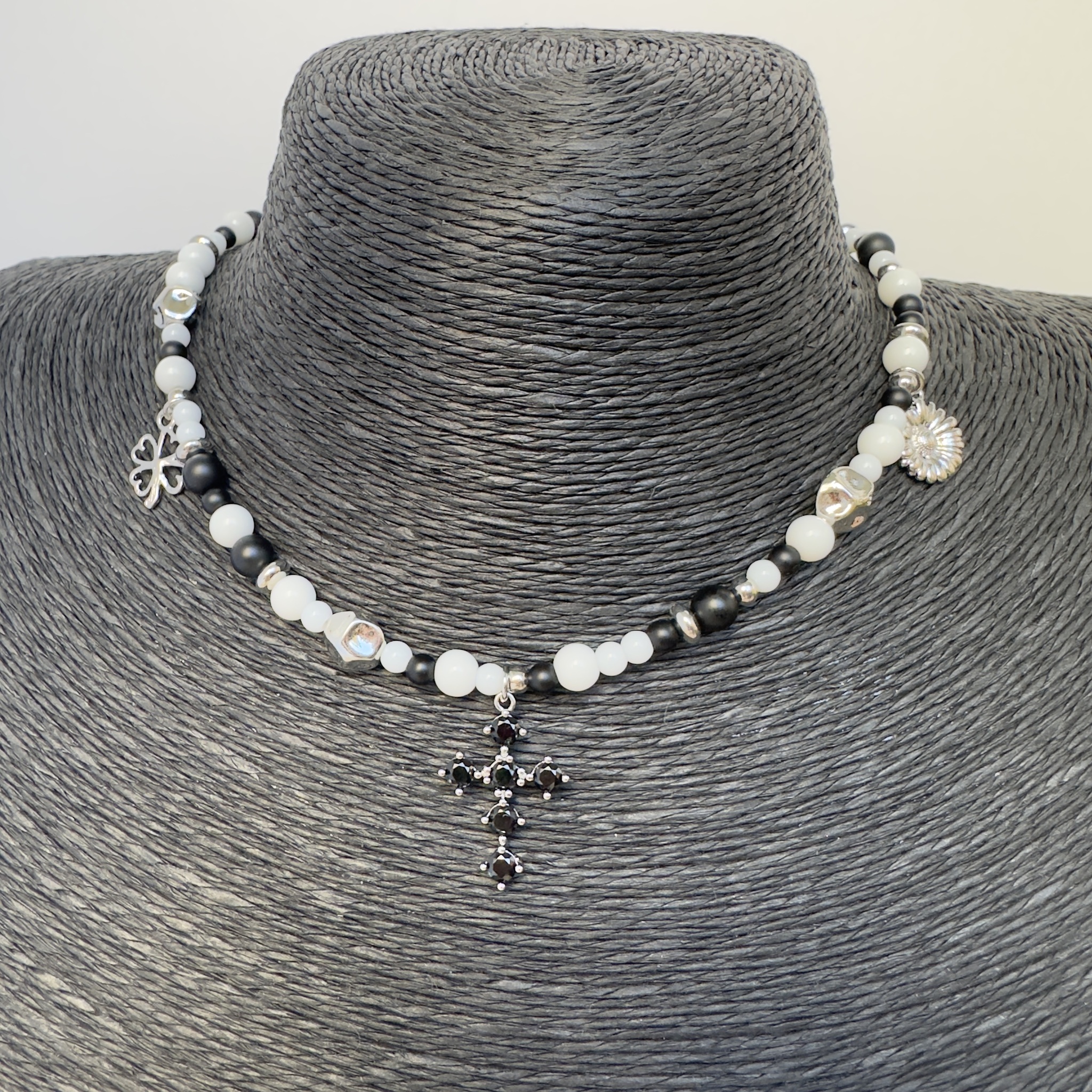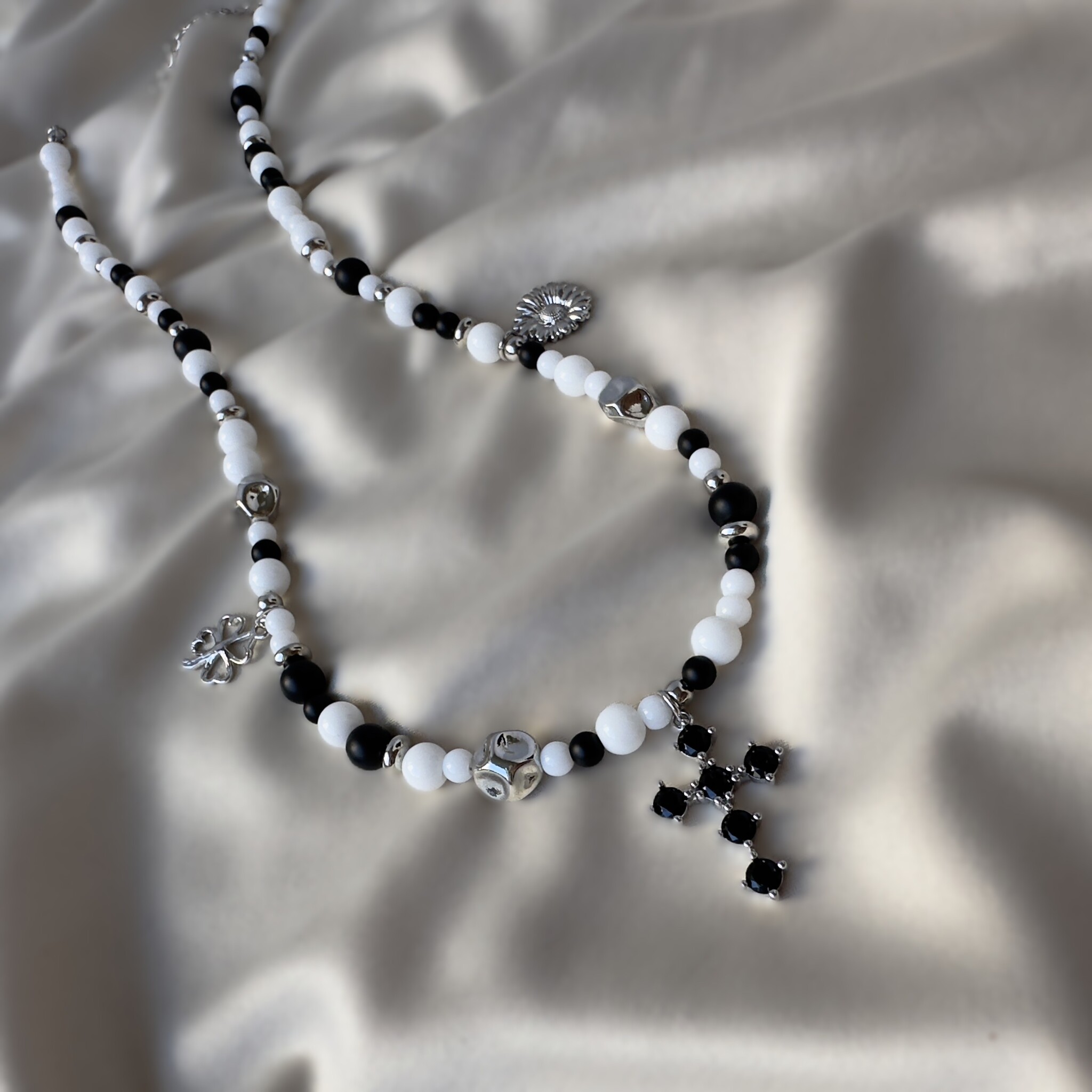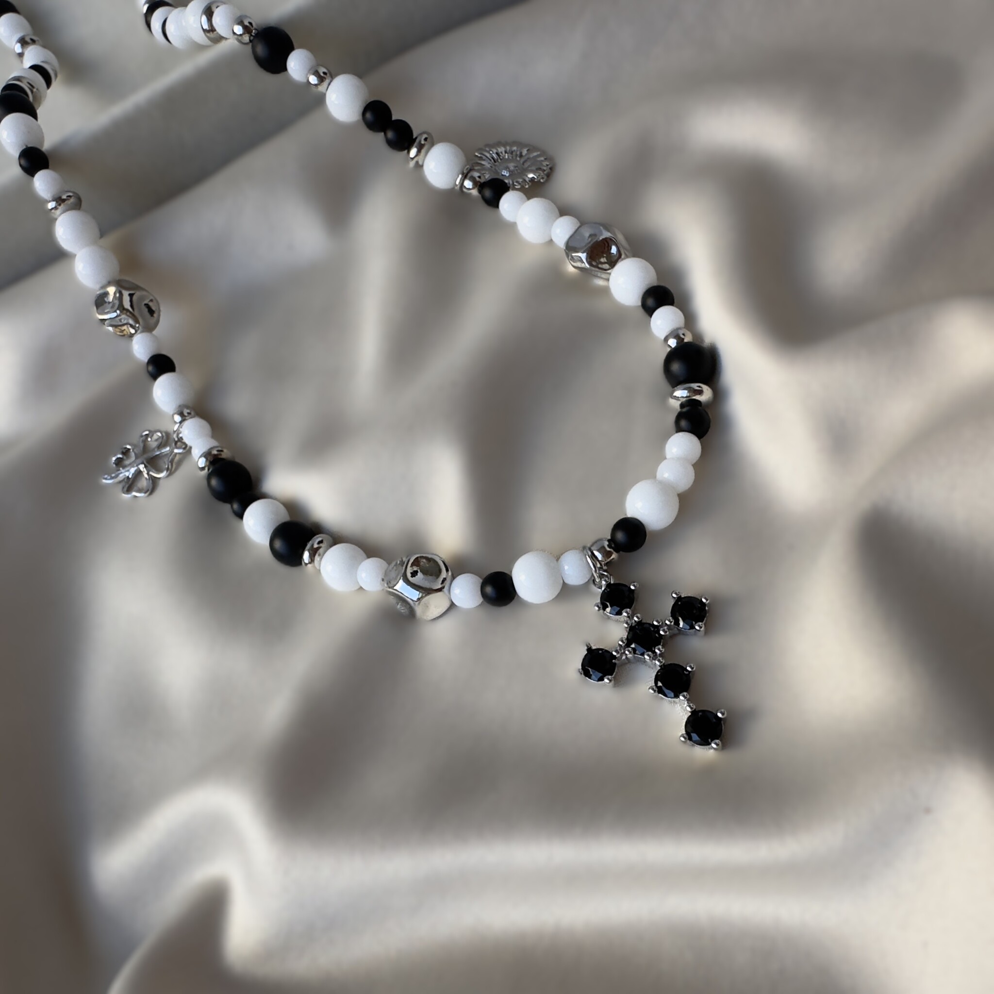 Серебристая фурнитура и подвеска-крест — акцент на индивидуальности, смелости и стиле.