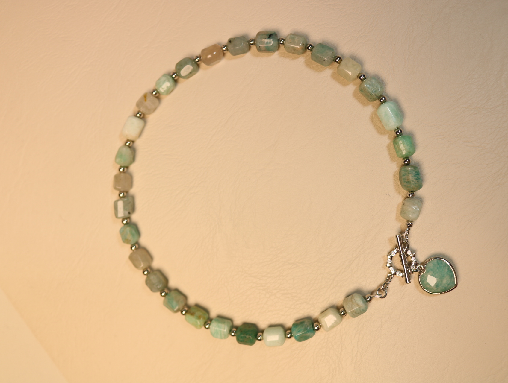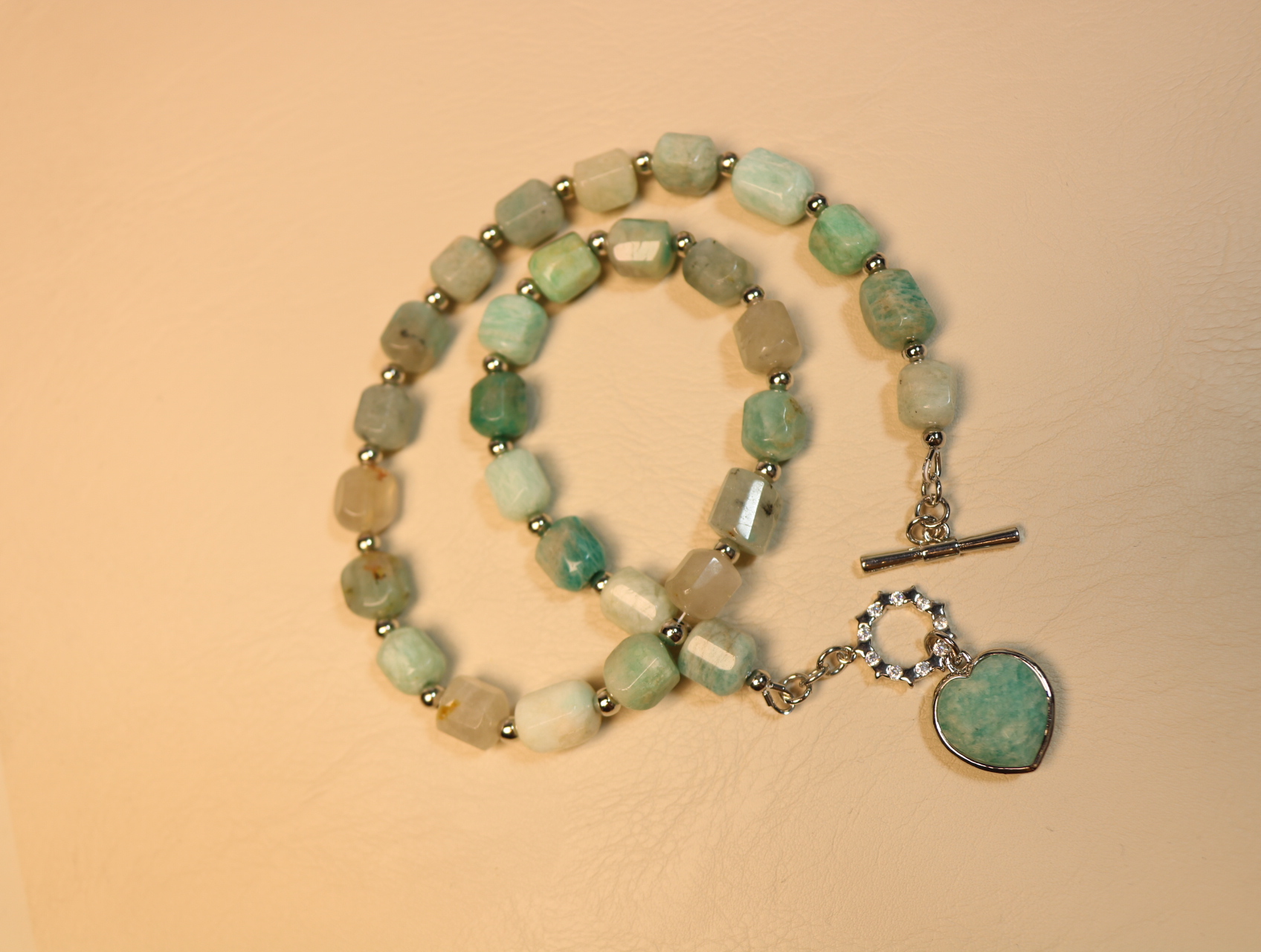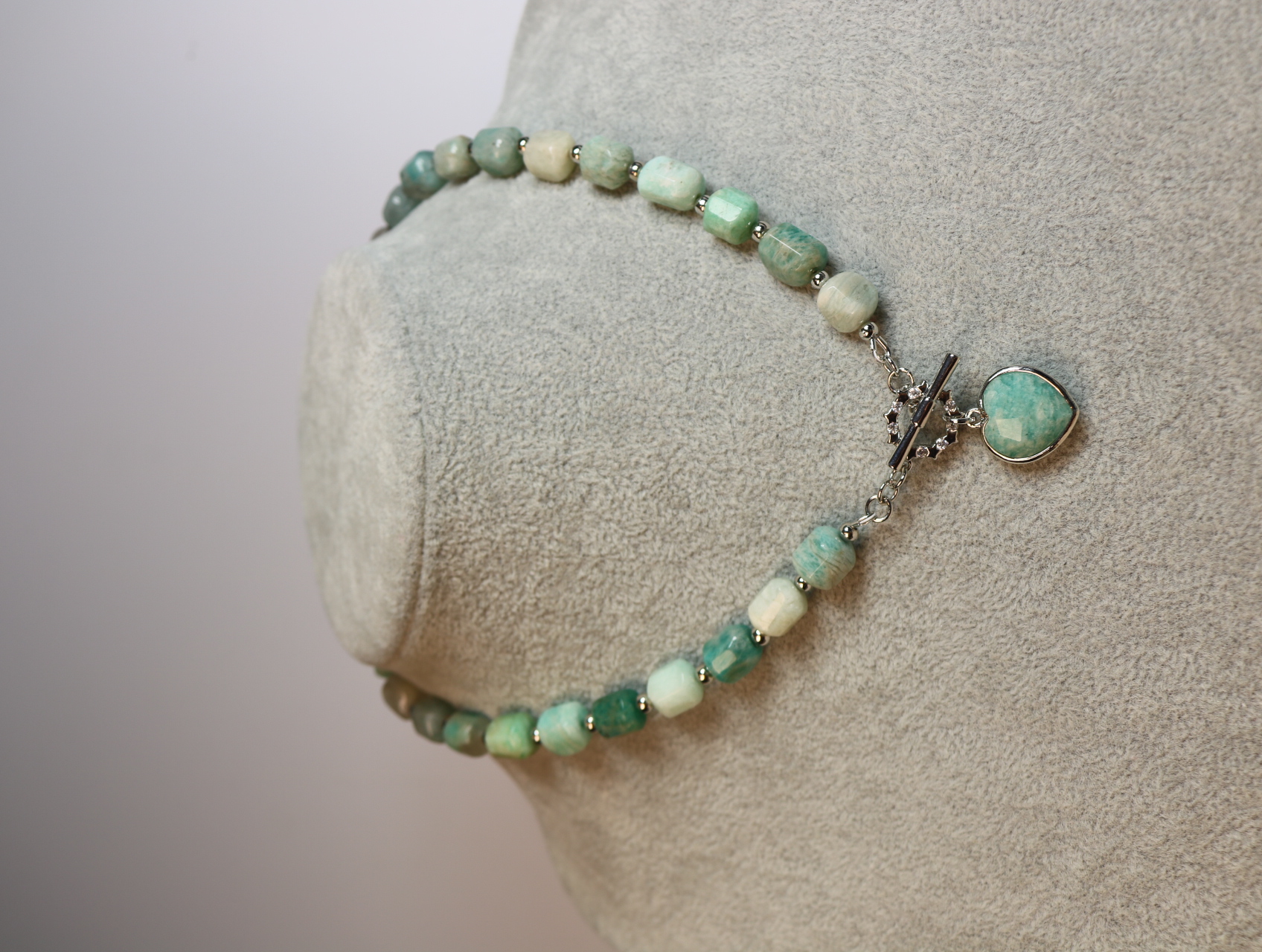 Застёжка-тогл с фианитами вынесена вперёд и превращена в акцент: на ней качается сердечко из амазонита в серебристой оправе — словно маленькое признание, которое всегда с вами.
