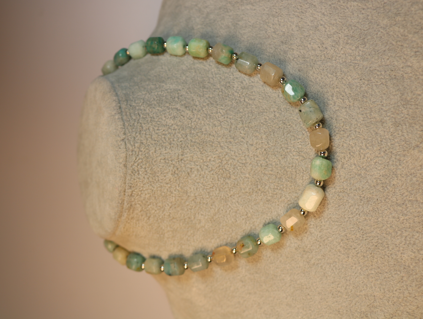 Нежное колье из гранёного амазонита с подвеской-сердцем. Мягкие мятно-бирюзовые кубики камня собраны в аккуратную линию, между ними — миниатюрные металлические разделители, которые добавляют блеска и ритма.