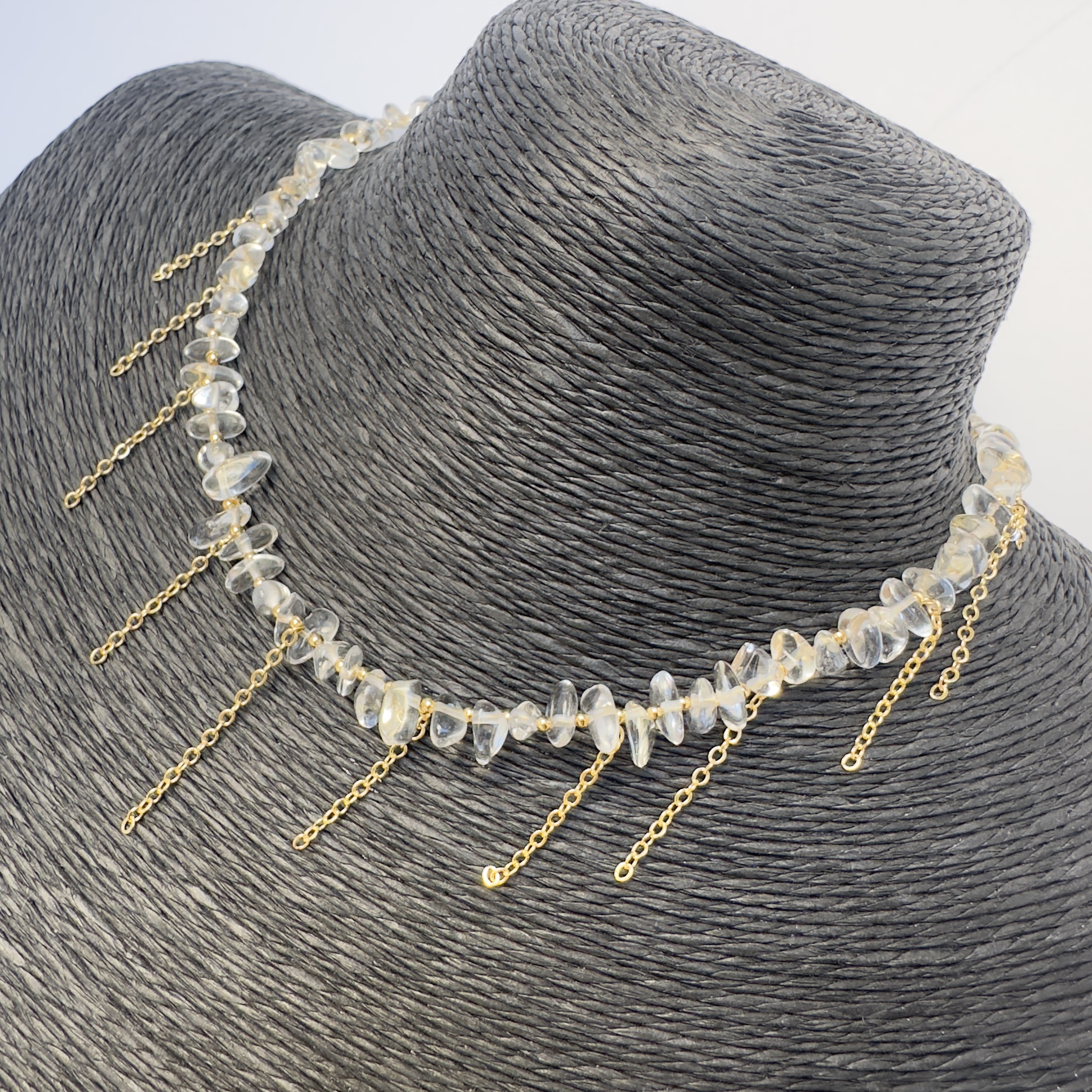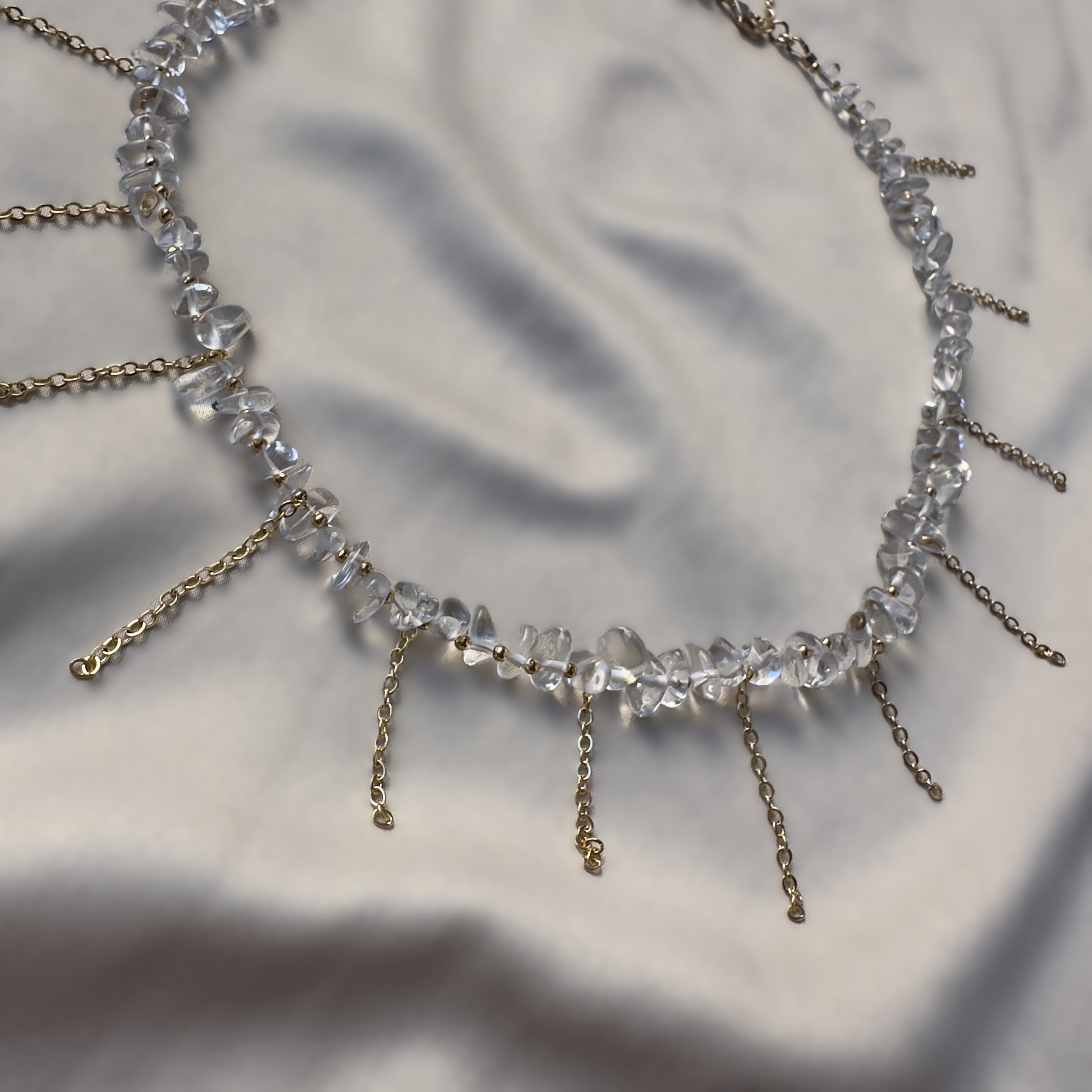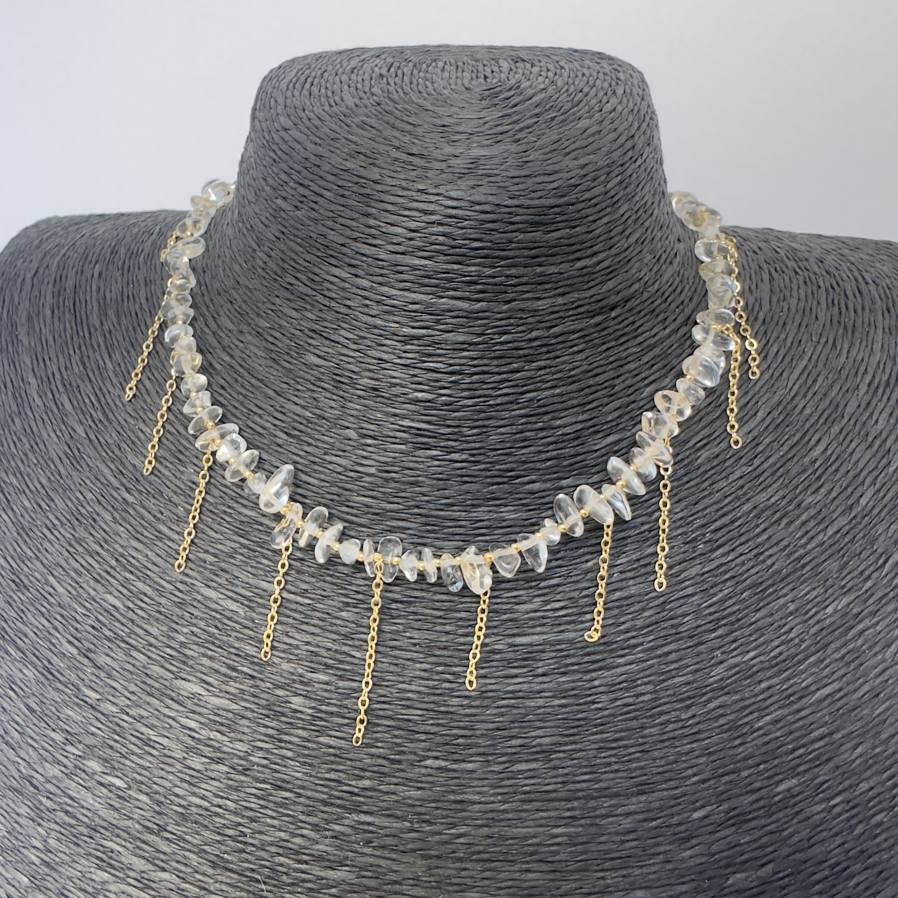 Состав и размеры: натуральный горный хрусталь (галтовка ≈5–8 мм); подвески-цепочки 20–50 мм, цвет золота; фурнитура премиум (Южная Корея); ювелирный тросик; длина 40–45 см (удлинитель 5 см); замок-карабин.