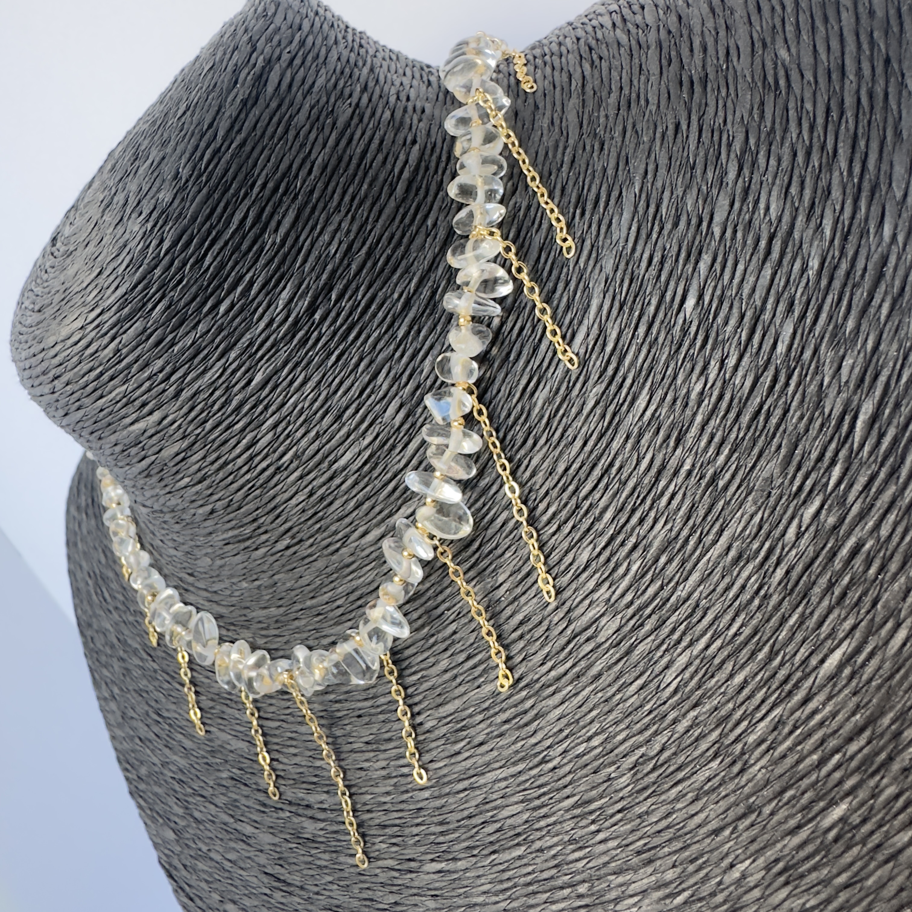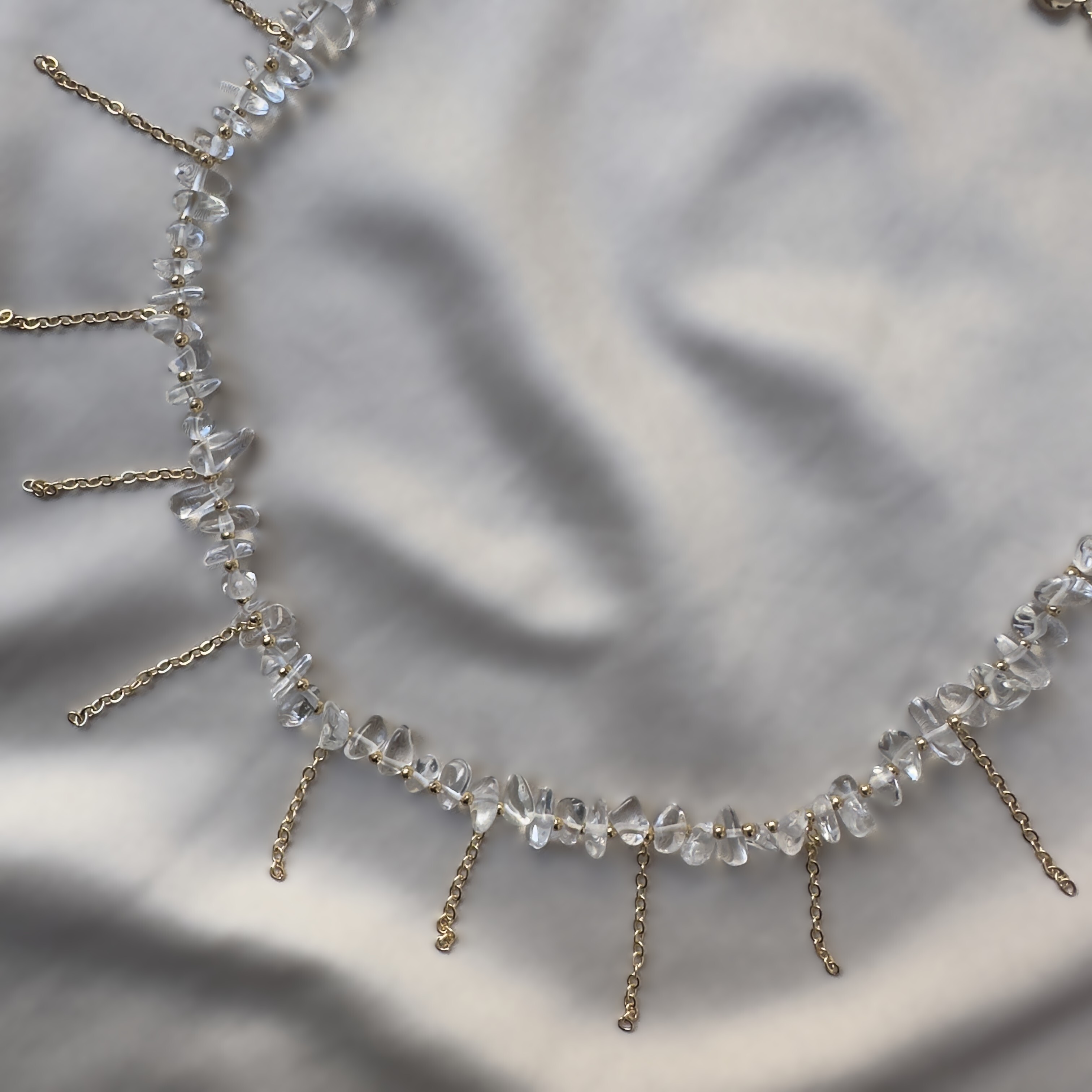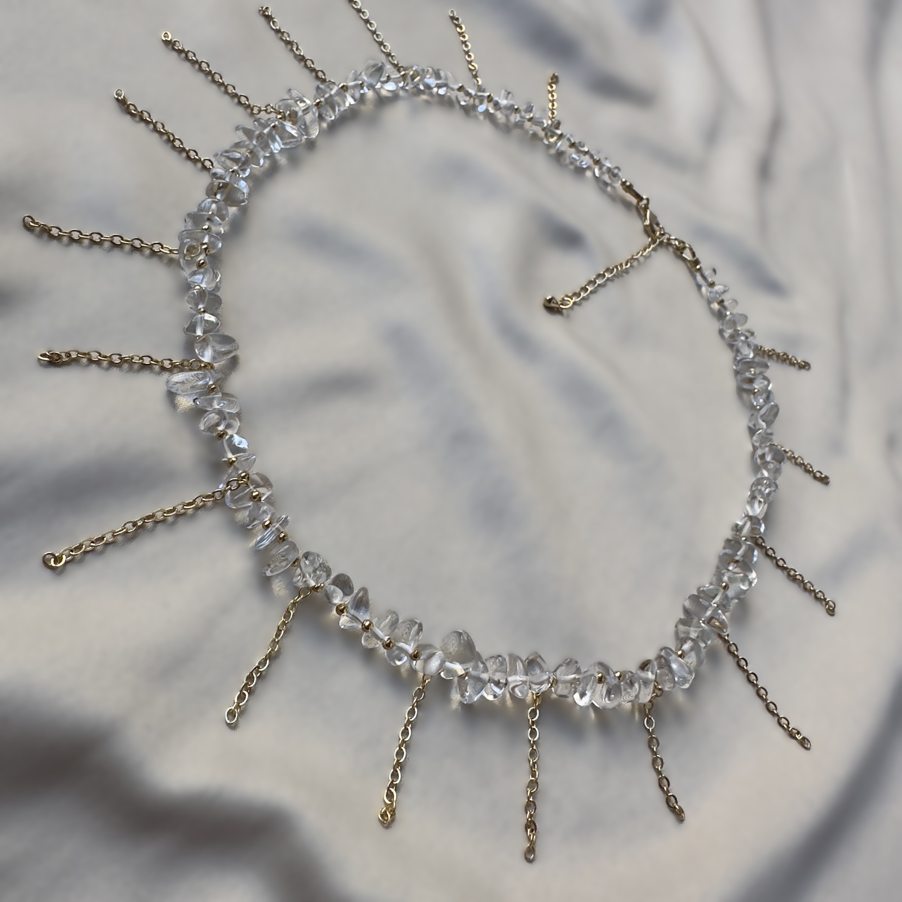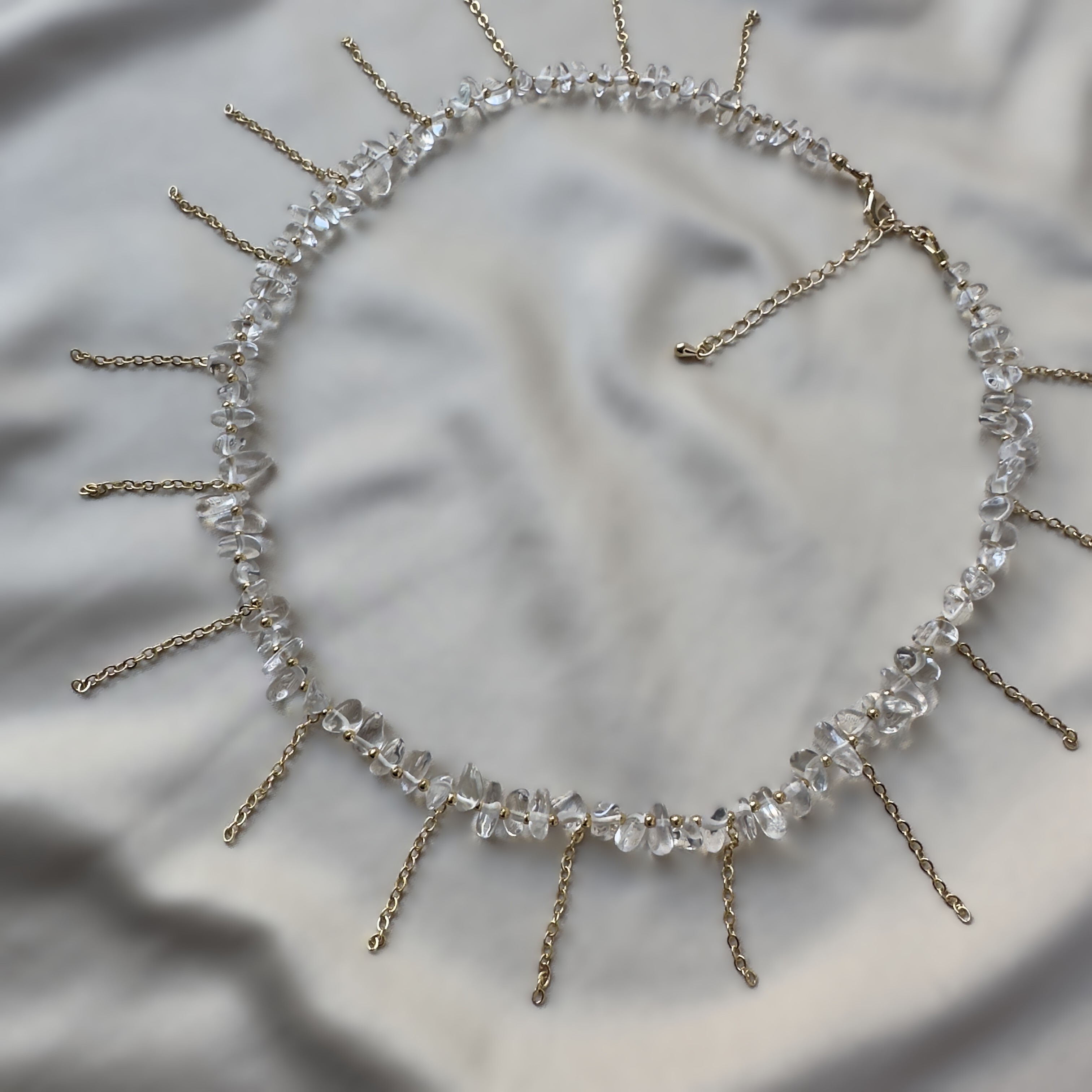 Состав и размеры: натуральный горный хрусталь (галтовка ≈5–8 мм); подвески-цепочки 20–50 мм, цвет золота; фурнитура премиум (Южная Корея); ювелирный тросик; длина 40–45 см (удлинитель 5 см); замок-карабин.