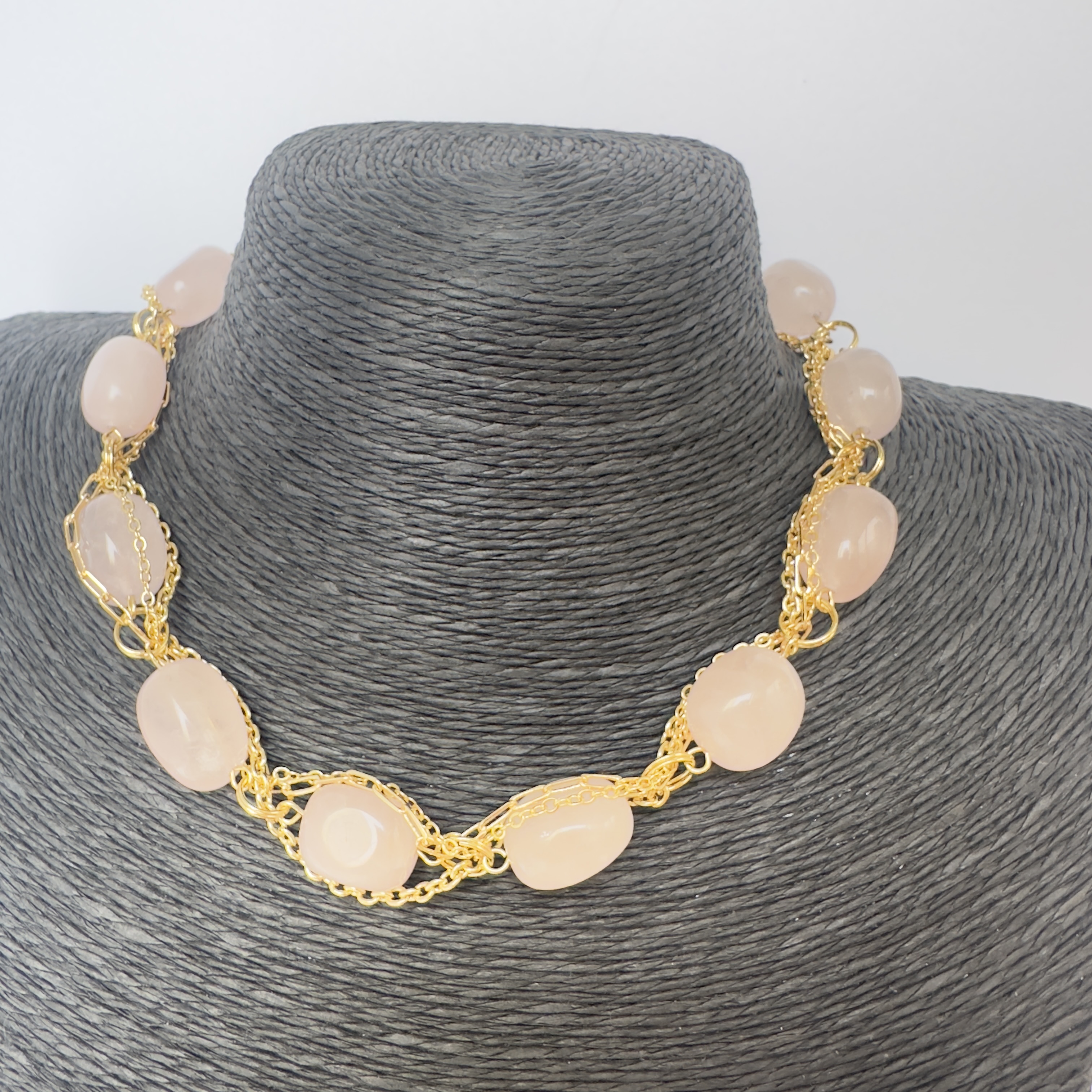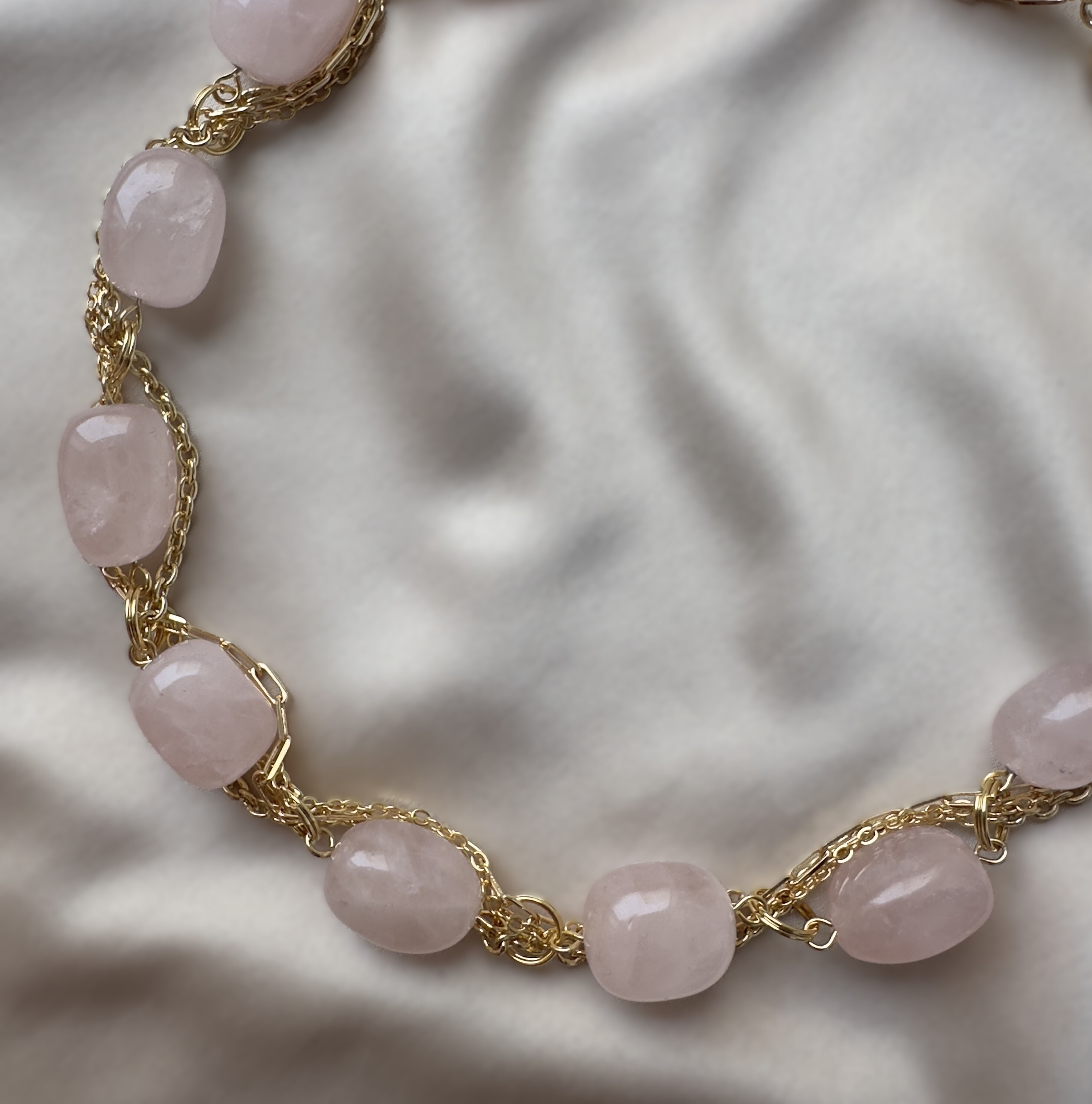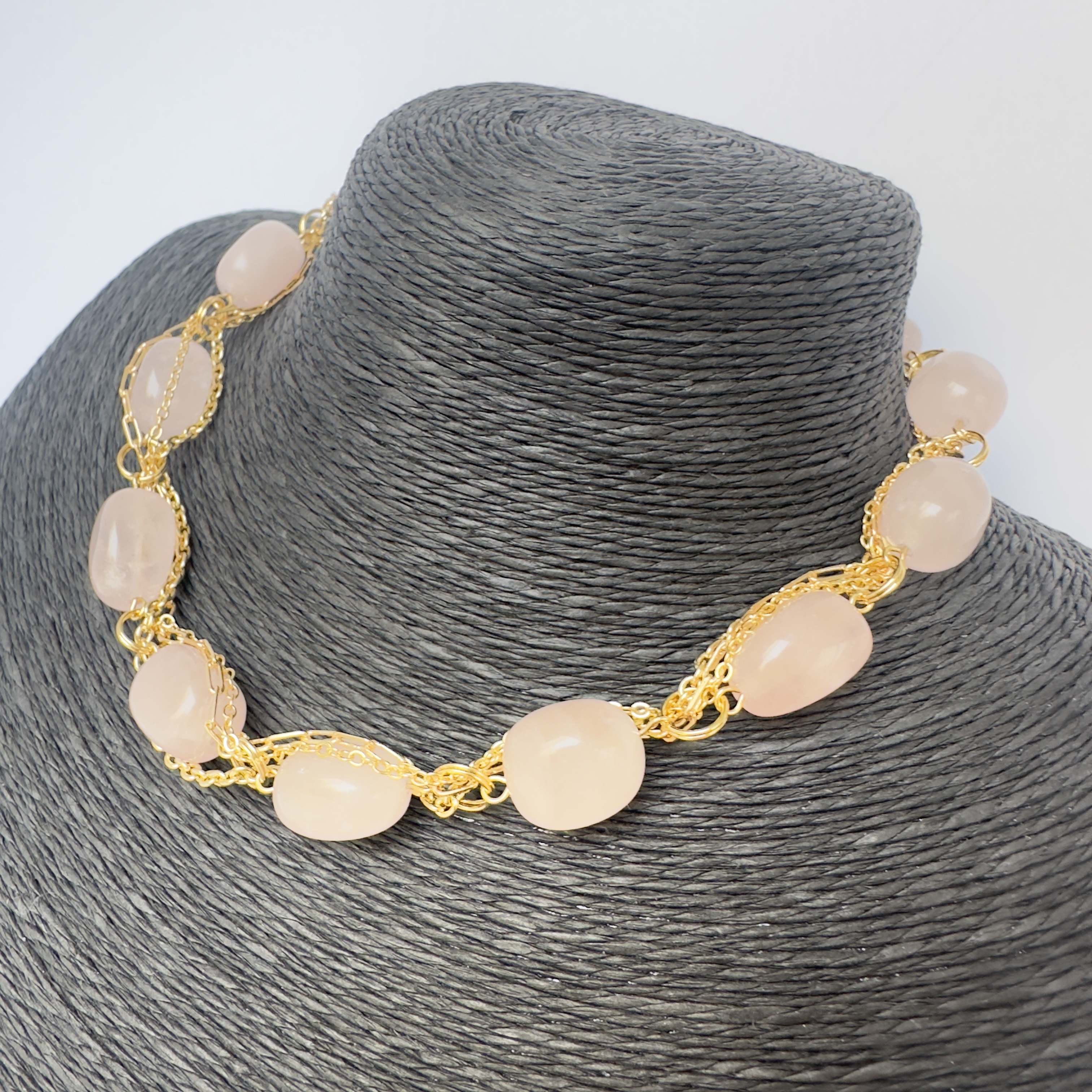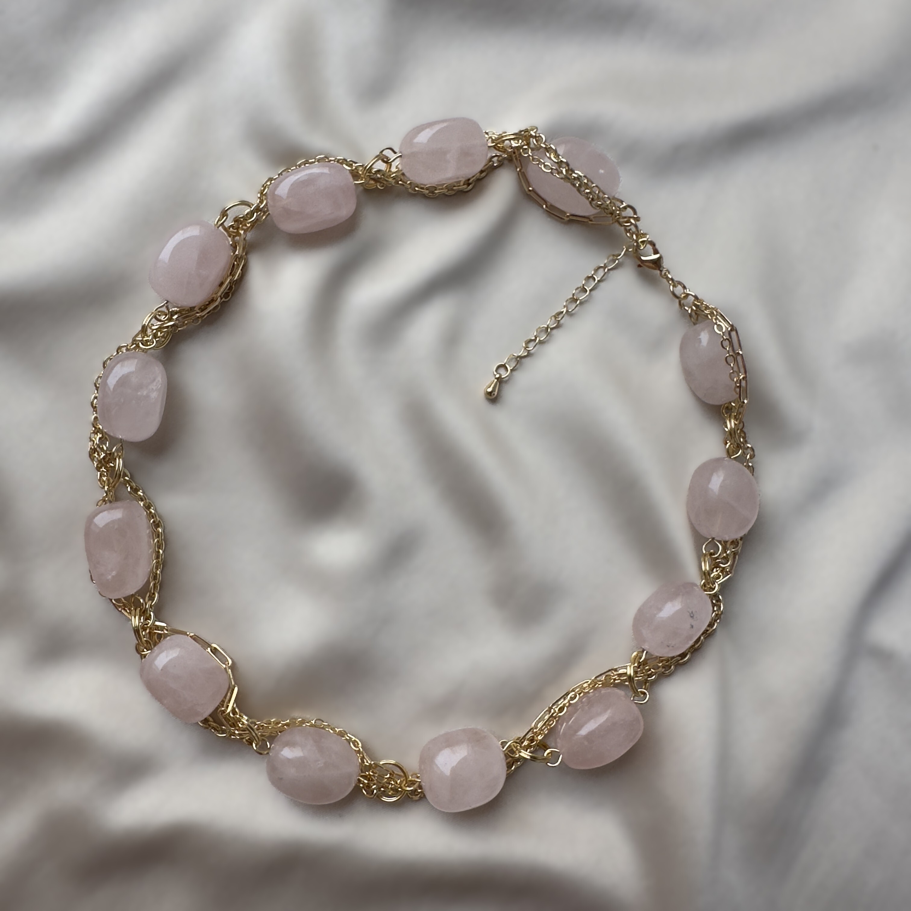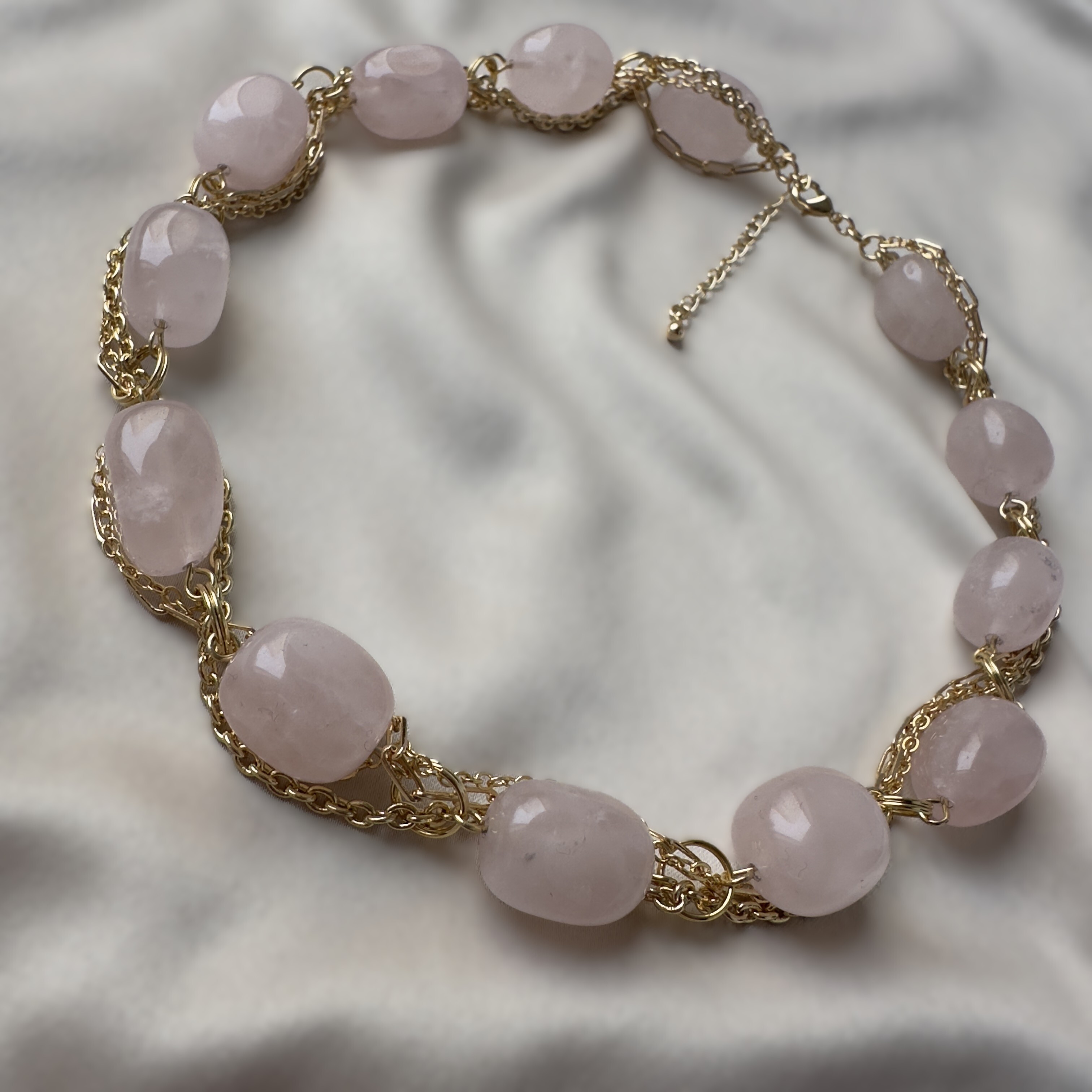 Натуральный розовый кварц галтовки (камни ≈20×10 мм) и золотистые многорядные цепи. Длина 40 см + 5 см регулировка. Мягкий пудровый оттенок, который подсвечивает кожу. «Твой талисман в мире побед». Идеальное трендовое колье с крупными камнями