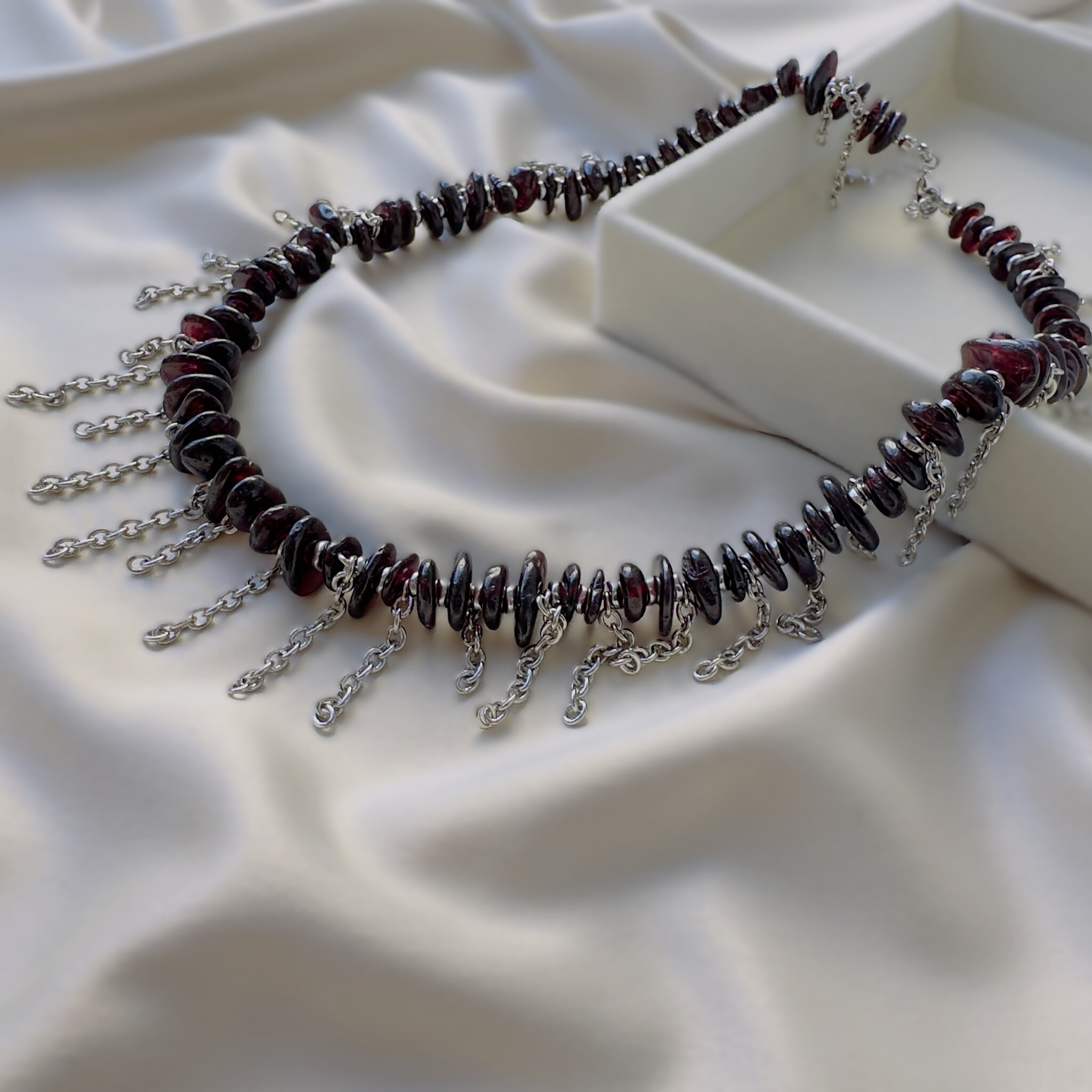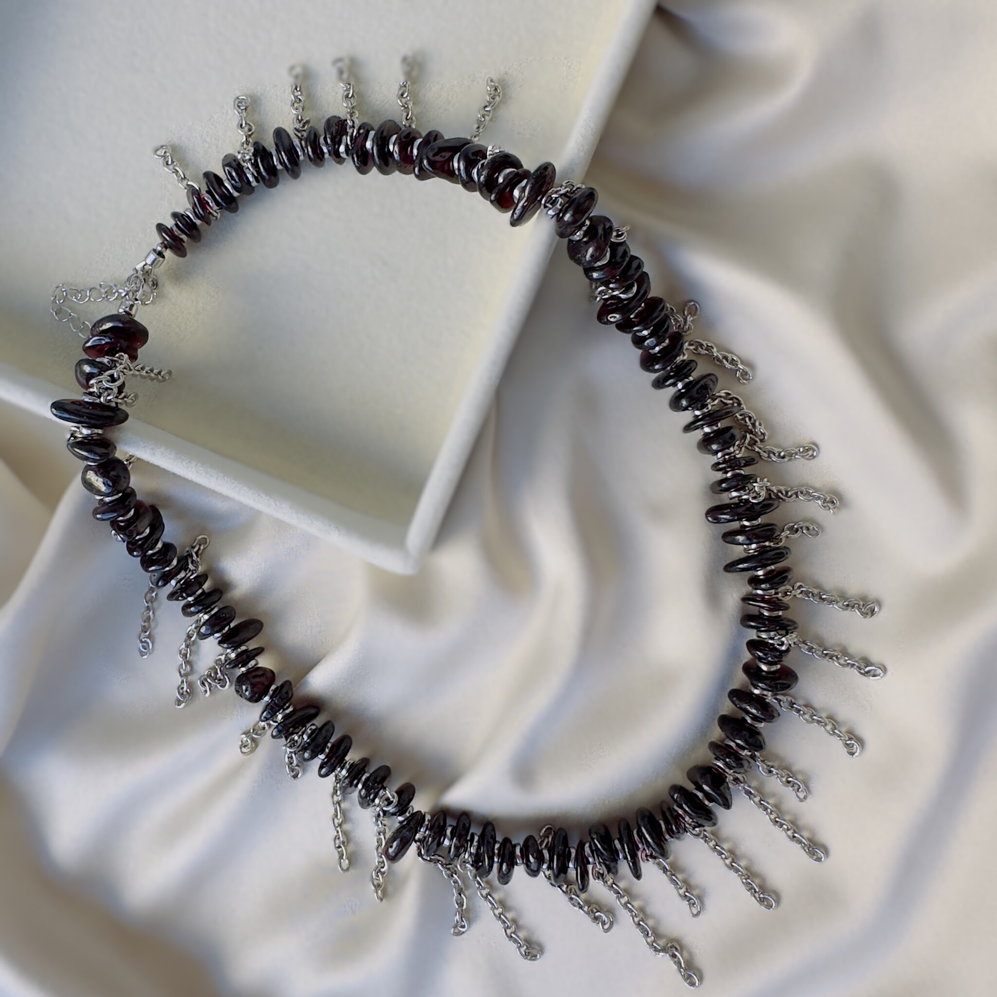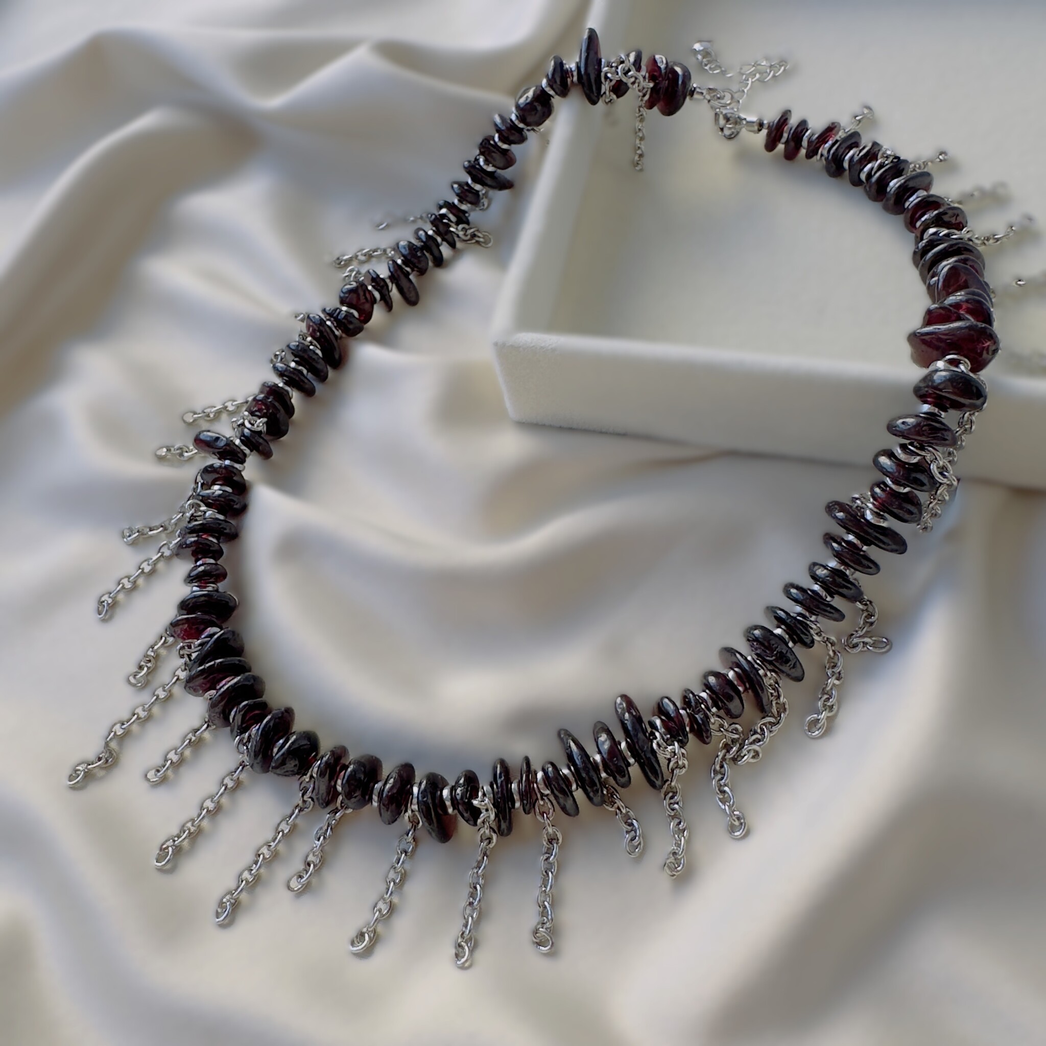 Стильное дизайнерское колье с цепочками и натуральным гранатом. Размер 40 см + 4 см на замочке цепочка для регулирования размера.