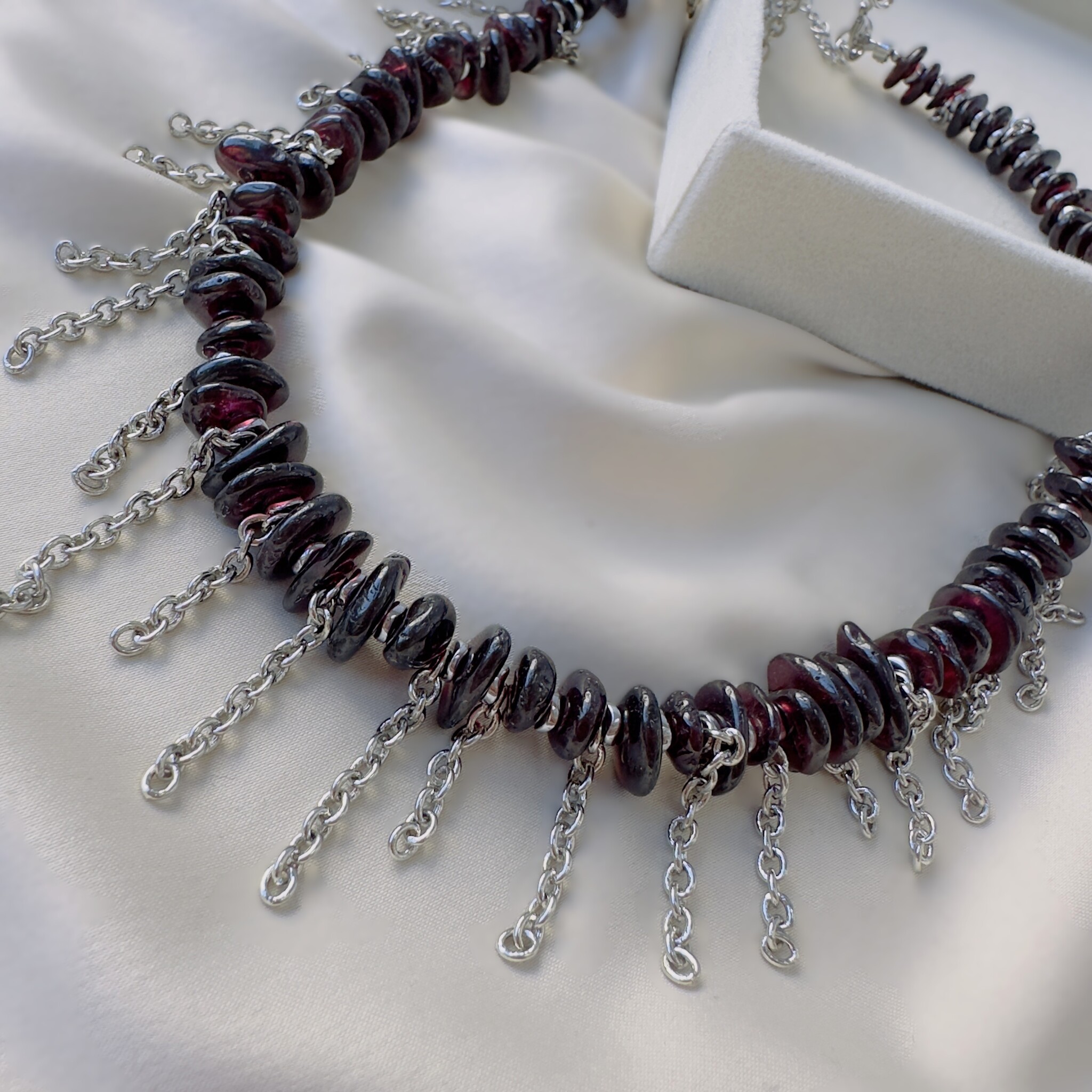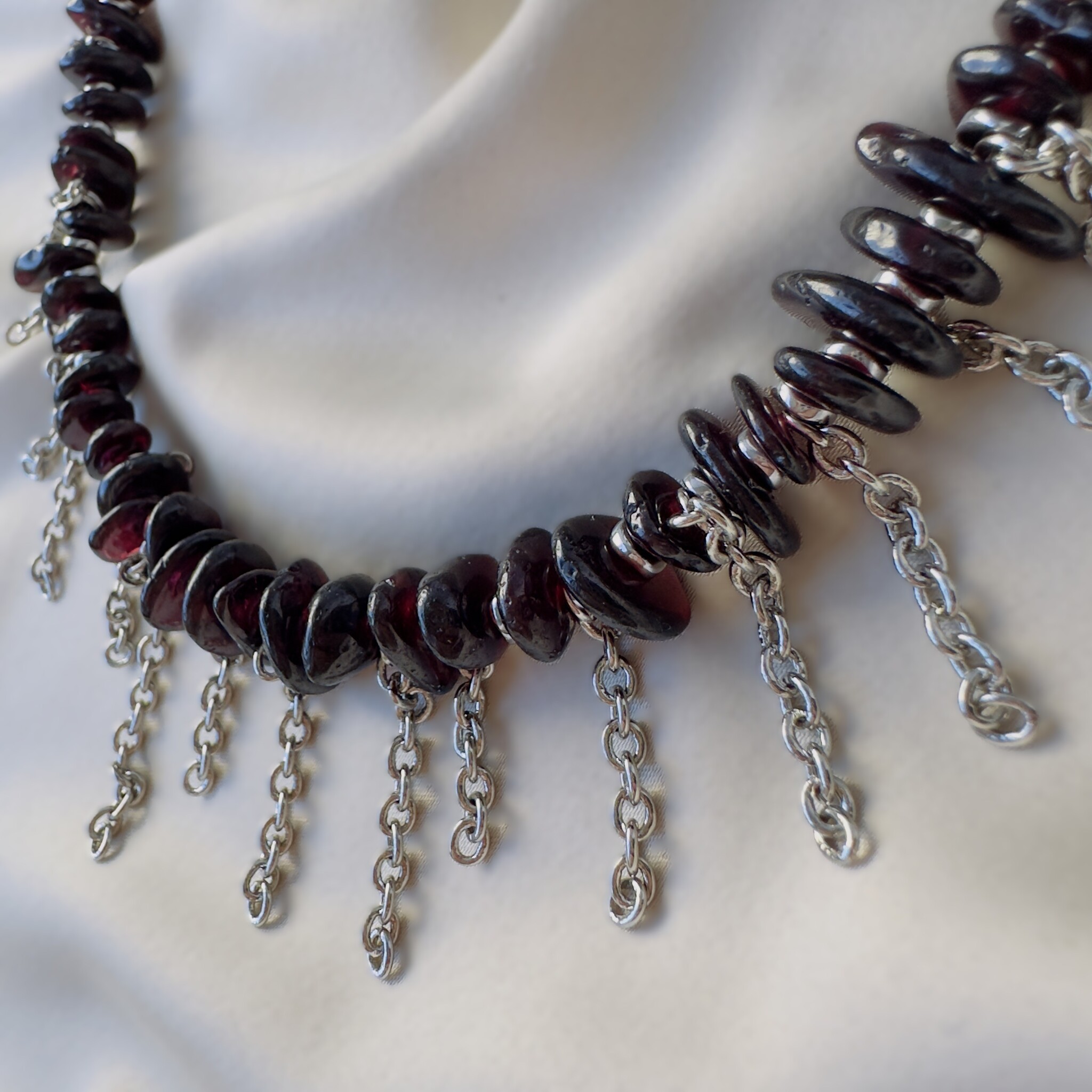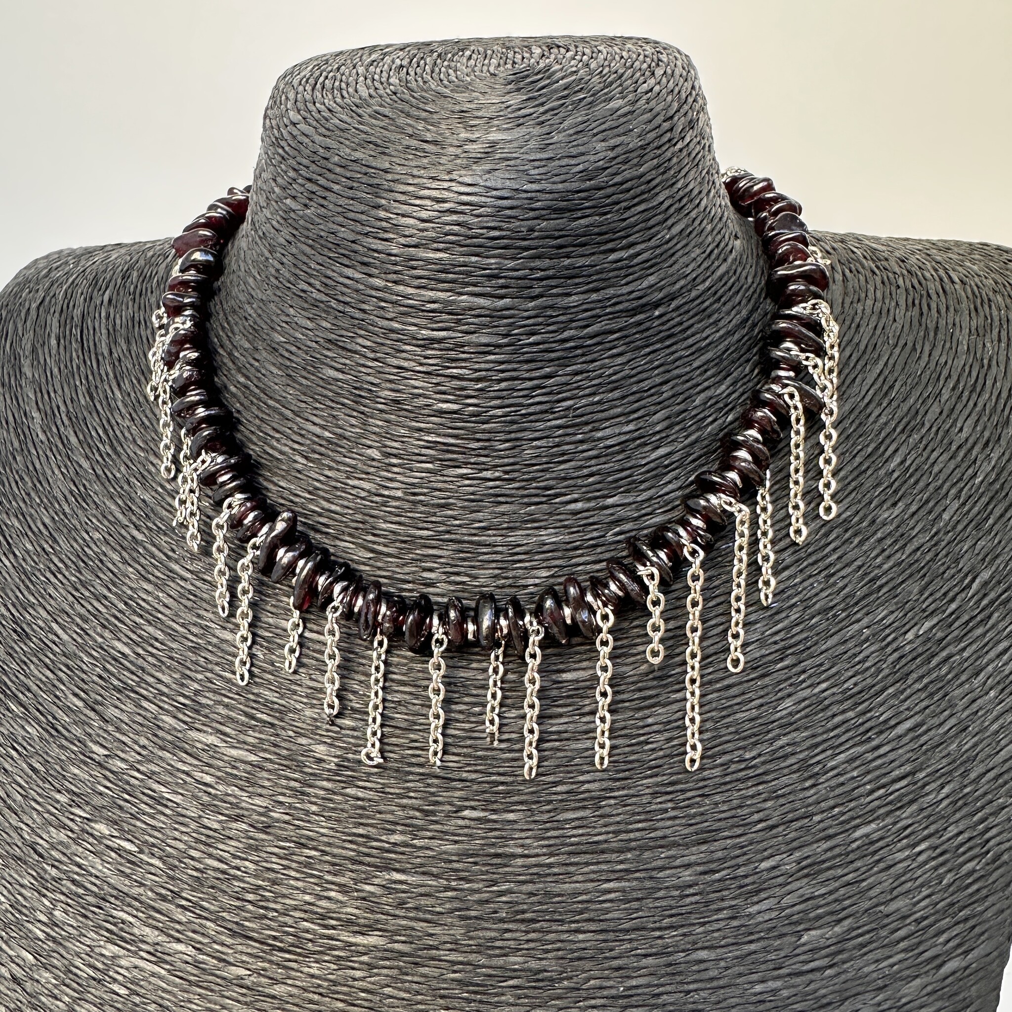 Стильное дизайнерское колье с цепочками и натуральным гранатом. Размер 40 см + 4 см на замочке цепочка для регулирования размера.