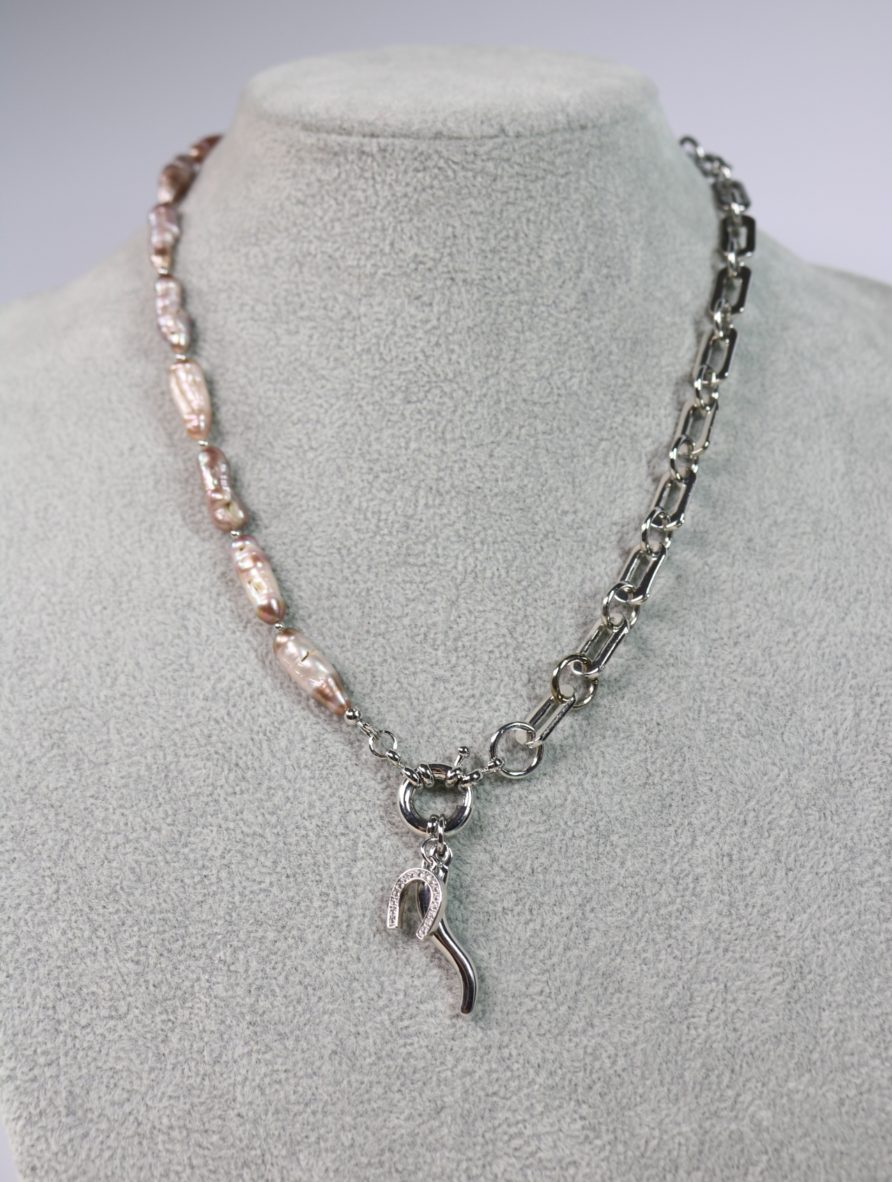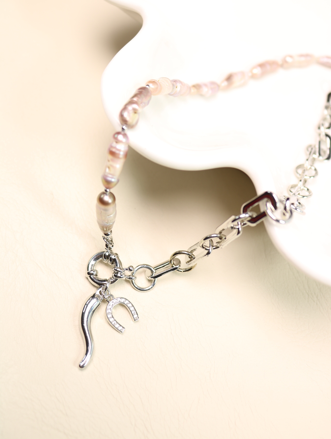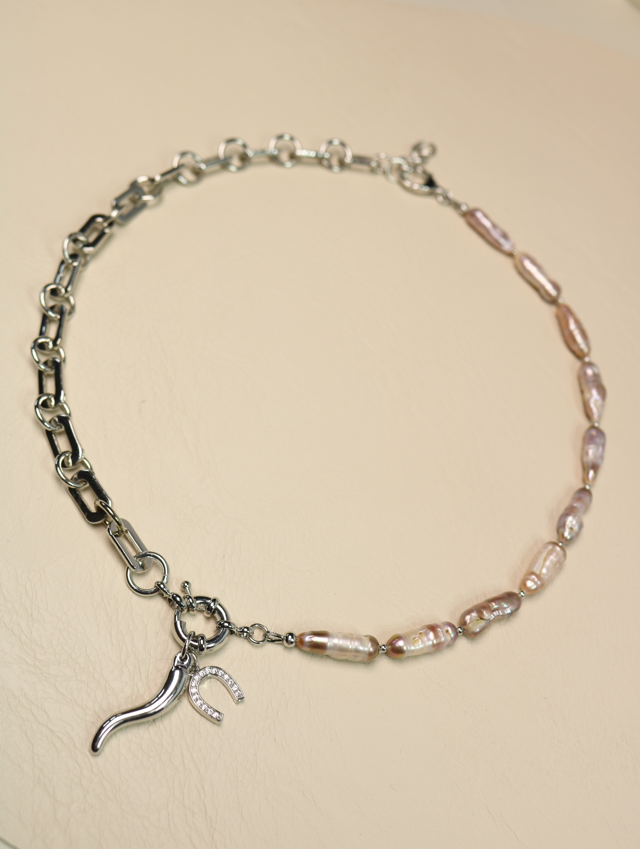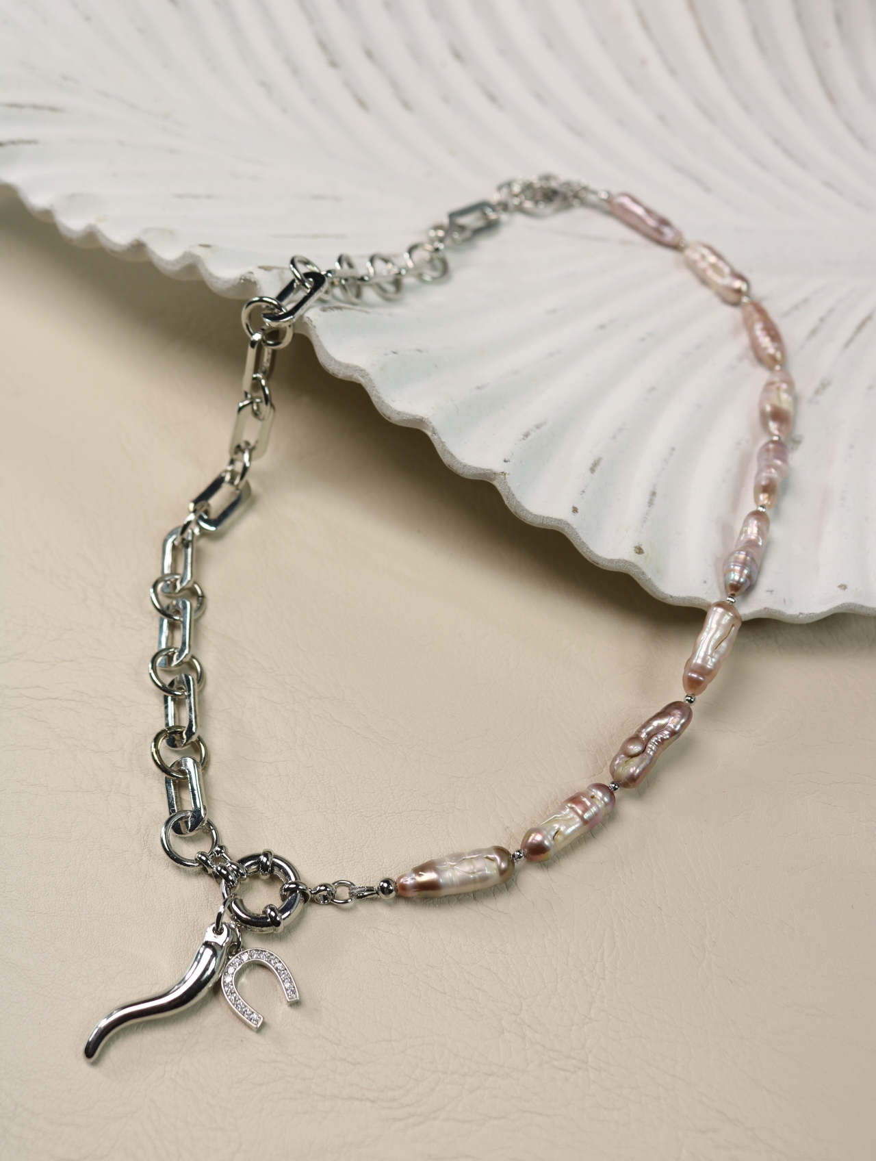 Асимметричное колье с барочным жемчугом и массивной цепью — тот случай, когда женственность и рок-настроение идут в одной упряжке. На одной стороне — нить из удлинённых барочных жемчужин нежного перламутрового оттенка, на другой — графичная металлическая цепь. В центре — кольцо с подвесками-талисманами: миниатюрная подкова и изящный «рог» на удачу.